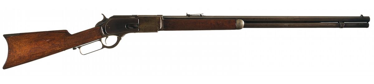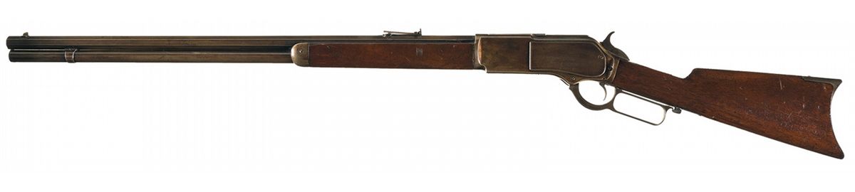 Manufactured in 1884, this is a Third Model with the dust cover guide rail integrally machined to the receiver. Blade front sight and adjustable folding rear sight graduated to 1,000 yards. The top of the barrel ahead of the rear sight is marked with the two-line address/King's Improvement patent dates and "CAL 45-60" at the breech. The upper tang is marked "MODEL 1876" flanked by fancy brackets. The serial number is on the lower tang and the cartridge elevator is marked "45-60". Mounted with a smooth walnut forearm with an iron forend cap and straight grip stock with a crescent buttplate with compartment (cleaning rod not included).