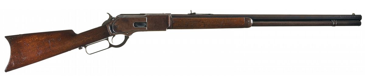 Manufactured in 1884, this is a Third Model with the dust cover guide rail integrally machined to the receiver. Blade front sight and adjustable buck horn rear sight. The top barrel flat ahead of the rear sight is marked with the two line address/King's Improvement patent dates and "CAL 40-60" at the breech. The upper tang is marked "{MODEL 1876}" flanked by fancy brackets, the serial number is on the lower tang and the cartridge elevator is marked "40-60". Mounted with a smooth walnut forearm with a steel end cap and straight grip stock with a crescent buttplate with compartment, (cleaning rod not included).
