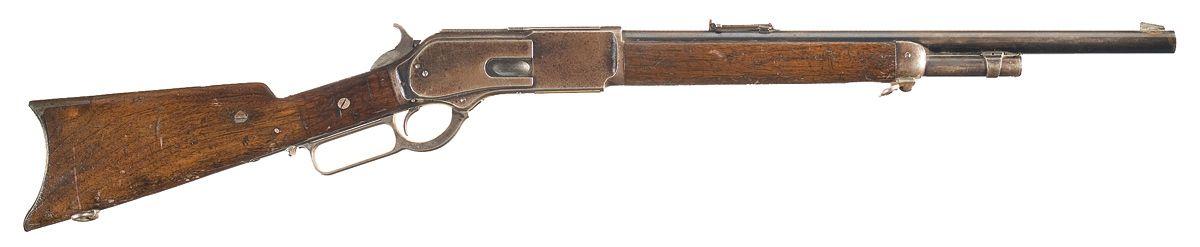 Second Model produced in 1881, shortened barrel and magazine, added front sight and sling swivels, ladder rear sight, crudely repaired buttstock.