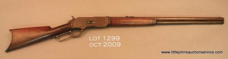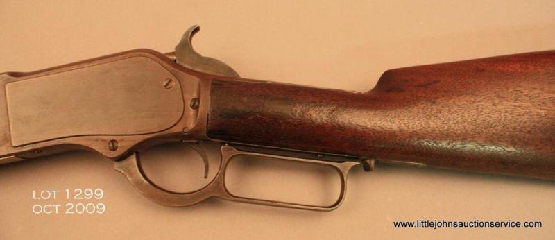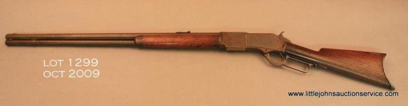 Winchester Model 1876 open top lever action rifle, 45-75 cal., 28” octagon barrel, #465. This gun is in overall good condition showing some slight restorations, brown finish, good action, good fore stock, butt stock has old repairs at wrist. Opentop ‘76’s are hard to find in any condition given their limited production. Est.: $6,000-$12,000.