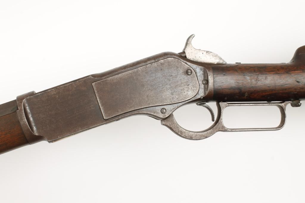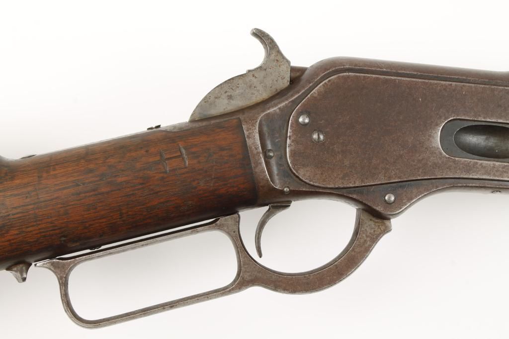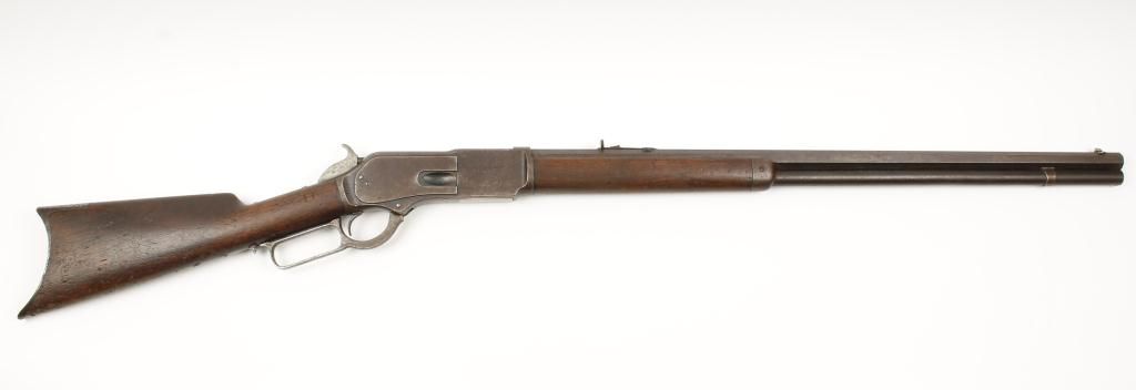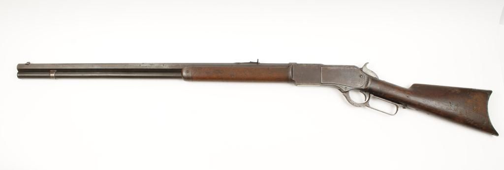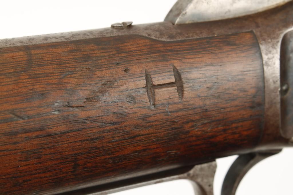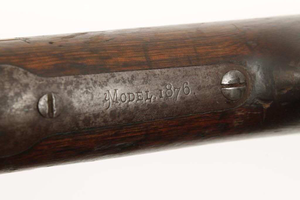 Winchester Model 1876 open top rifle in .45-75 caliber with 28” octagon barrel, full magazine, rifle butt, serial number 476. The rifle shows 30% to 50% original blue drifting to a patina with some scattered erosion andpinprick pitting. The barrel address is good and the 1876 markings on tang are also good. The wood shows some dings, mars, and scratches but is generally good overall. The rifle retains the early reinforced toe on the butt plate and early hammer. The stock is carved with two initials in block letters like a brand one is H and the other is M on reverse side of stock. The rifle shows original to the period sights in the correctpositions. The wood to metal fit is very good and the action works well. The bore is good and shows just normal use. A factory letter which is included confirms features and received in the warehouse September 18, 1877and shipped from the warehouse September 19, 1877 with 10 other model 1876’s to order number 9971. 3 digit early Winchester’s are always desirable and the open top is very hard to find as many were converted to dust
