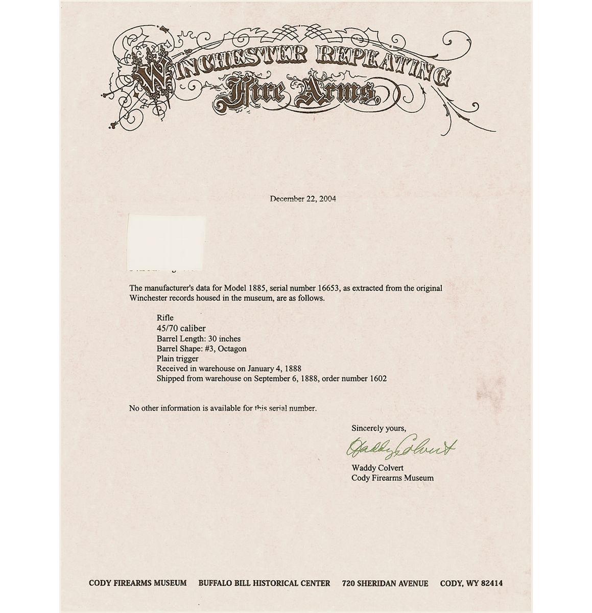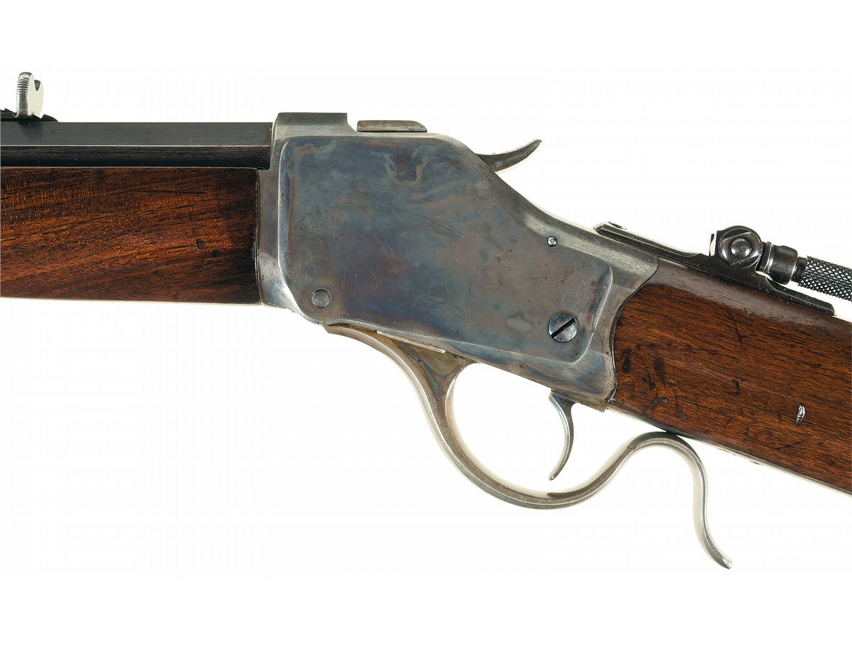 Manufactured in 1887. This rifle is fitted with a #3 octagon barrel chambered in the popular and desirable 45-70 caliber. The barrel is fitted with a blade front and adjustable buckhorn rear sights, and there is a short range tang mounted tang sight. The top barrel flat is marked with the two-line address ahead of the rear sight and "45-70" at the breech. The bottom flat is marked "3" ahead of the forearm. The serial number is marked on the lower tang. Blue barrel, casehardened remaining parts, and mounted with a smooth walnut forearm with an ebony forend insert and straight grip stock with a casehardened crescent buttplate. The accompanying factory letter verifies the rifle configuration, caliber, 30 inch octagon #3 barrel, plain trigger, that it was received in the warehouse on January 4, 1888 and shipped to order number 1602 on September 6, 1888.