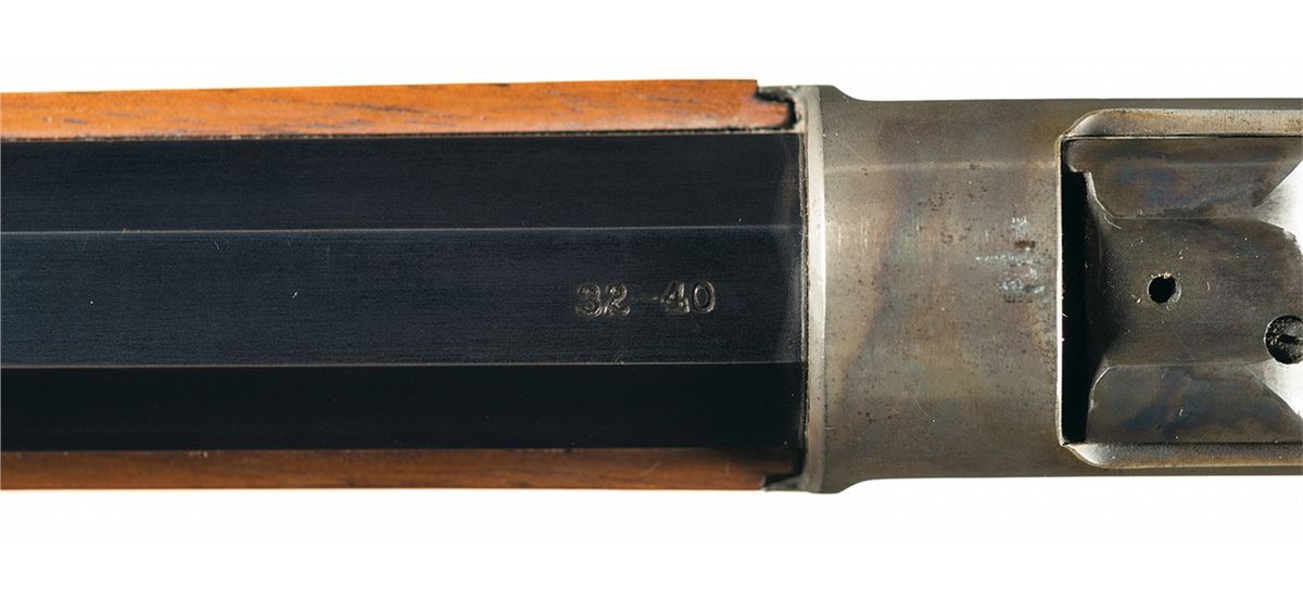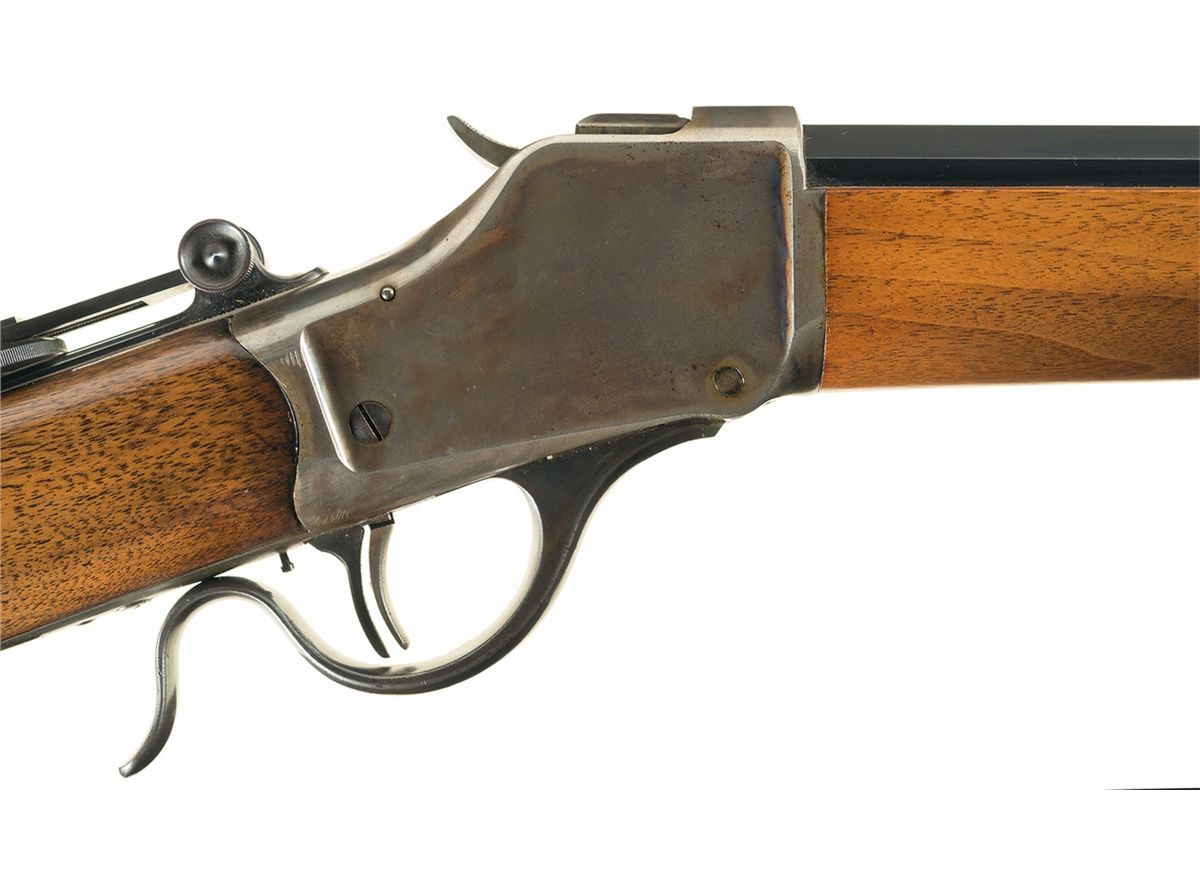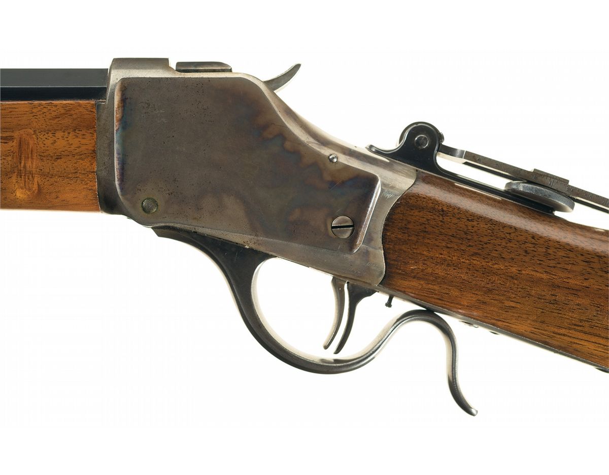 Very fine, 98% of the original blue finish remains with some high edge and handling wear along with a few scattered minor marks. The casehardened components retain much of the original case colors with some scattered minor scratches, dings and some minor freckles of oxidation. The refinished wood is fine with some scattered dings, scratches and areas of discoloration. Mechanically excellent. It is uncommon to find a Winchester Model 1885 single shot rifle with this much original blue and case colors!