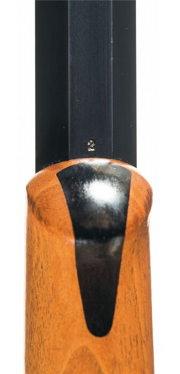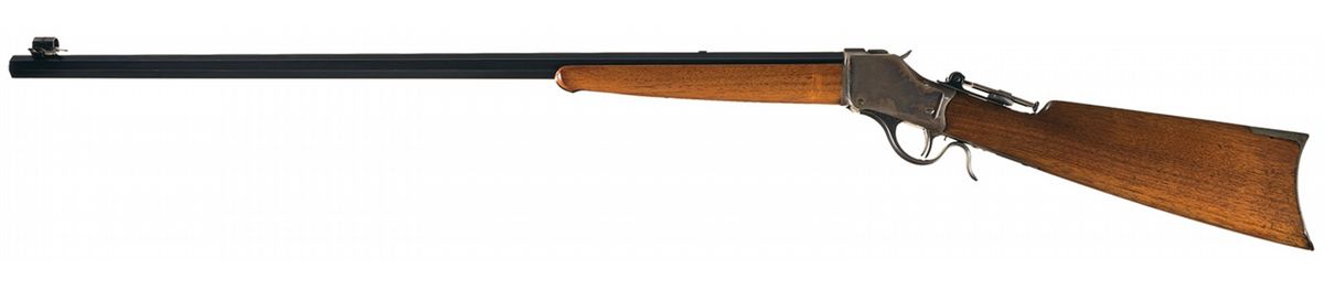 This attractive example was manufactured in 1895. The number "2" octagon barrel has two-line barrel address and patent dates, a windage adjustable Globe front sight and the rear sight dovetail has a filler block installed. There is a mid range Vernier peep sight installed on the top tang. Fitted with a close coupled set trigger. Mounted on a smooth walnut forearm with contrasting ebony inlay and Schnabel tip and a straight grip walnut stock with crescent steel buttplate.