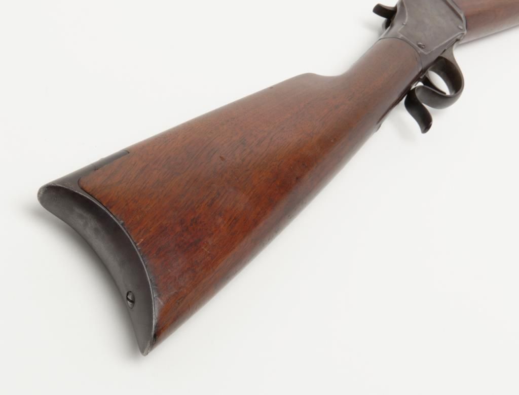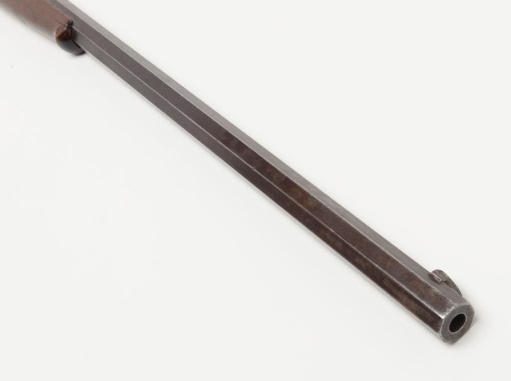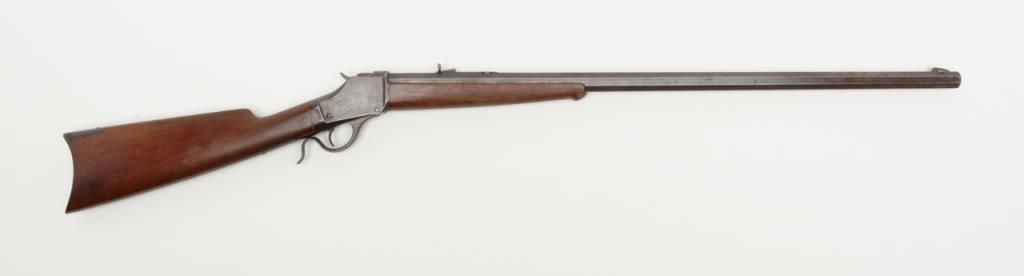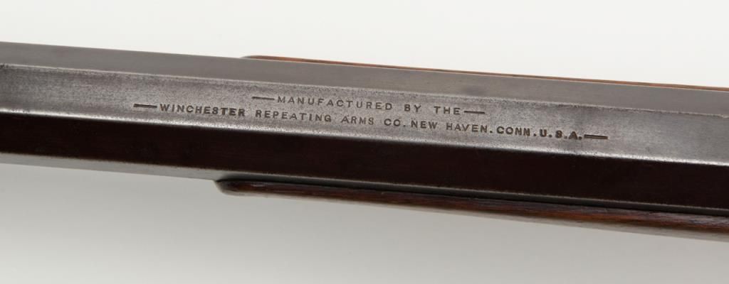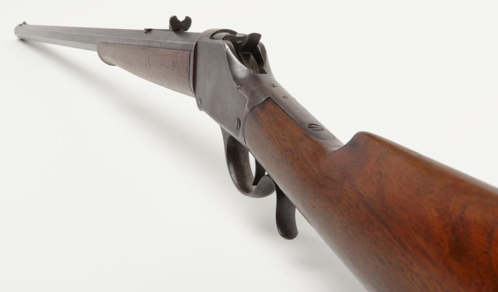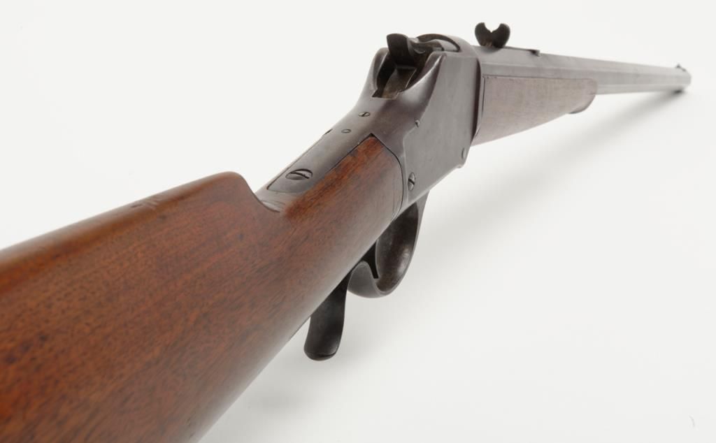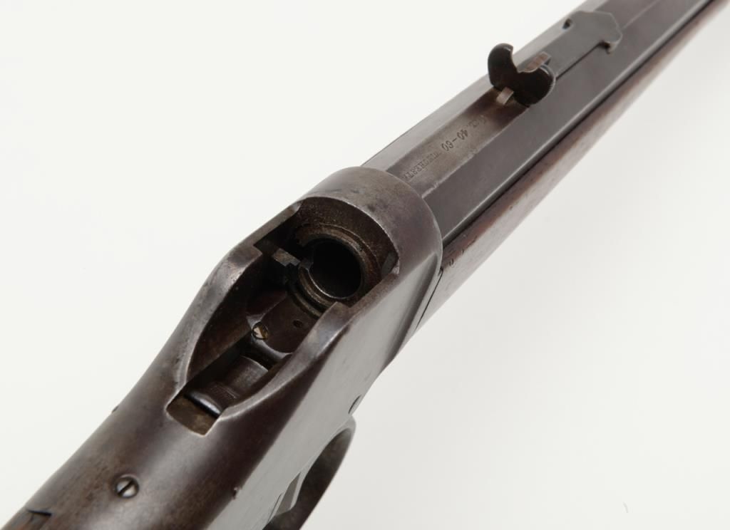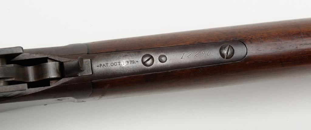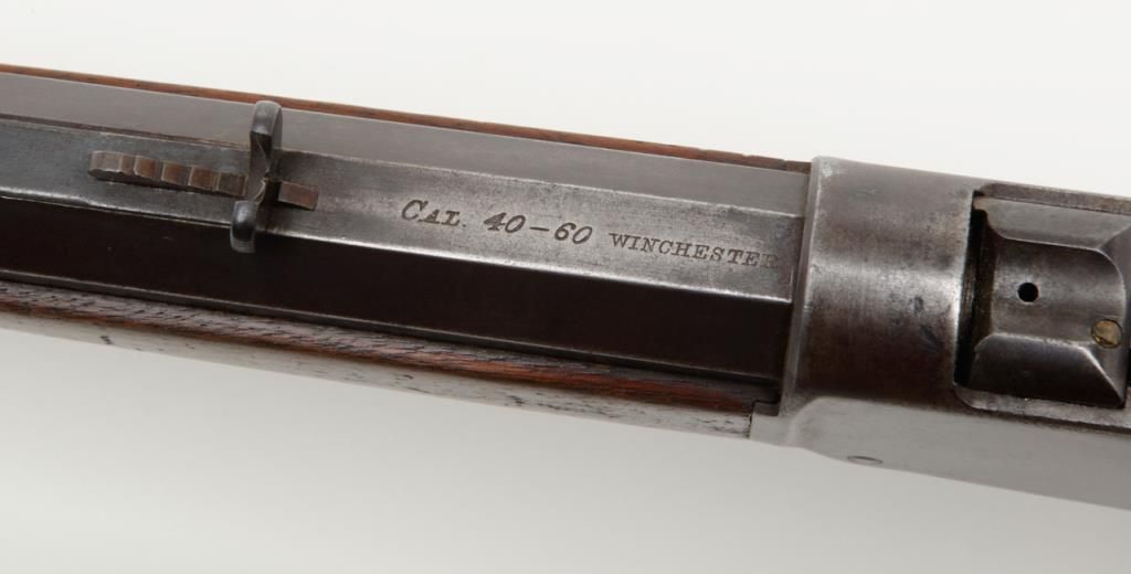 Winchester Model 1885 High Wall lever action single shot rifle, breech end of barrel marked “Cal 40-60 WINCHESTER”, 30” heavy octagon barrel, blue finish, wood stocks with ebony insert in front of forend, #12290; overall very goodcondition showing pleasing brown patina to metal surfaces with some silver toning, strong rifling in bore, crisp action, very good markings and very good butt stock; forend shows an old crack of approx. 1” on the right side at the front and some scattered mars from storage; a nice long barreled High Wall. (Antique). Est.: $1,500-$3,000.
