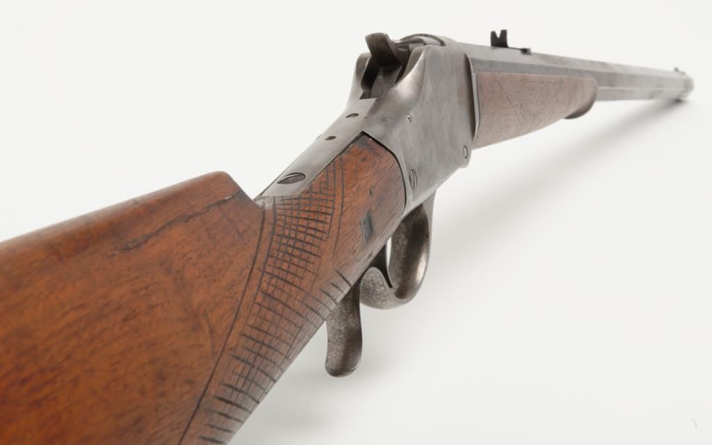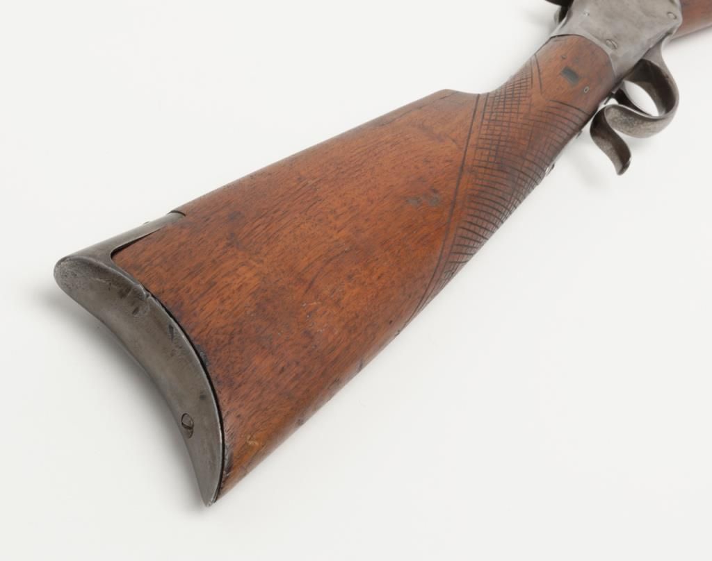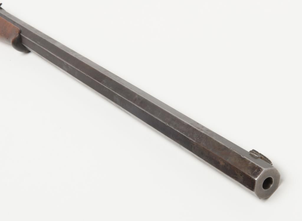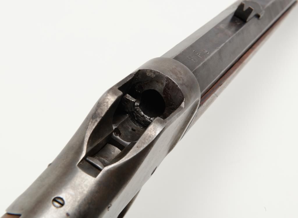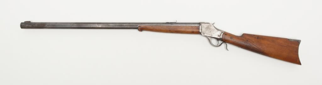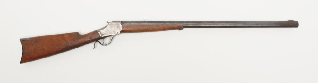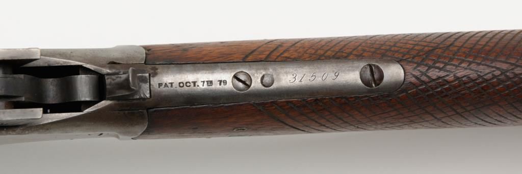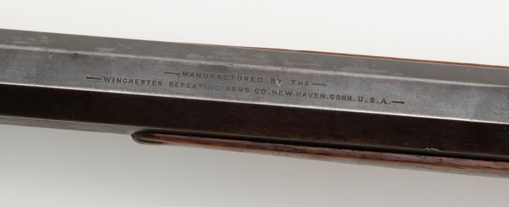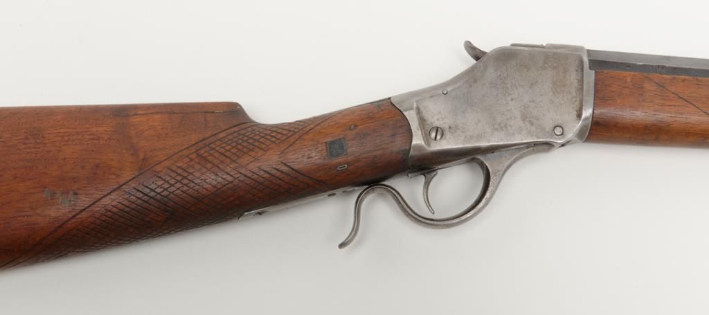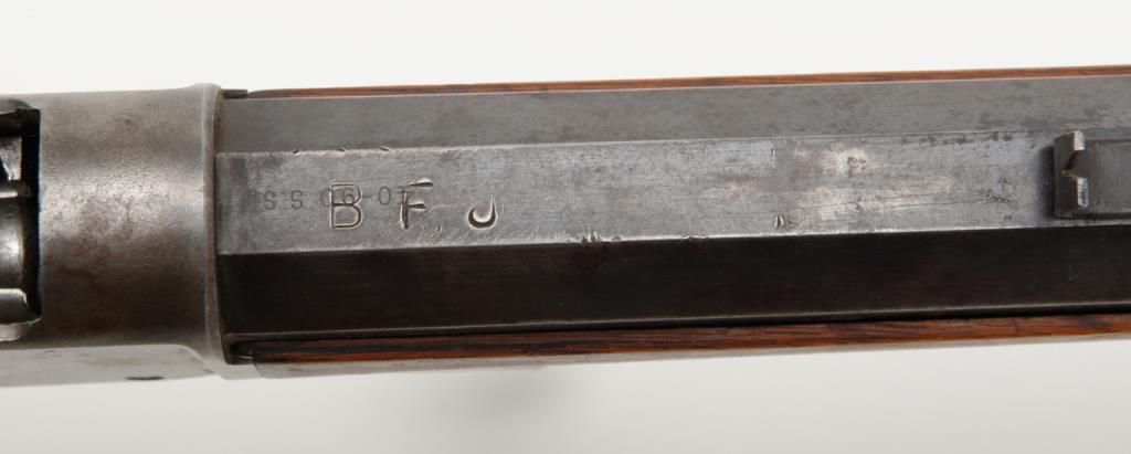 Winchester Model 1885 High Wall single shot lever action rifle, .40-90 SS cal. (Sharps Straight), 30” heavy octagon barrel with “B.F.J.” stamped on top flat of barrel at breech with hand held stamps, blue finish, hand checkered wood stocks,#31509 in overall good to very good condition showing dark patina on barrel mixed with areas of original blue; grey patina to receiver, very good bore with strong rifling, crisp action, good markings, stocks are overall good with wear tocheckering, evidence of a bolt or screw through the wrist area with old filler and several old brads in the same area (evidence of an old crack on the left side of the butt stock just below the comb; old modification to the rear sight and oldreplaced blade in the front sight base. (Antique). Est.: $1,400-$2,800.