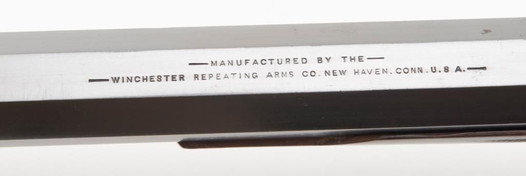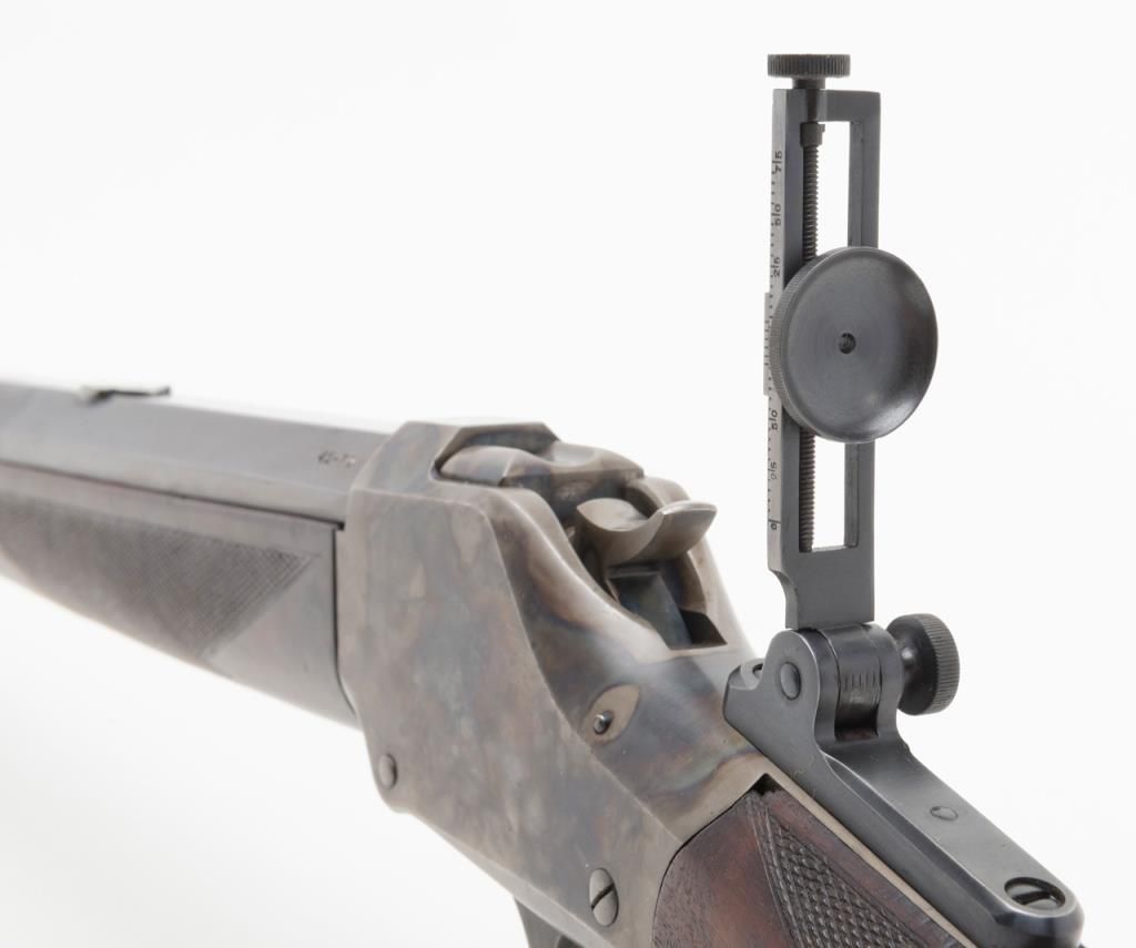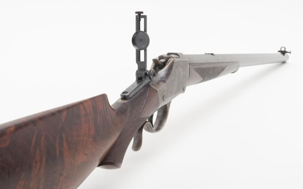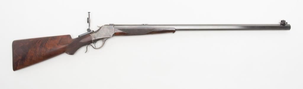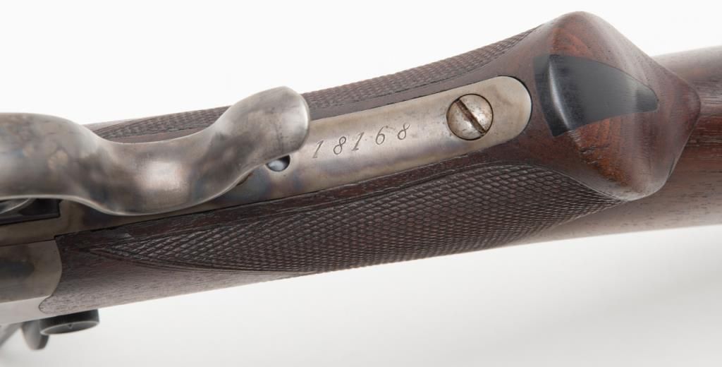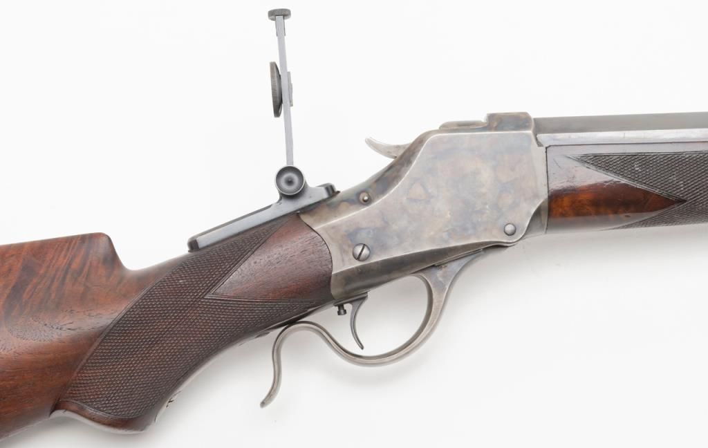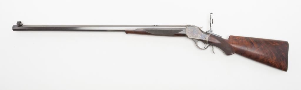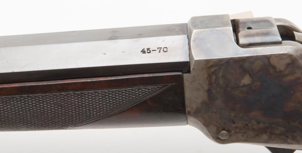 Winchester Model 1885 High Wall single shot rifle, .45-70 cal., 30” #4 heavy octagon barrel, blue and case hardened finish, checkered deluxe wood stocks, single set trigger, #18168 in overall fine condition showing the majority of its blue finish on the barrel that displays the factory PW in circle mark on top flat at breech and VP in oval on bottom barrel flat under forend; majority of case colors remain on receiver; fine bore, crisp action, set trigger not working at time ofdescription, sharp markings, beautifully grained wood in very good to fine condition with a chip loss to the left front rail of the forend and minor old mars from carry and storage; checkered hard rubber butt plate. A beautiful high wall ina great caliber. (Antique). Est.: $3,000-$6,000.