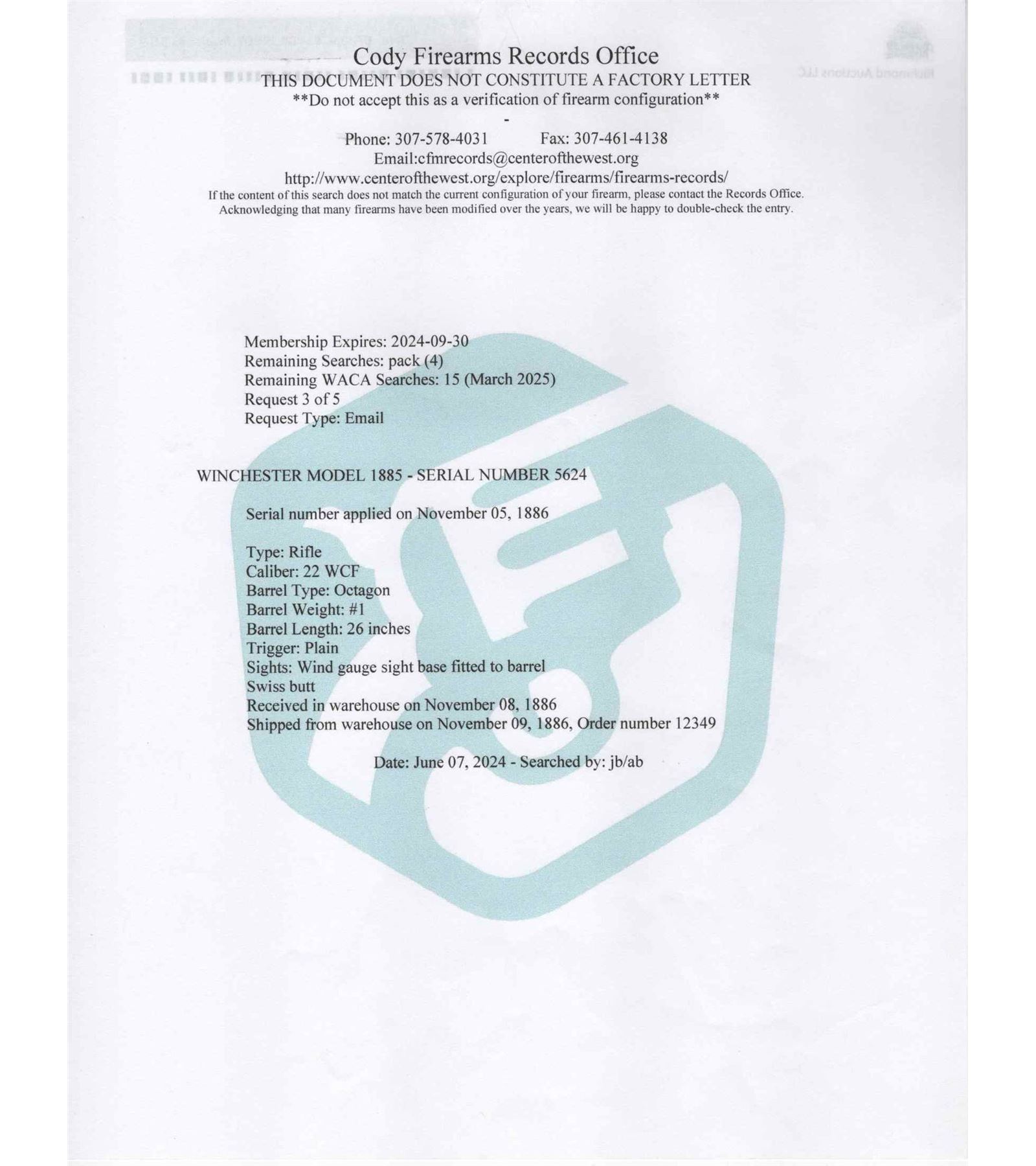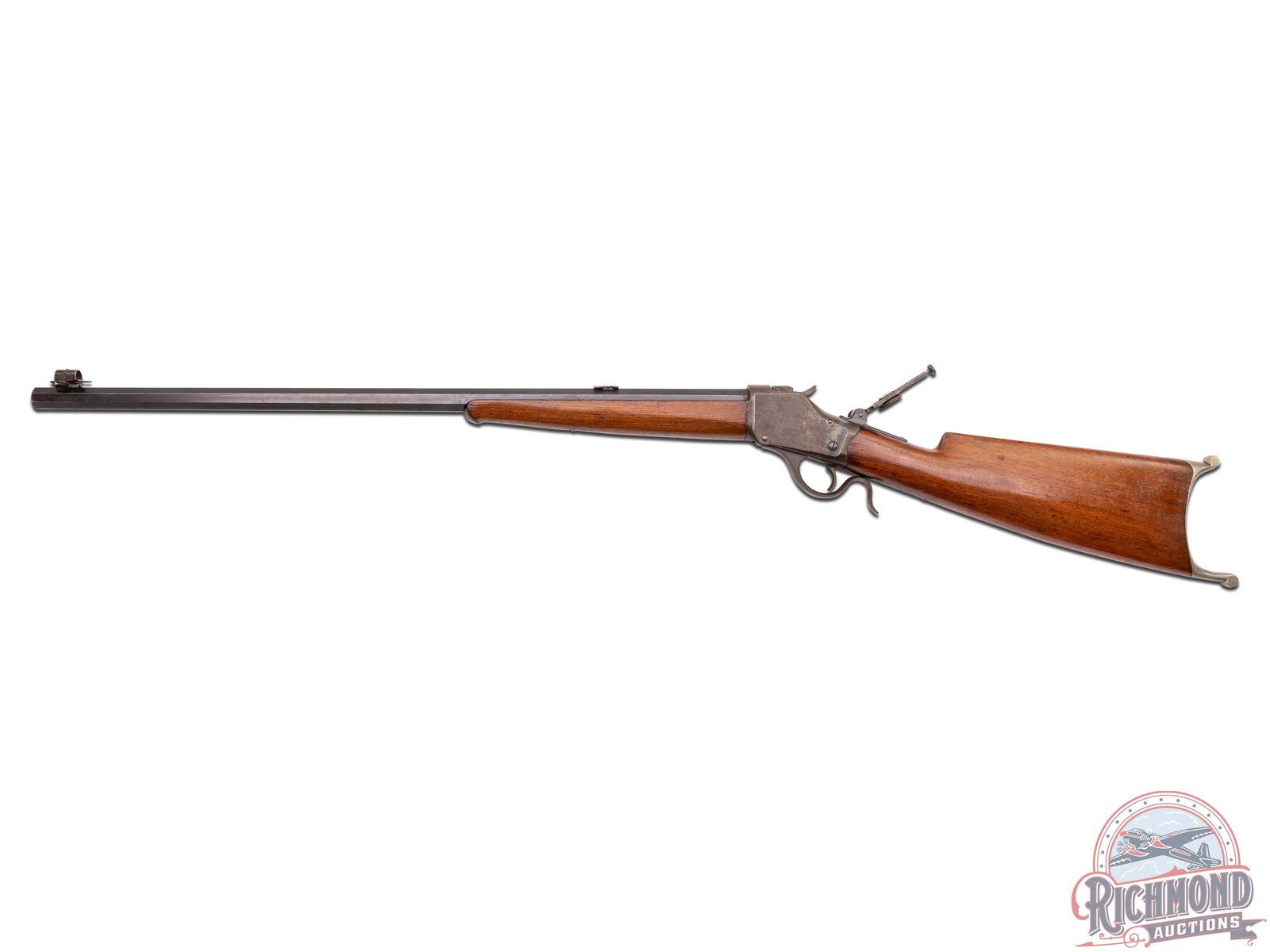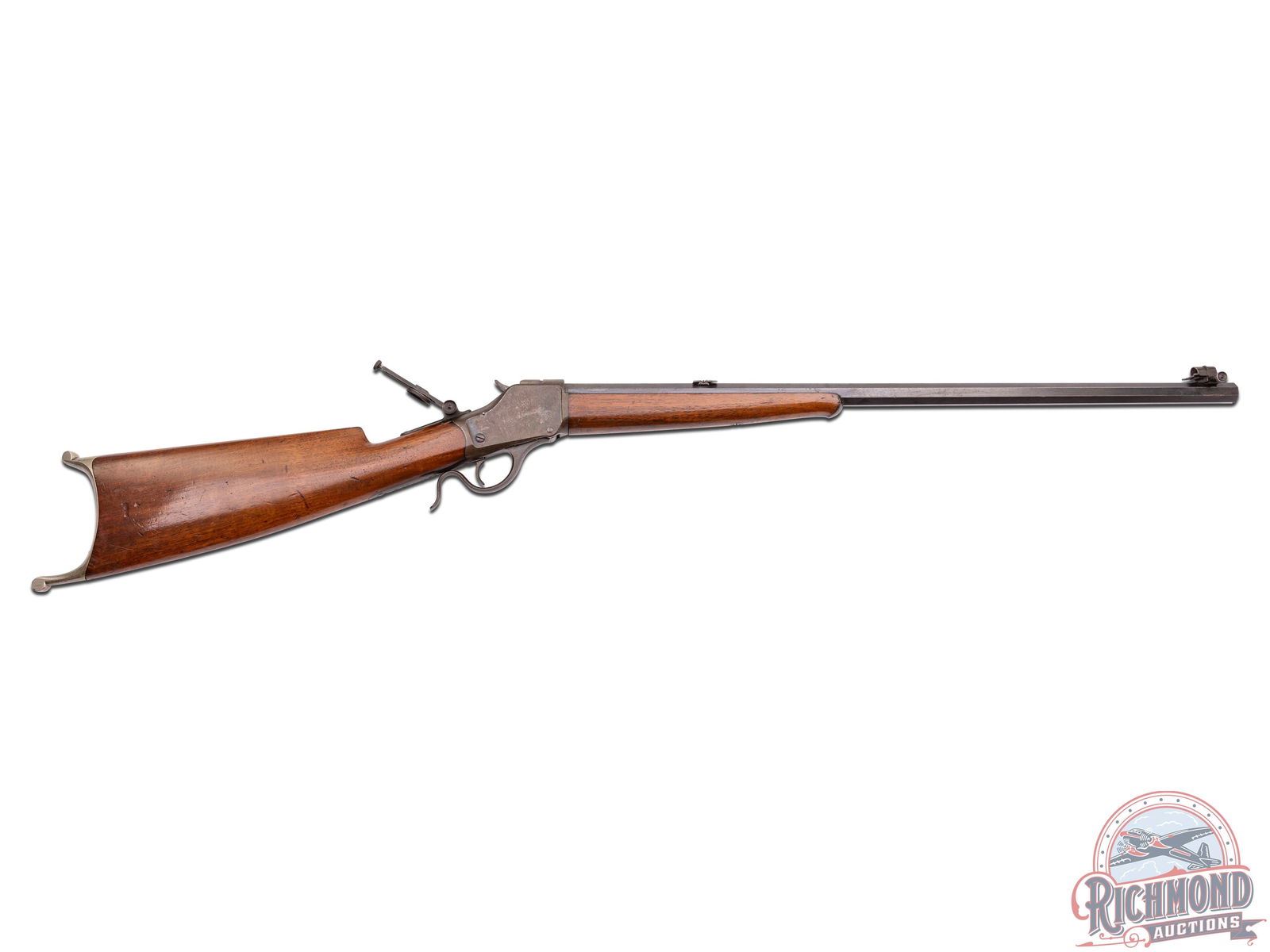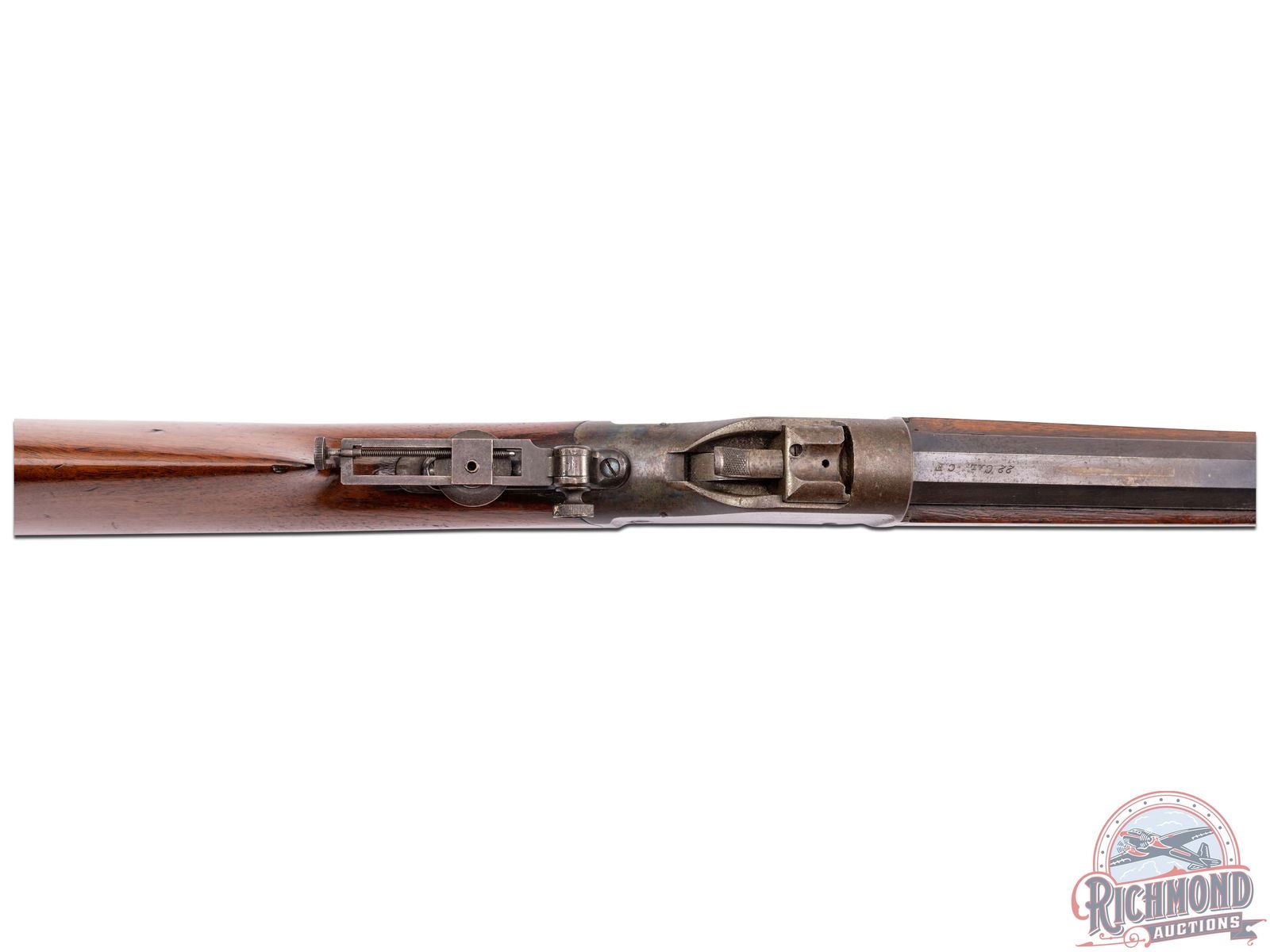 Made by Winchester Repeating Arms in 1886. 26" blued full octagon No. 1 weight barrel in 22 Winchester Centerfire caliber with Winchester two line address, and factory Wind gage front sight with two leaf lay down rear and tang Vernier sight. Case-hardened thin side action with plain trigger and standard lever. Plain standard walnut stocks with special order Swiss butt plate. Cody research confirms all options. J.T. Livengood Collection. CALIBER: 22 W.C.F. S/N: 5624. FFL STATUS: Antique.