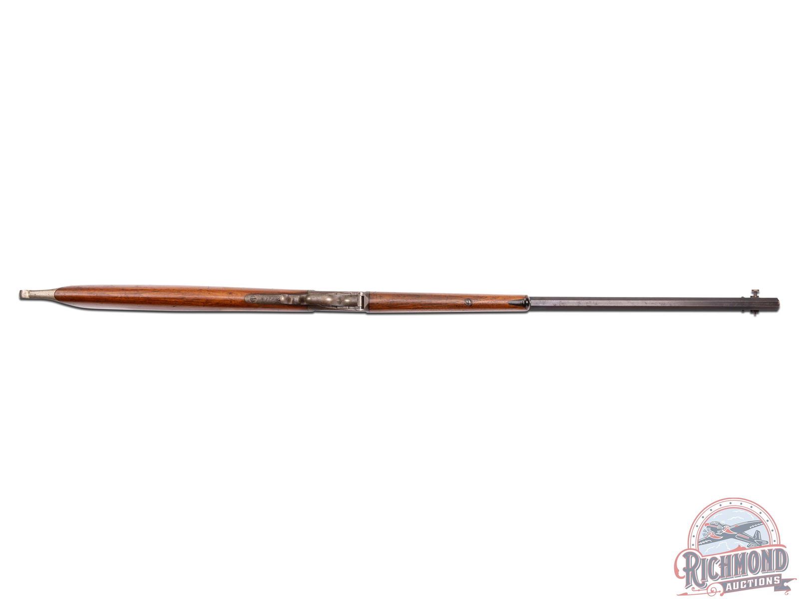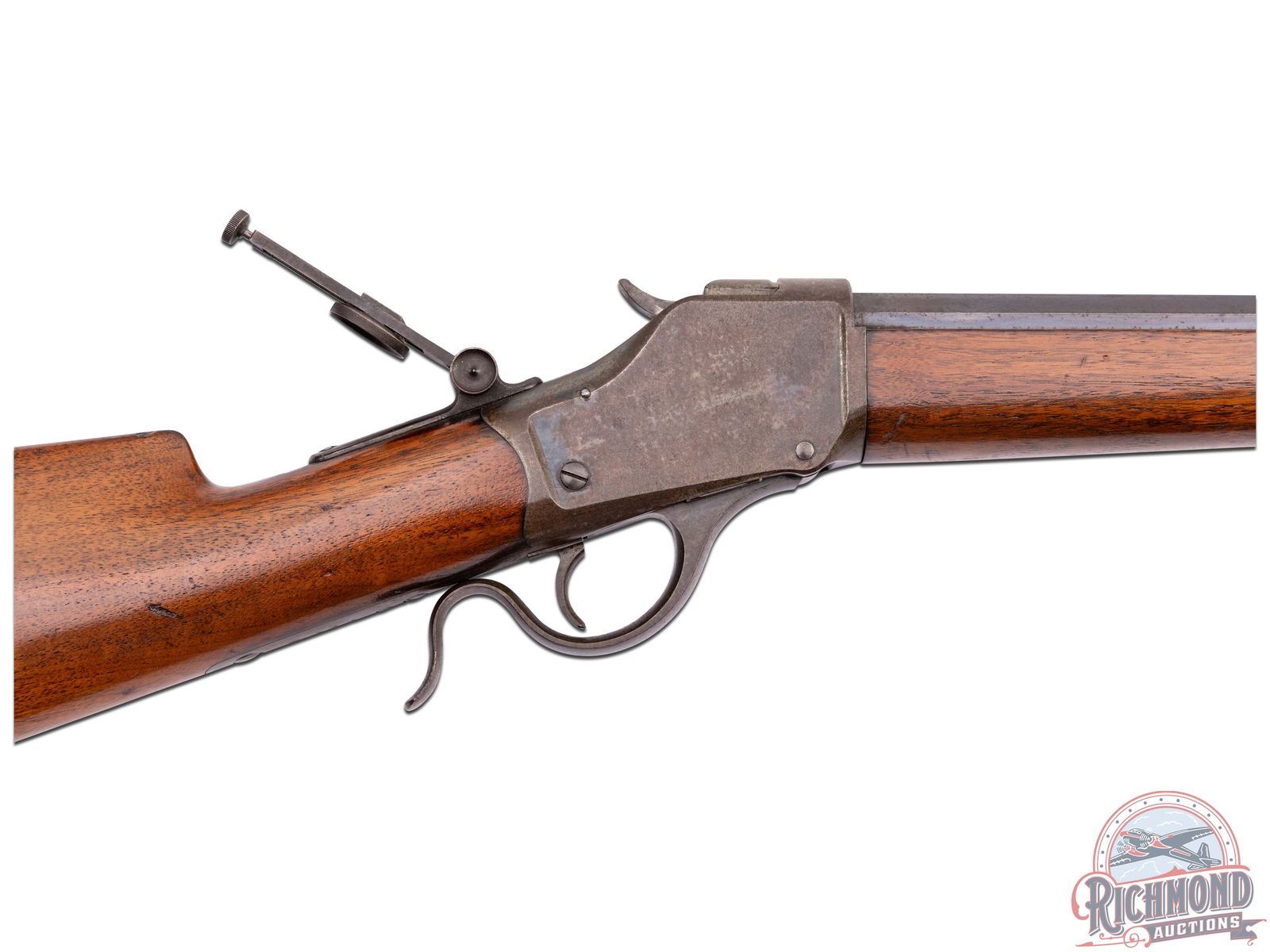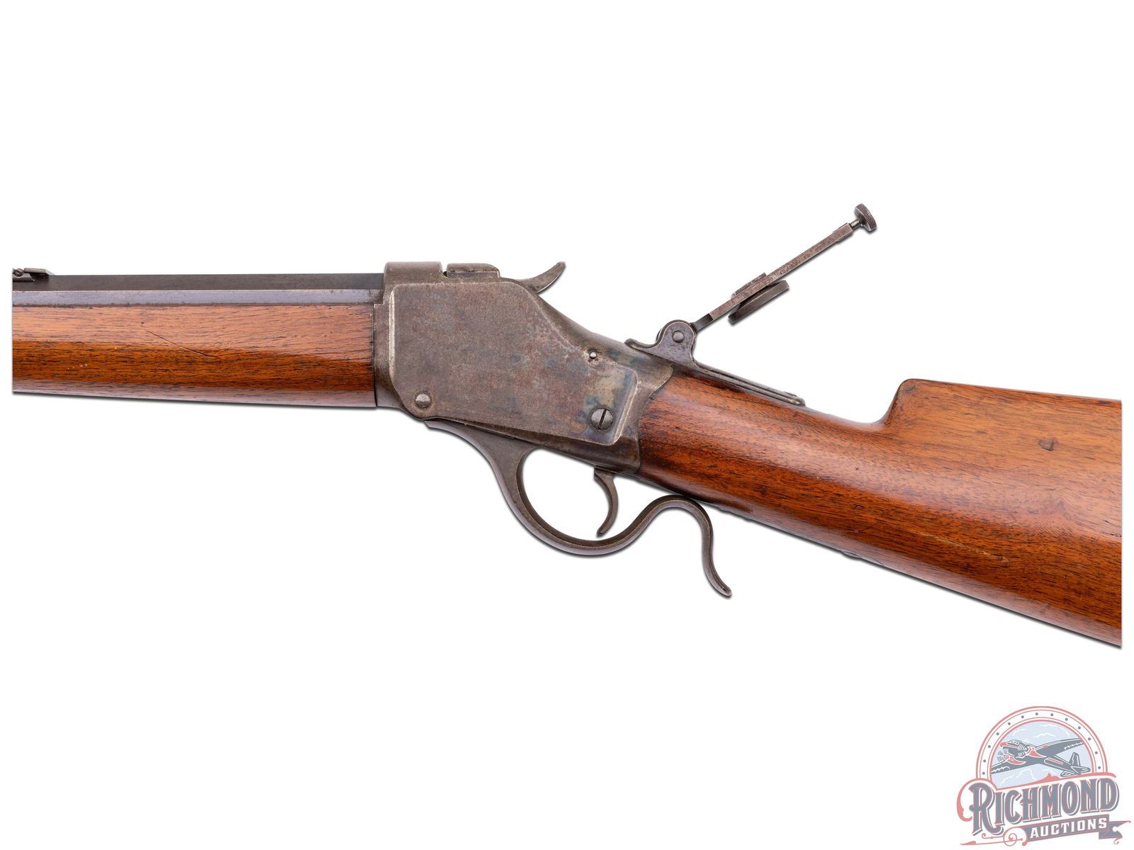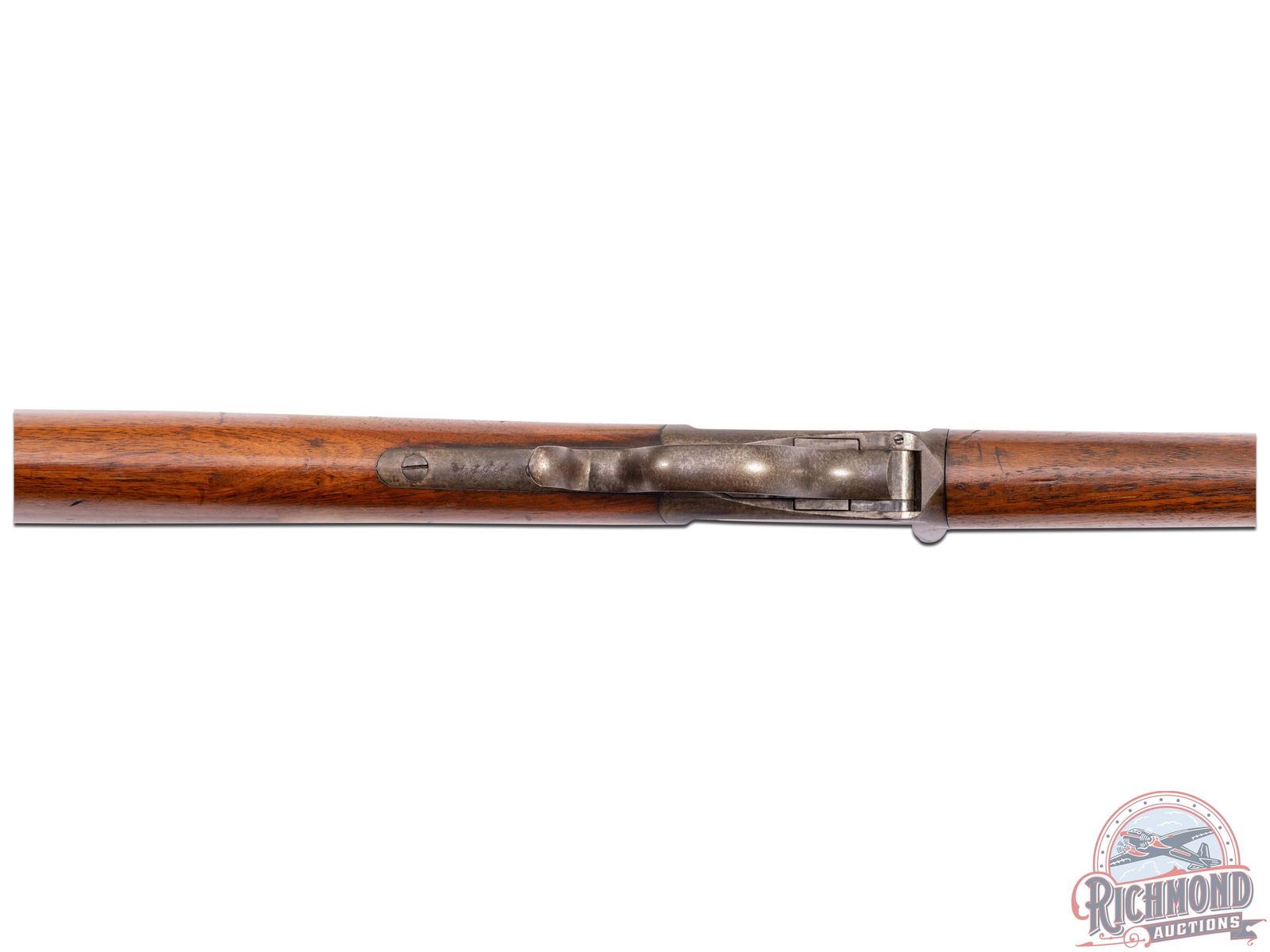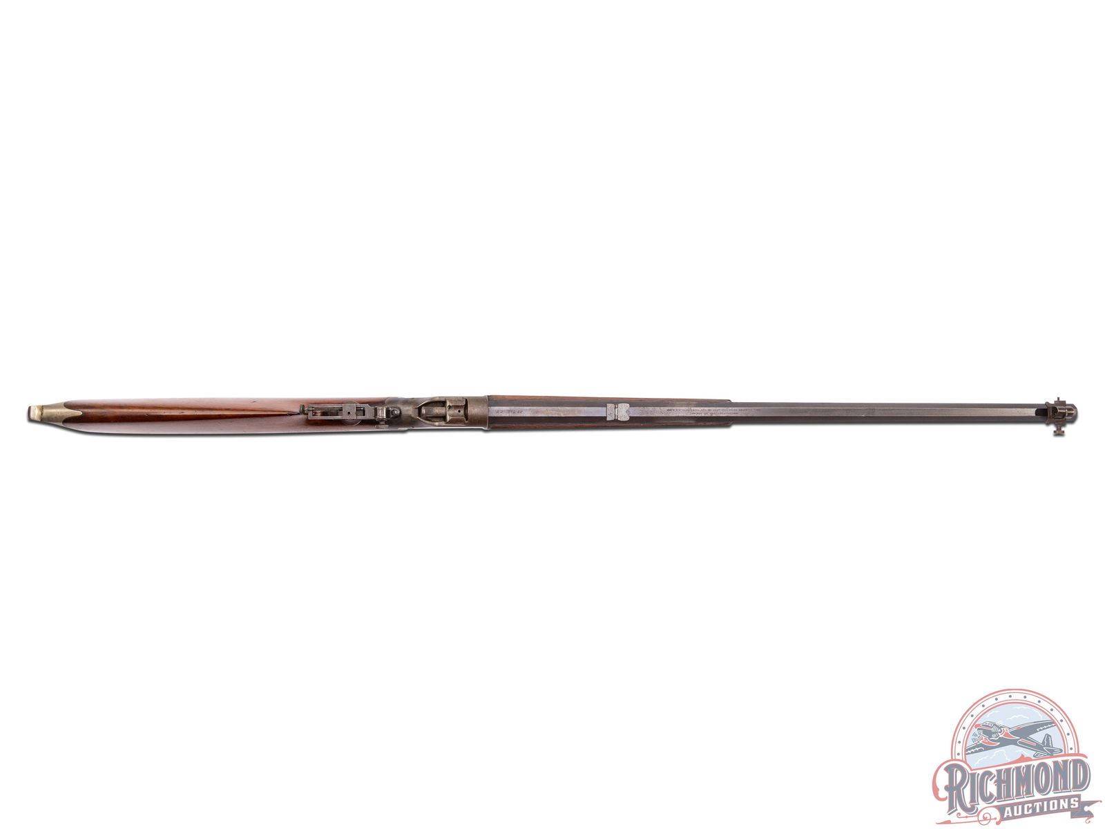 Made by Winchester Repeating Arms in 1886. 26" blued full octagon No. 1 weight barrel in 22 Winchester Centerfire caliber with Winchester two line address, and factory Wind gage front sight with two leaf lay down rear and tang Vernier sight. Case-hardened thin side action with plain trigger and standard lever. Plain standard walnut stocks with special order Swiss butt plate. Cody research confirms all options. J.T. Livengood Collection. CALIBER: 22 W.C.F. S/N: 5624. FFL STATUS: Antique.