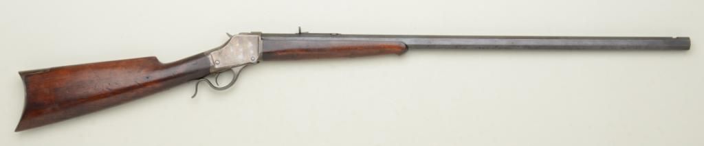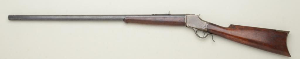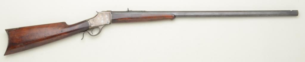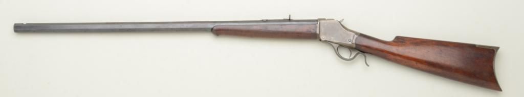 Winchester Model 1885 high wall single shot rifle, .32-40 cal., 30” octagon barrel, blue and case hardened finish, wood stocks, #56229. This gun is in overall very good to fine condition showing approx. 70% originalblue on barrel and scattered traces of original case colors on the receiver with the balance gone to a silvery tone, very good to fine bore, crisp action, very good markings, very good + wood stocks with scattered oldmars and scratches from storage; front sight missing. Est.: $750-$1,500.