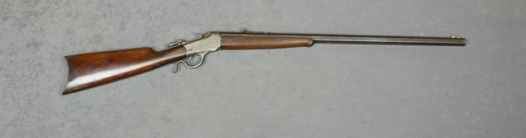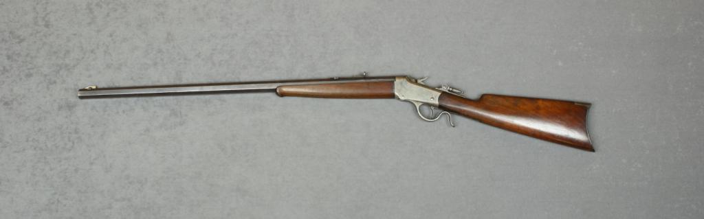Winchester Model 1885 low wall single shot rifle, .32 WCF cal., 28” octagon barrel, blue and case hardened finish, wood stocks, #67479. This gun is in overall very good to fine condition showing approx. 80% originalmuted blue finish on barrel and traces of original case color on the receiver; good bore, action, markings and very good wood stocks; adjustable Lyman-type tang sight. Est.: $400-$800.