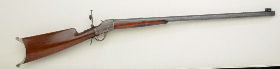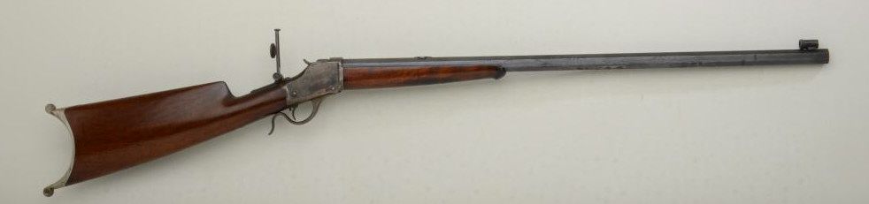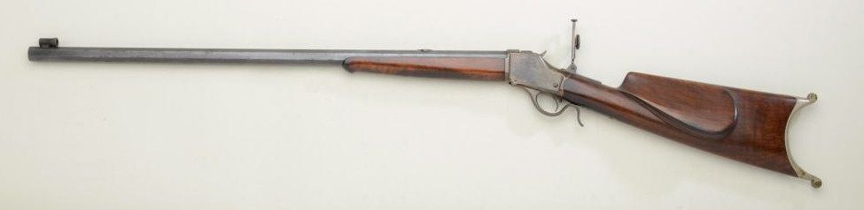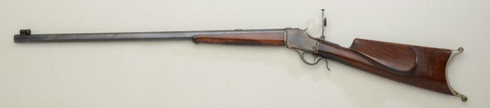 Winchester Model 1885 special order single shot High Wall rifle, .38-55 cal., 30" octagon barrel, #3 weight, blue and case hardened finish, select walnut stock with Monte Carlo cheek piece on left side, andnickel plated Swiss style butt plate; single set trigger, windage and elevation adjustable tang sight, target type front sight of later vintage in front dovetail; there is a blank in the rear sight dovetail. The gun numbers14078; the barrel shows 85-95% original blue, some just beginning erosion and pinprick pitting in a few small areas at the edges, with crisp markings and some very bright blue. The frame shows 60-80% case hardeningwith some browning, toning, but still strong areas of rainbow colors. The stocks are very good+ with just some slight handling marks, most of their varnish, and at least 1X, possibly 2X. The action is tight, themarkings are sharp, the bore is bright and near excellent. From a prominent northwest Winchester collection. Note: Collector's tag denotes letter but not available at time of cataloging. In our opinion, all the