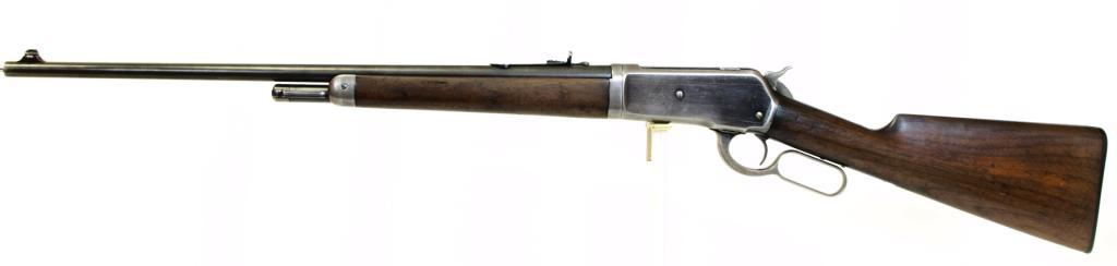 lever action take down rifle with 24" round barrel and half mag. Rifle remains in good overall condition with barrel showing blue turning to plum, approx. 25% bright blue remaining to the receiver, the remainder a silver gray beginning to drift to brown. Original stock shows no repair and original finish, original shotgun butt plate intact. Good action with good bore. Manufactured 1901, FFL required.1