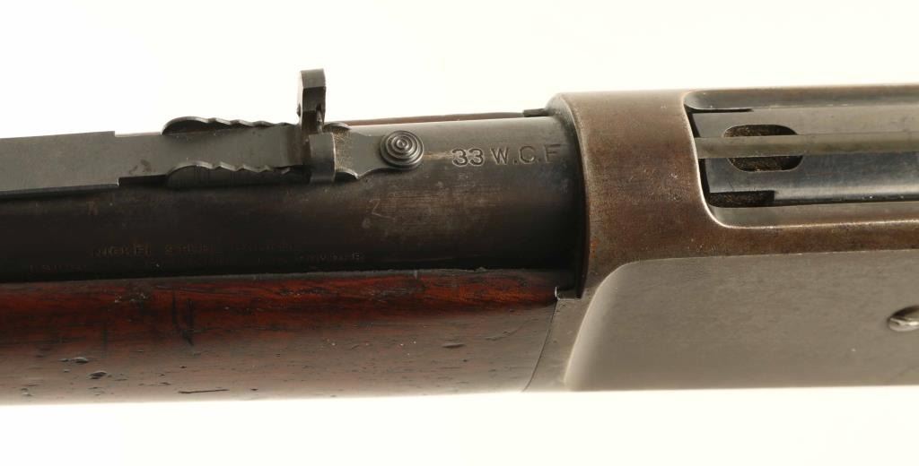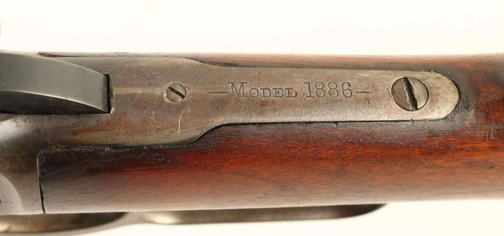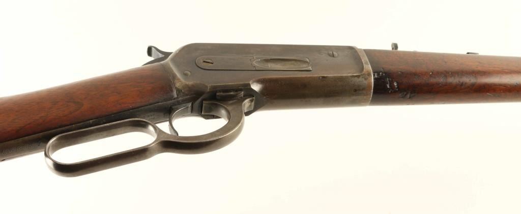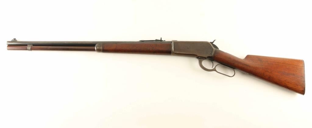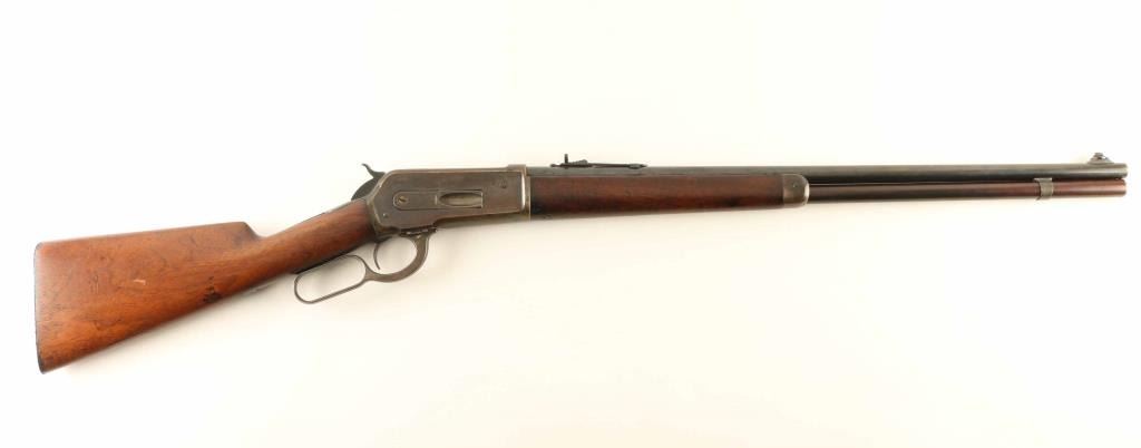 'Extra Lightweight Rifle' manufactured circa 1903. Features 24" round barrel (marked 'nickel steel'), full length magazine tube, buckhorn sights (rear sight marked "MARBLES"), straight wrist, shotgun butt with checkered steel buttplate. Bore is good to very good condition, slightly frosted, overall bright with sharp rifling. Barrel retains 65% blue with patches of thinning and color change to gray. Magazine tube is mostly plum colored blue, with darker color on right side. Action is brownish gray color, thinning or with bare metal on high spots and sharp edges, scratches to sides. Screw slots show slight marring. Forend is good condition, with moderate denting near receiver, oil staining at ends, good fit to metal. Stock is good condition, with dents & scratches, small areas of dark discoloration and possible plug repair at toe, fair fit to metal with slight shrinkage. Buttplate is good with light rust. Markings are mostly sharp, with some shallowness across middle of two line barrel address. Condition is NRA Good+ *** C&R Firearm ***