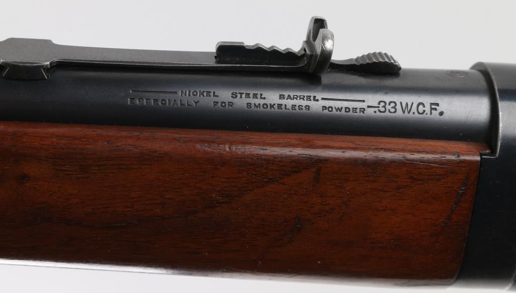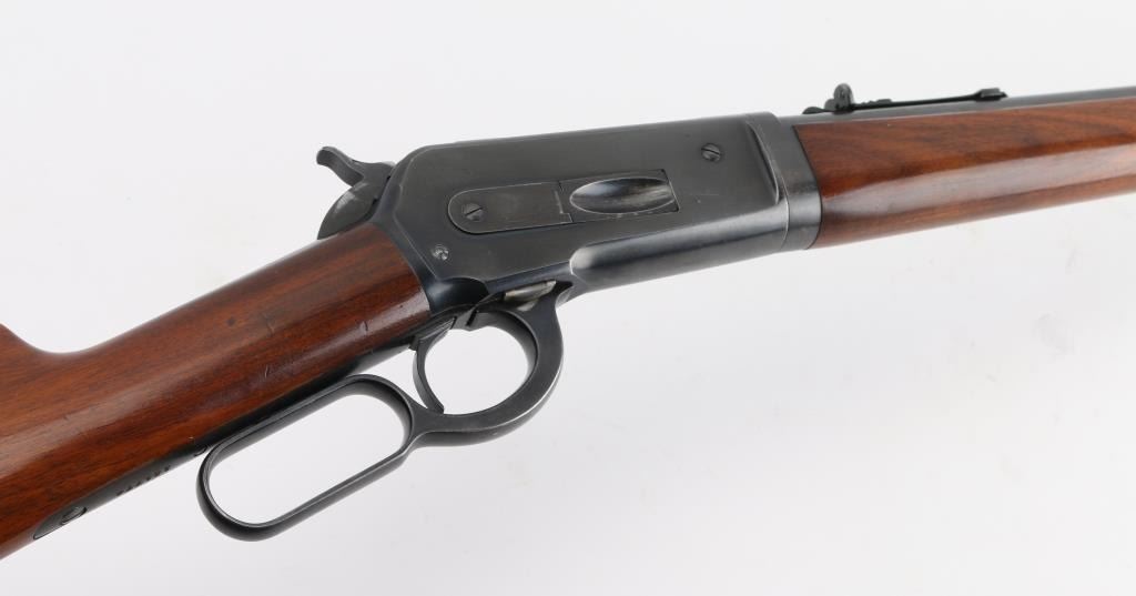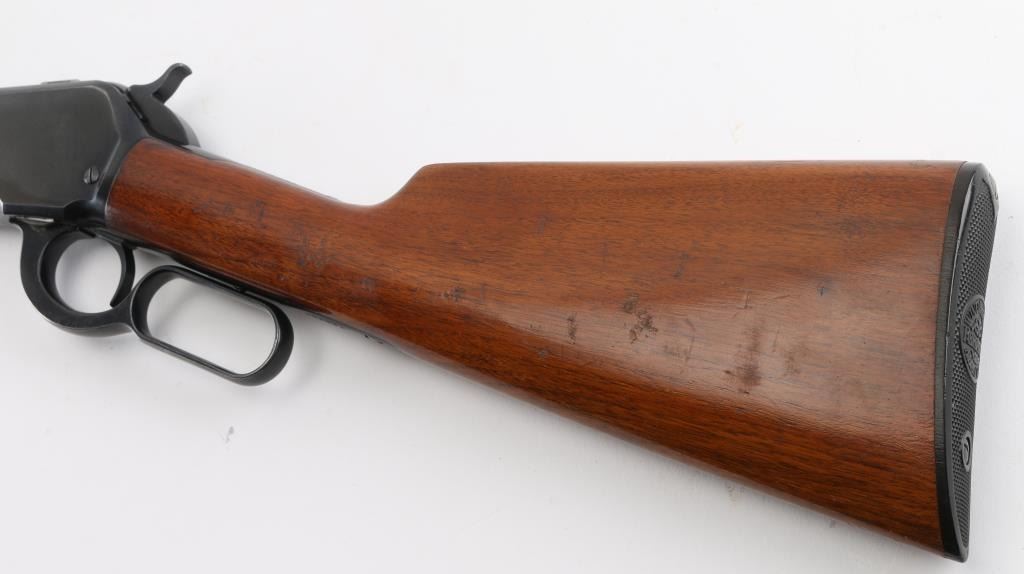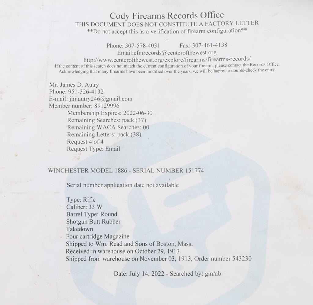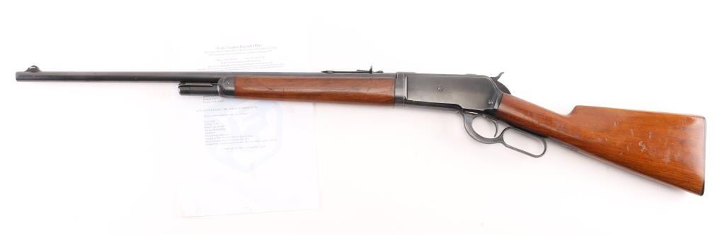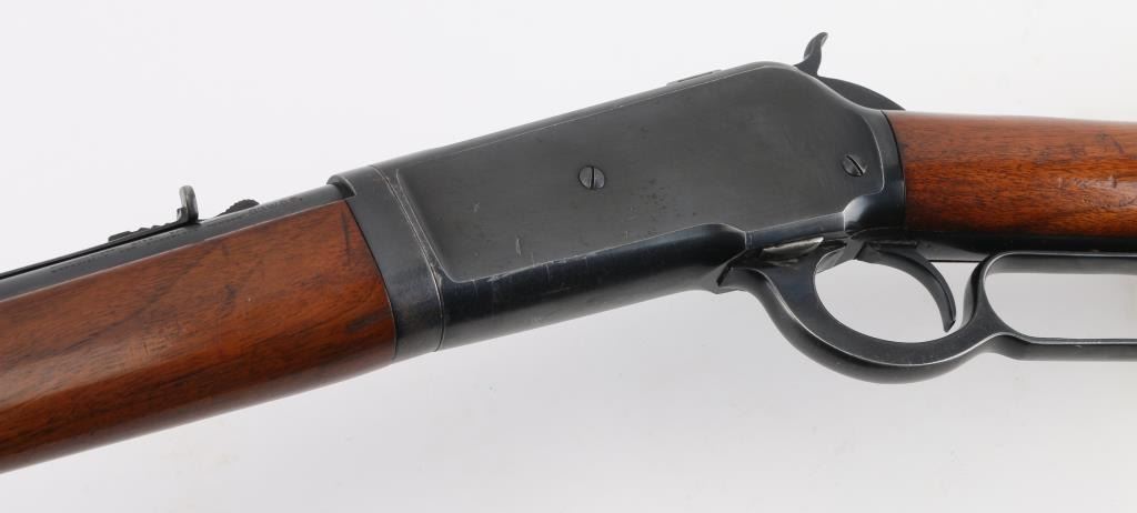 ' Light Weight' lever action take-down rifle manufactured circa 1911. Features 24" round barrel, 2/3 length 4-Rd magazine tube, blade/ white bead front sight, sporting rear sight, straight grip, shotgun butt with black hard rubber factory buttplate. Bore is good/bright, with a couple of areas of light pitting towards the muzzle, fairly strong rifling, Retains about 75% blued finish, with edge losses, scratches and some bare metal on bottom of receiver and on forend cap. Wood is good to very good condition, good fit to metal, scratched and dented. Action is smooth. Markings are sharp and even. Includes letter from Cody Firearms Museum confirming these features as shipped from factory on November 3rd, 1913 to Wm. Read & Sons, Boston Mass. NRA Condition-Good. C&R Firearm.