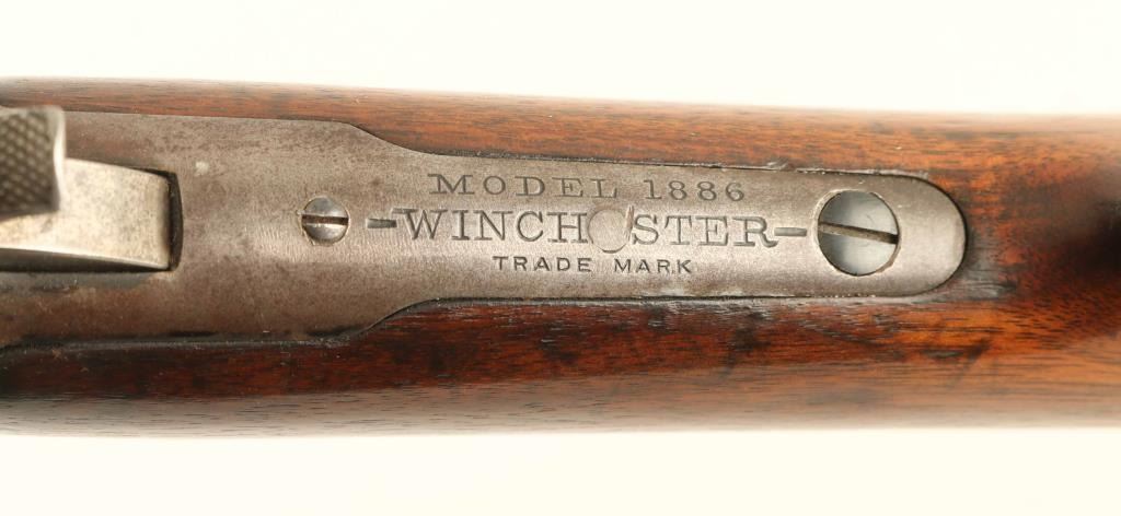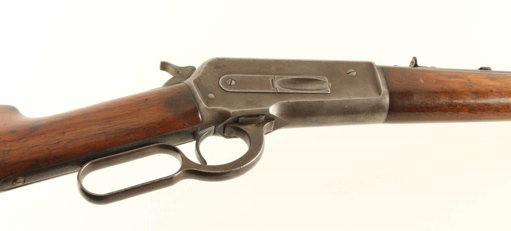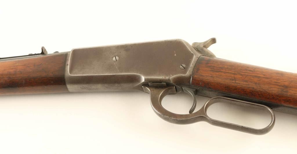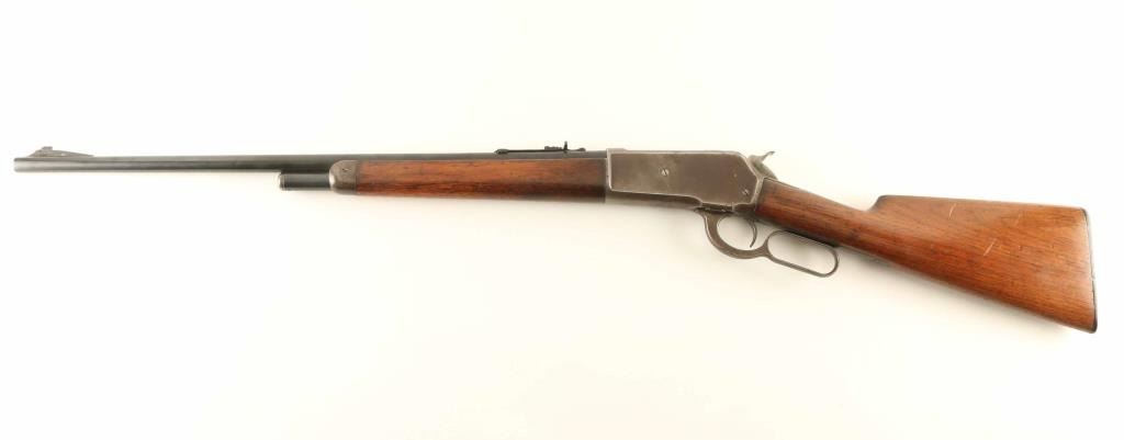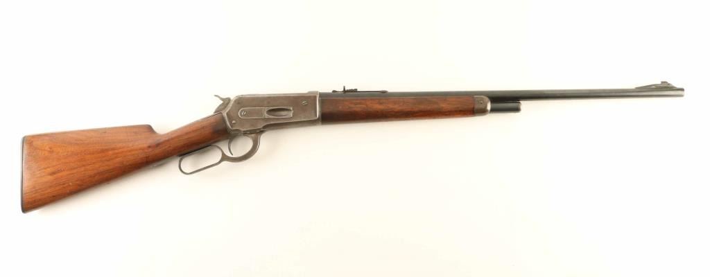 Rifle. Lever-Action. Manufactured 1906. Replacement barrel, top of bolt drilled/tapped . Refinished wood. Side-loading, top ejection. 24" round tapered barrel, with ramped post/bead front and semi-buckhorn rear sights. Fed from tube magazine. Smooth, walnut stack, and forearm. Black plastic buttstock. Blued metal finish. Laminated wood is very good, with minor scratches/dings. Bore appears very good/bright. Action is crisp/tight. Receiver, lever have turned a plum color. NRA Condition-Very Good with replaced barrel. C&R Firearm.