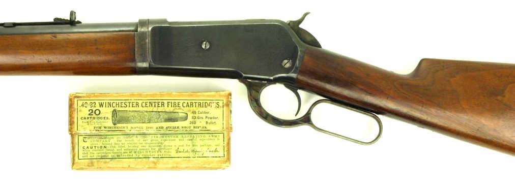 lever action takedown rifle 26" round barrel, full magazine and standard straight grain walnut stocks. Remains very fine condition, barrel shows 92-95% original blue, magazine tube 90-95%, receiver 90-95%, no trapdoor crescent butt plate with mottled case hardening, lever shows bright rainbow case color. Walnut stocks show nice overall condition with only light scattered dings and use marks, original rear and front sights intact. Excellent action and bore. Mfg'd 1894, NO FFL required. Includes Winchester ammo.
