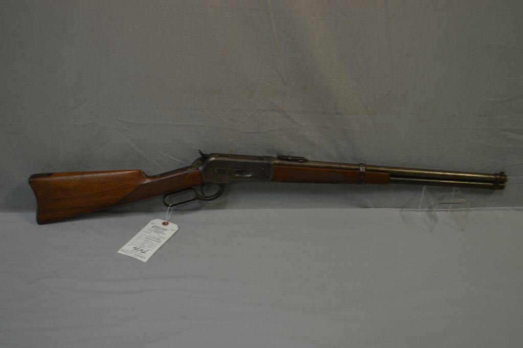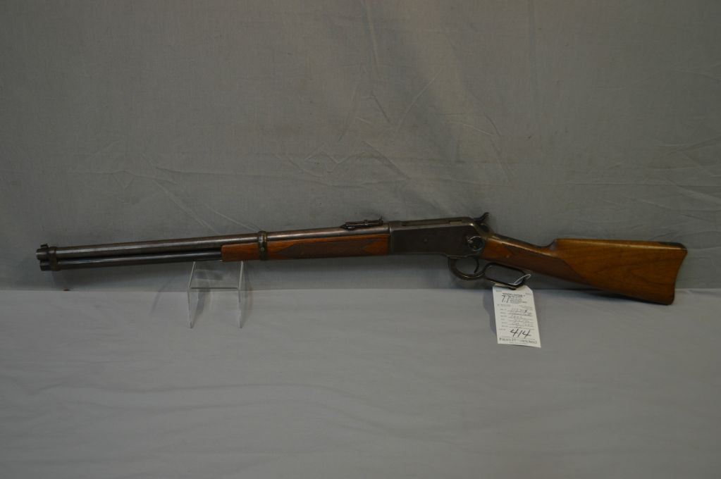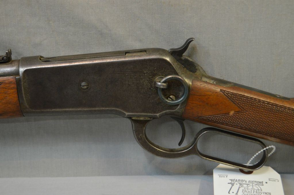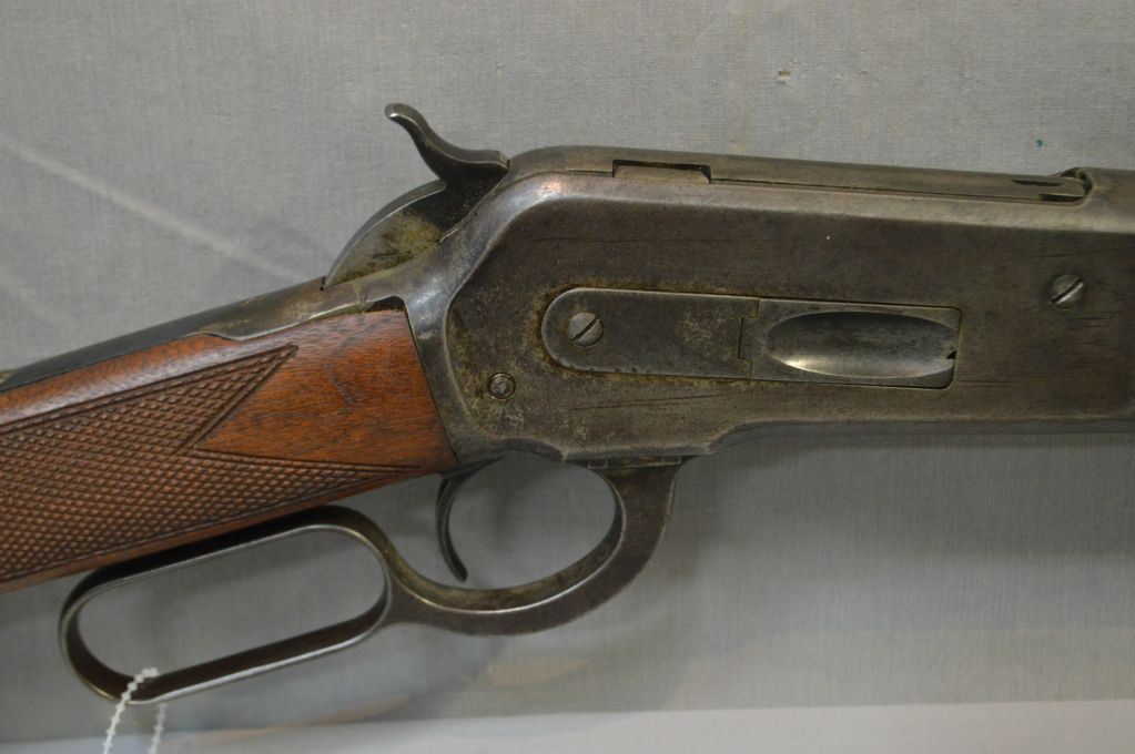 Winchester Model 1886 .45 - 70 Cal Lever Action Saddle Ring Carbine w/ 22" bbl [ fading blue finish turning brown in some areas, traces of flaking case color turned silver on receiver, upper tang welded by both sides of the hammer, with barrel sights, note ; checkered wood with slight chip by weld on the right side, forend has slight crack, metal carbine style butt plate, functions well, small cracks in butt stock by butt plate, mostly on right side, Circa 1897 ] Ser # 113707
