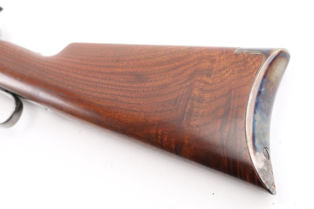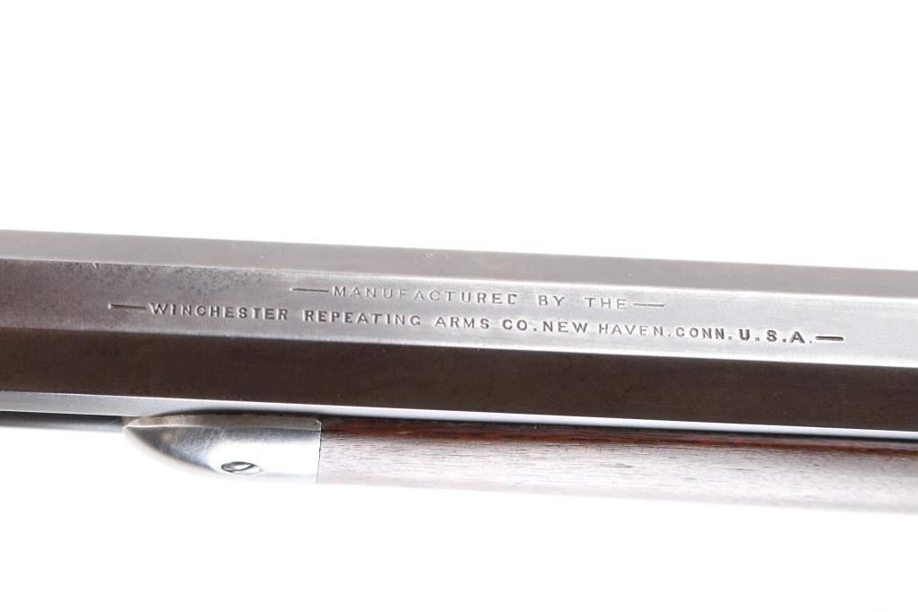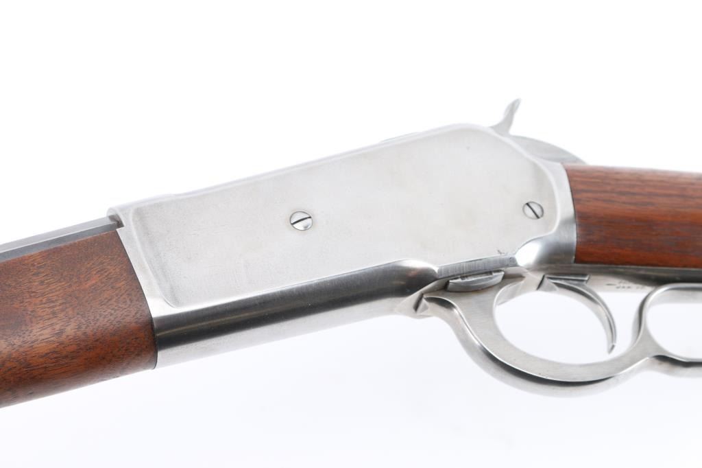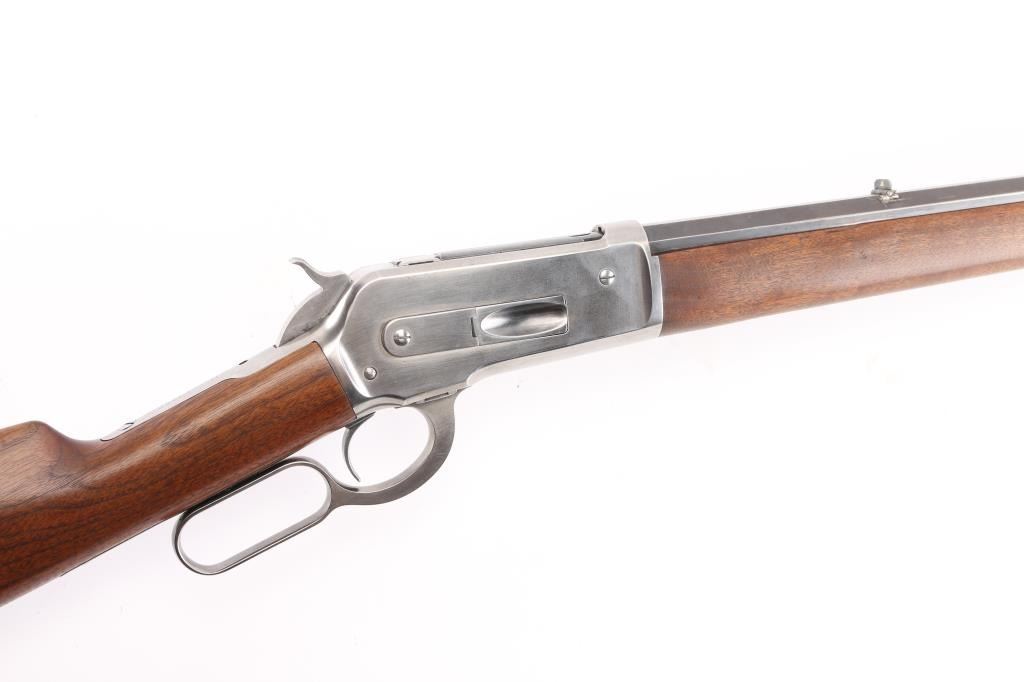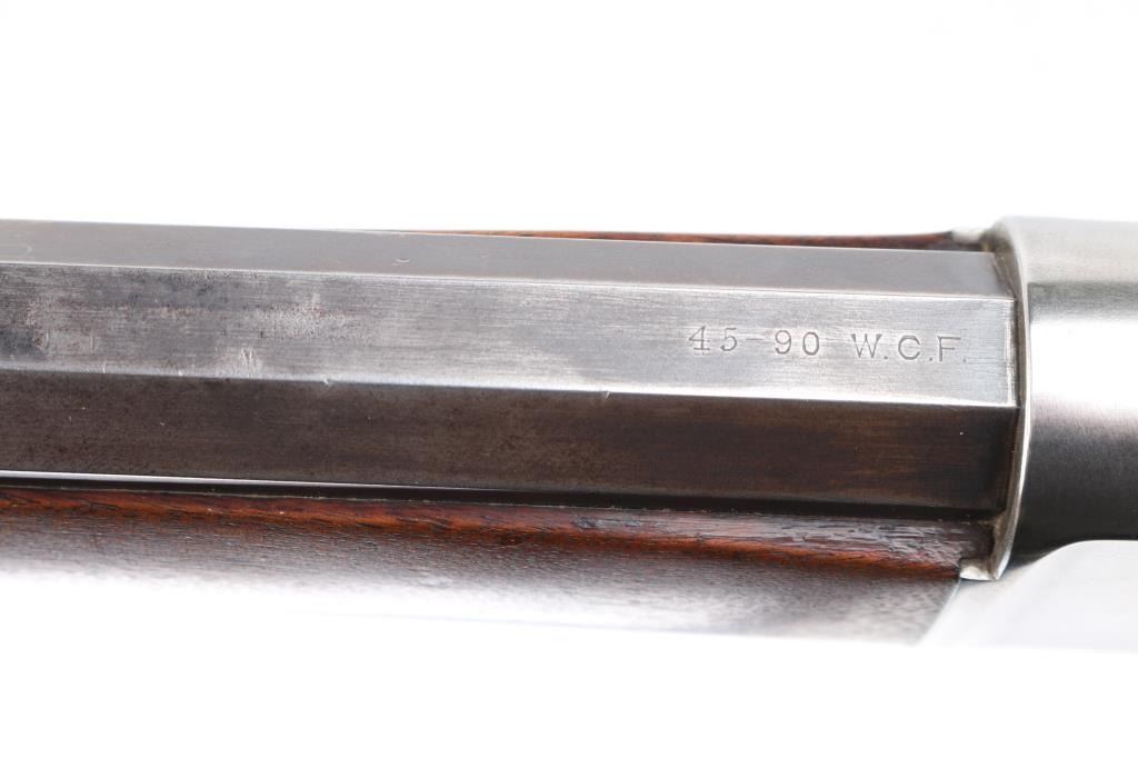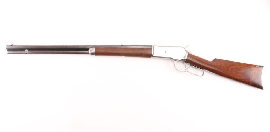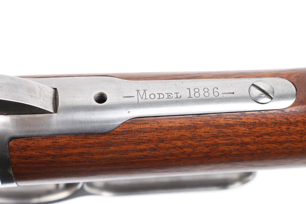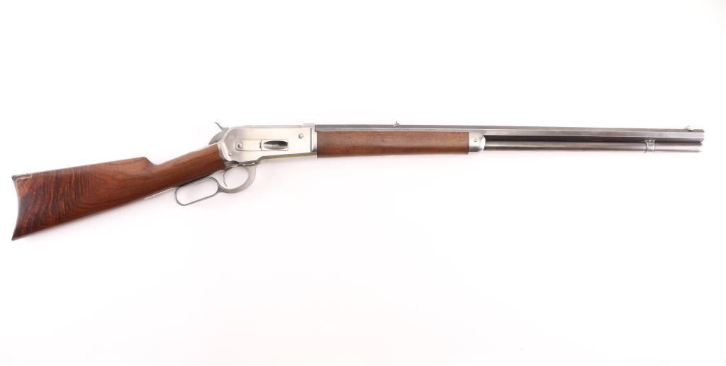This rifle has had some restoration. Manufactured 1892. Large frame lever action repeating rifle chambered in .45-90 Winchester, manufactured in New Haven, CT. Features a 26" octagon barrel, full length magazine tube, period dovetailed Lyman No. 4 ivory bead hunting front sight, modified rear sight, fixed plate with white diamond, no notch, scratches around the dovetail, smooth trigger, knurled hammer spur, smooth walnut forend with metal cap and straight grip shoulder stock with crescent metal buttplate. The rifle exhibits original blue finish on barrel, magazine tube, & bolt, dull with handling/edge wear. some scratches, but mostly all there. The receiver. hammer, fore cap, and lever have been polished, and appear as a stainless steel finish, look good with some very light areas of pitting The action is sound, the bore excellent/bright. the wood stocks are excellent, good fit to metal, the case colored crescent steel buttplate has some corrosion at the heel, the underside of the forearm has a Mother of pearl insert. Two line Winchester address on barrel flat, along with '45-90 W,C,F', 'Model 1886' on upper tan, and two patent dates on lower tang, and the serial number. The forward screw on the upper tang is missing. If you are looking for a original 1886 to shoot, this is it, NRA Condition- Very Good as Restored. C&R Firearm.