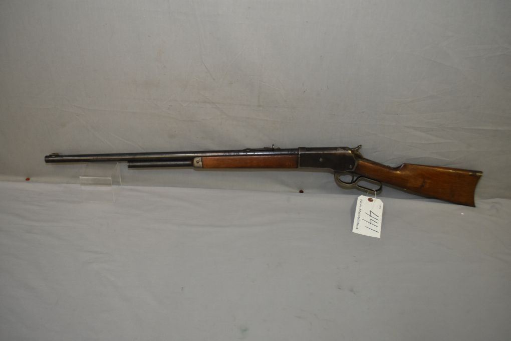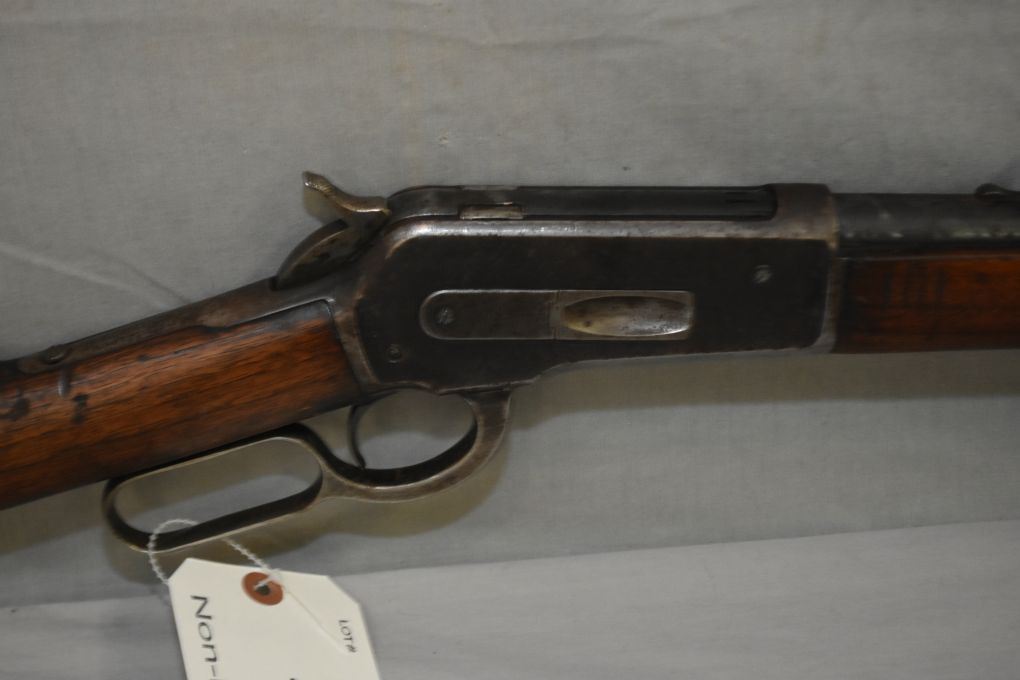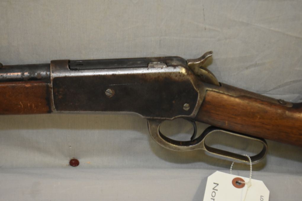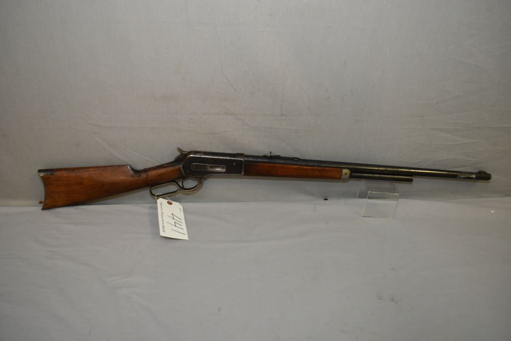 Winchester Model 1886 .45 - 90 WCF Cal Lever Action Rifle w/ 26" bbl [ fading blue finish with surface rust, mag tube cut to three quarter mag, receiver shows some areas faded to grey, along with the rusting blue, fair wood with some marks & gouges, crescent butt plate, Circa 1907 ] Ser # 143127