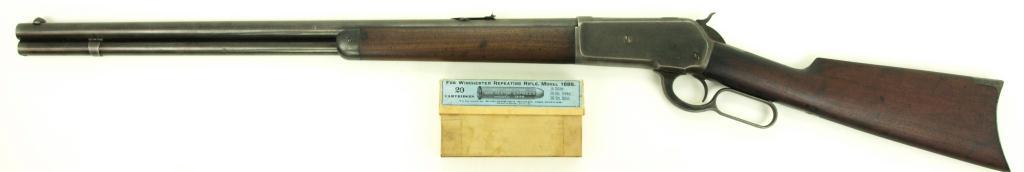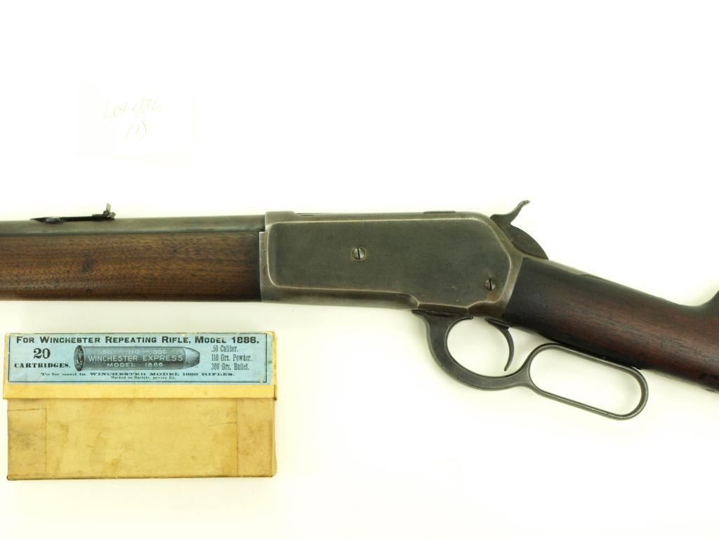 lever action rifle 26" standard round barrel, full magazine and straight grain walnut stocks. Barrel and magazine tube retain 10-15% in protected areas remainder tuning gray to brown, receiver shows traces of original case color the remainder shows gray to brown finish. Crescent butt plate with areas of light to moderate pin prick pitting, original stocks show no cracks or repairs. Ivory inset front sight with 3 leaf express rear sight. Very good action with dark frosty bore, descent rifling. Mfg'd 1897, NO FFL required. Includes ammo and letter.