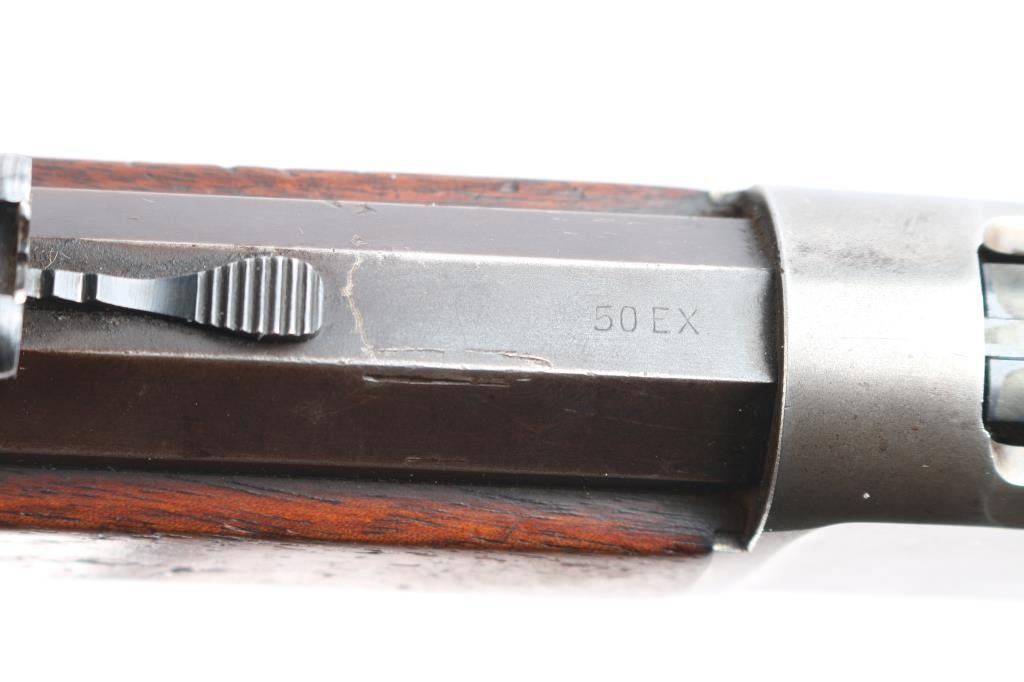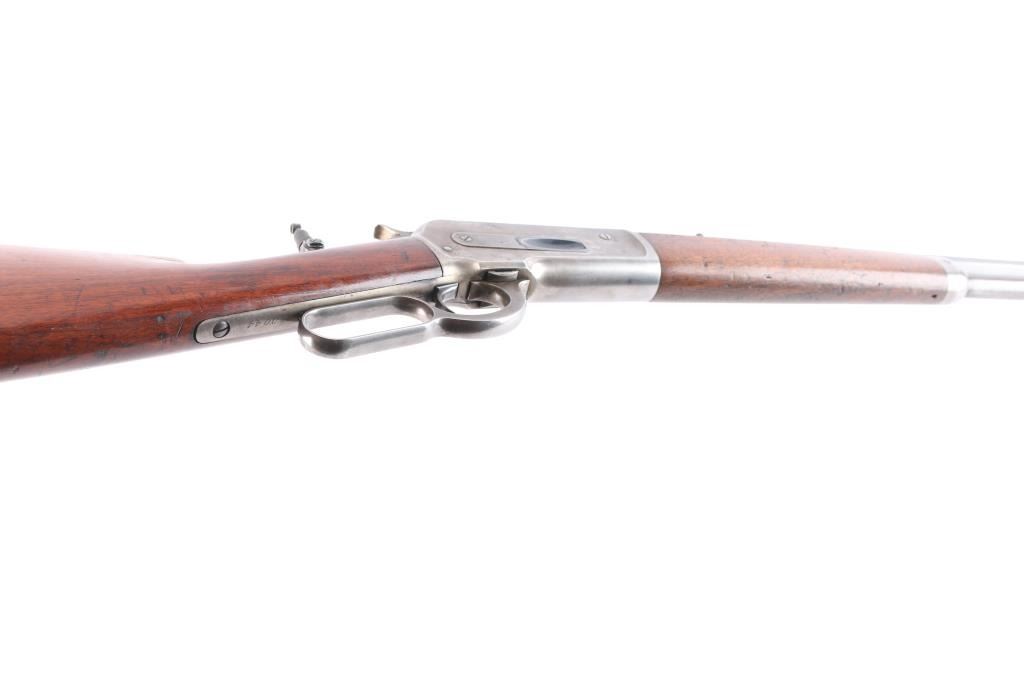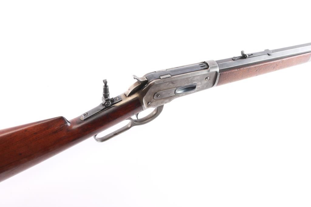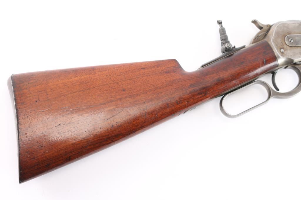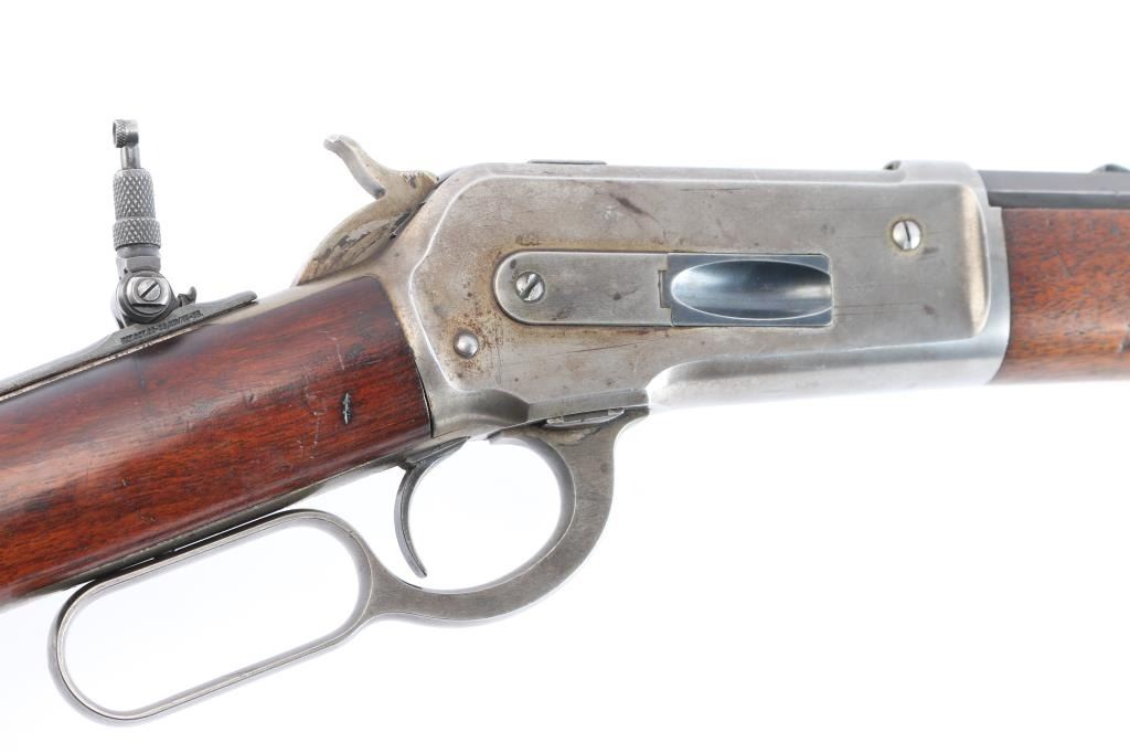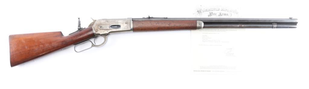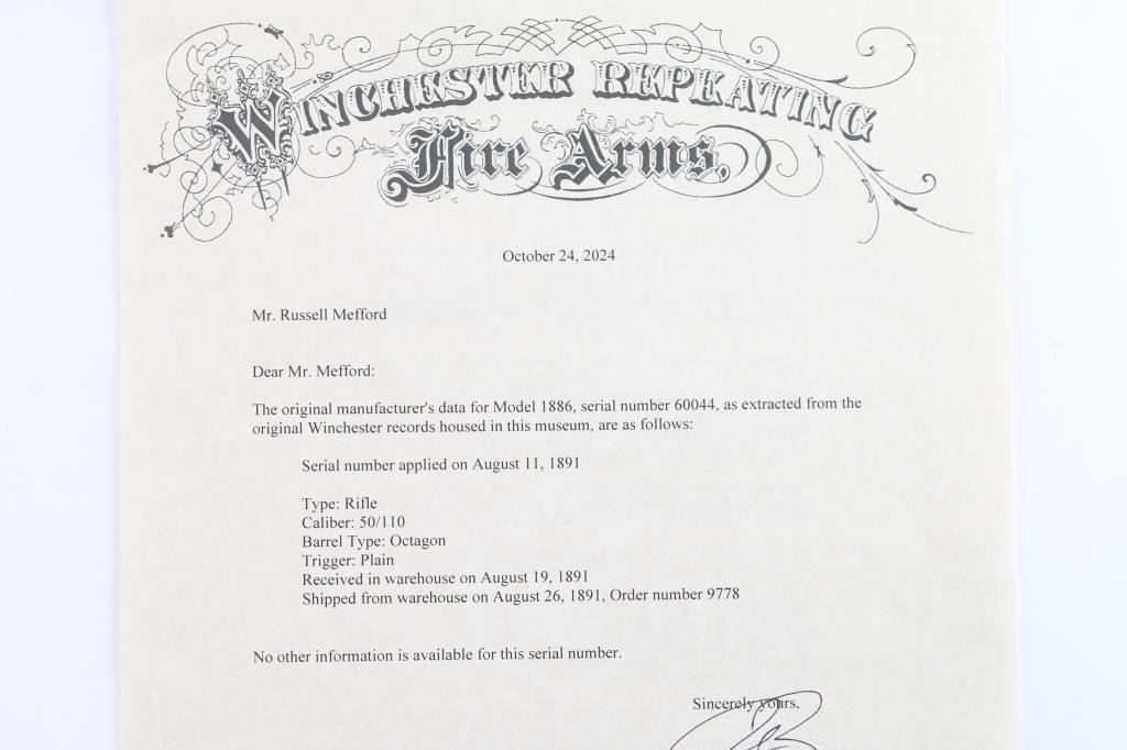 Winchester 50-110 or the "Big 50", with factory documentation. The Winchester Model 1886, designed by John Moses Browning, was introduced to handle the most powerful cartridges available in the late 19th century. Among these was the .50-110 Winchester, a formidable cartridge first introduced in 1887. Originally designed as a black powder cartridge, the .50-110 fired a .50 caliber, 300-grain bullet with substantial stopping power, making it one of the most powerful commercial cartridges in North America at the time. Manufactured 1891. Serial number “60044” and two line "Pat. Oct. 143 ,1884 Jan 20, 1885" is marked on the lower tang. Two line “Winchester Repeating Arms Co” address line is on the top of the barrel flat. The rear barrel flat is marked “50 EX”. 26 inch octagon fitted with a Lyman beaded blade front sight, adjustable Winchester Flat Top Low Semi-Buckhorn Rear Sights. Marbles aperture sight with 1893, 94 patent dates installed on tang, "Model 1886" under it. All markings are crisp/clear. The bore is bright with strong rifling, has scattered very light pitting, the action is crisp/smooth, the blue on the barrel/tube has dulled somewhat over time, about 70% with handling wear, bright metal showing on the edges, some scratches/scuffs and some minor dings along the edges, The bolt and spring cover in the loading gate retain most of the original blue. The receiver is mostly silver from handling, slight traces of case colors visible, has minor scratches and some very light scattered pin-prick pitting, the forearm & shoulder stock with smooth steel buttplate are overall very good with no chips or cracks, minor dents and scratches, the right forearm has some dings in it, nothing serious and there is a very small screw hole on the underside of the upper forearm. Comes with Winchester Cody Firearms museum letter confirming the caliber and octagon barrel, serial number applied august 11, 1891, received in warehouse August 19, 1891 and shipped August 26, 1891. (Note: About 100 or less "Big 50's" estimated to have been produced.)