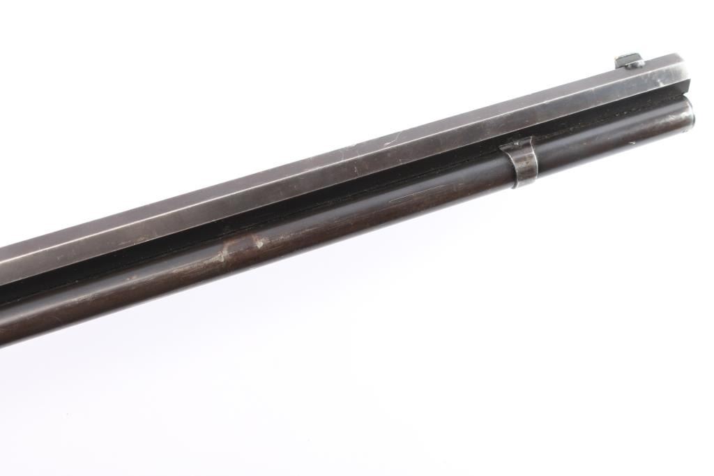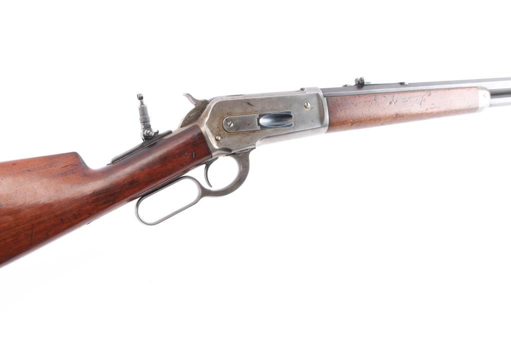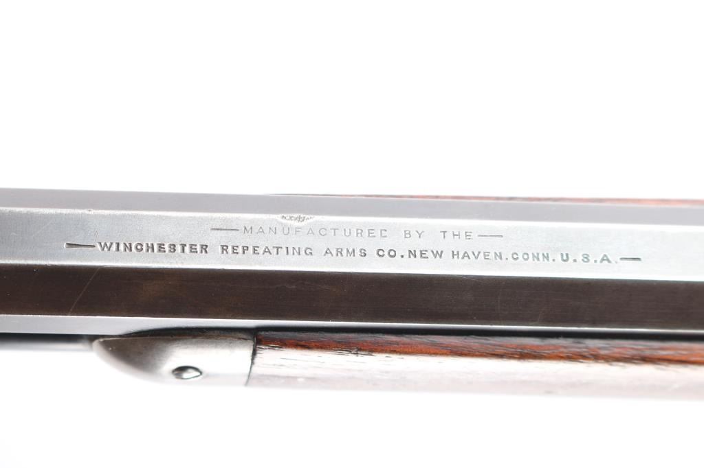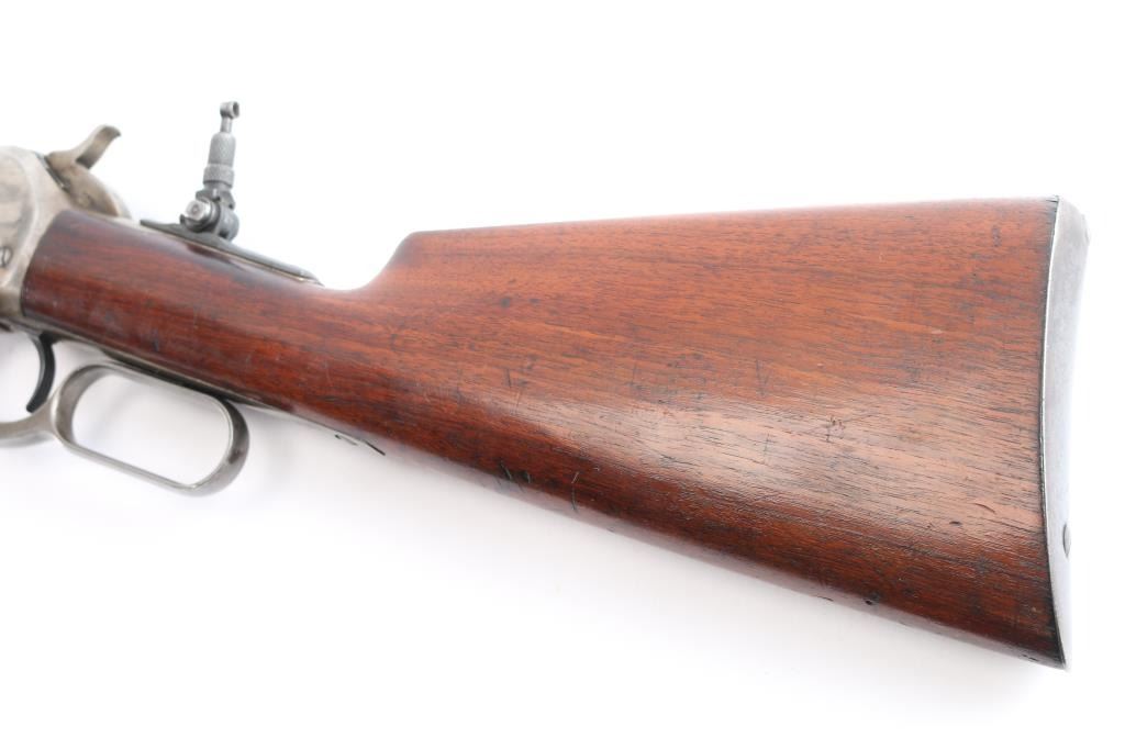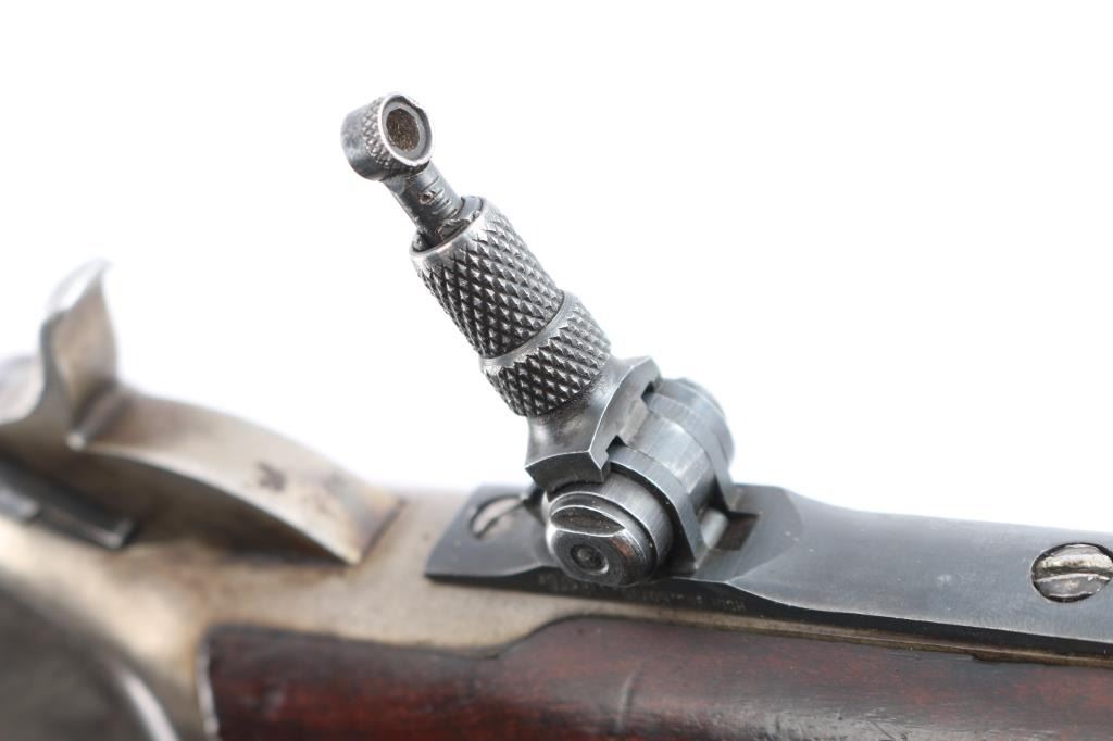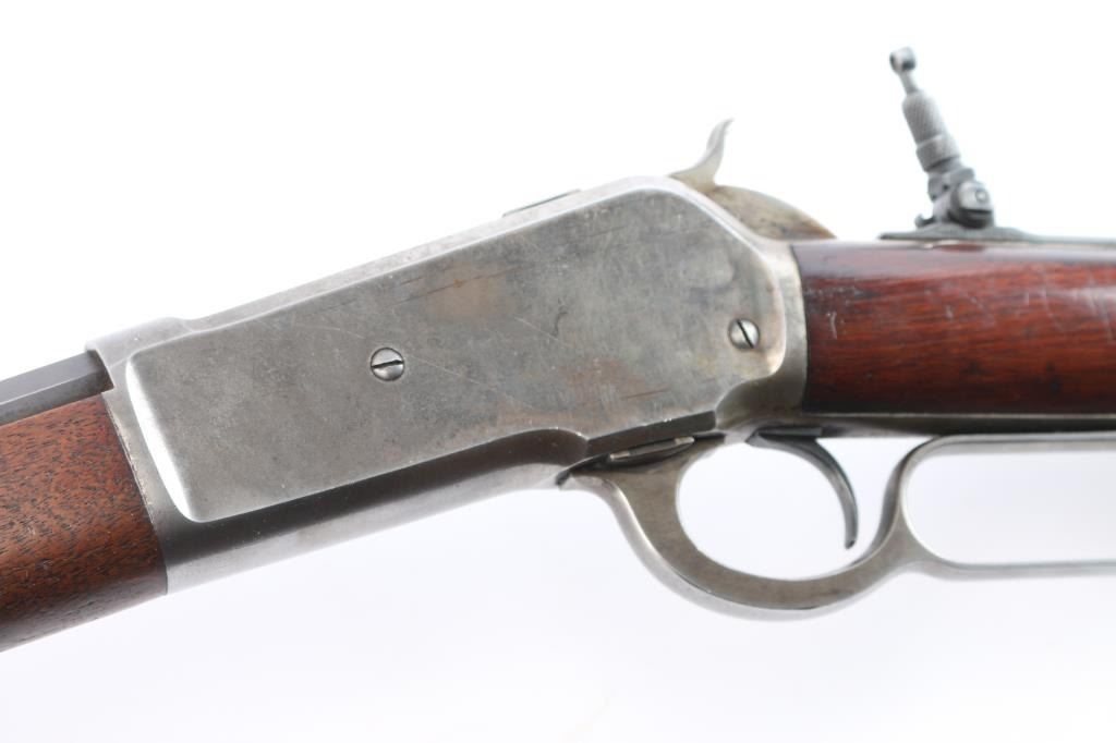 Winchester 50-110 or the "Big 50", with factory documentation. The Winchester Model 1886, designed by John Moses Browning, was introduced to handle the most powerful cartridges available in the late 19th century. Among these was the .50-110 Winchester, a formidable cartridge first introduced in 1887. Originally designed as a black powder cartridge, the .50-110 fired a .50 caliber, 300-grain bullet with substantial stopping power, making it one of the most powerful commercial cartridges in North America at the time. Manufactured 1891. Serial number “60044” and two line "Pat. Oct. 143 ,1884 Jan 20, 1885" is marked on the lower tang. Two line “Winchester Repeating Arms Co” address line is on the top of the barrel flat. The rear barrel flat is marked “50 EX”. 26 inch octagon fitted with a Lyman beaded blade front sight, adjustable Winchester Flat Top Low Semi-Buckhorn Rear Sights. Marbles aperture sight with 1893, 94 patent dates installed on tang, "Model 1886" under it. All markings are crisp/clear. The bore is bright with strong rifling, has scattered very light pitting, the action is crisp/smooth, the blue on the barrel/tube has dulled somewhat over time, about 70% with handling wear, bright metal showing on the edges, some scratches/scuffs and some minor dings along the edges, The bolt and spring cover in the loading gate retain most of the original blue. The receiver is mostly silver from handling, slight traces of case colors visible, has minor scratches and some very light scattered pin-prick pitting, the forearm & shoulder stock with smooth steel buttplate are overall very good with no chips or cracks, minor dents and scratches, the right forearm has some dings in it, nothing serious and there is a very small screw hole on the underside of the upper forearm. Comes with Winchester Cody Firearms museum letter confirming the caliber and octagon barrel, serial number applied august 11, 1891, received in warehouse August 19, 1891 and shipped August 26, 1891. (Note: About 100 or less "Big 50's" estimated to have been produced.)