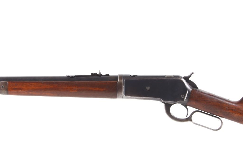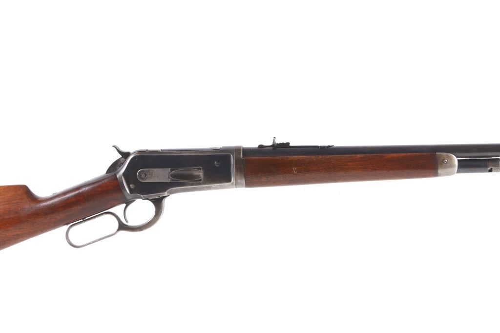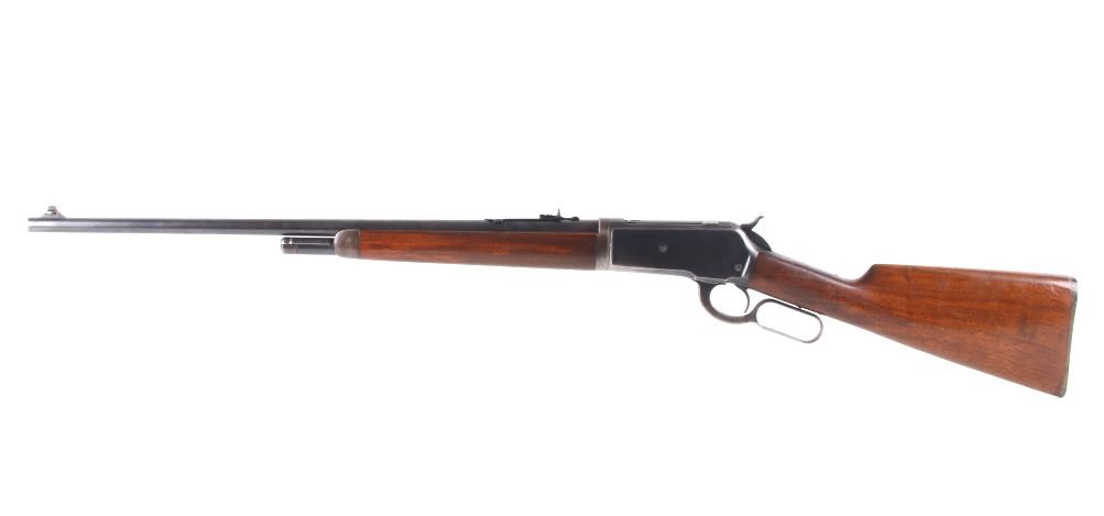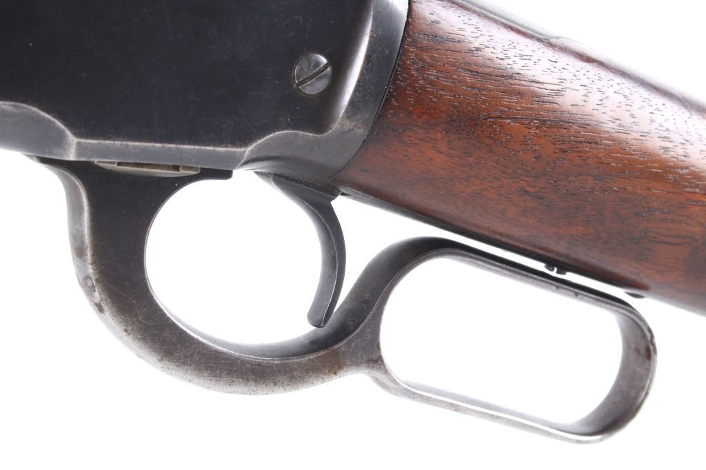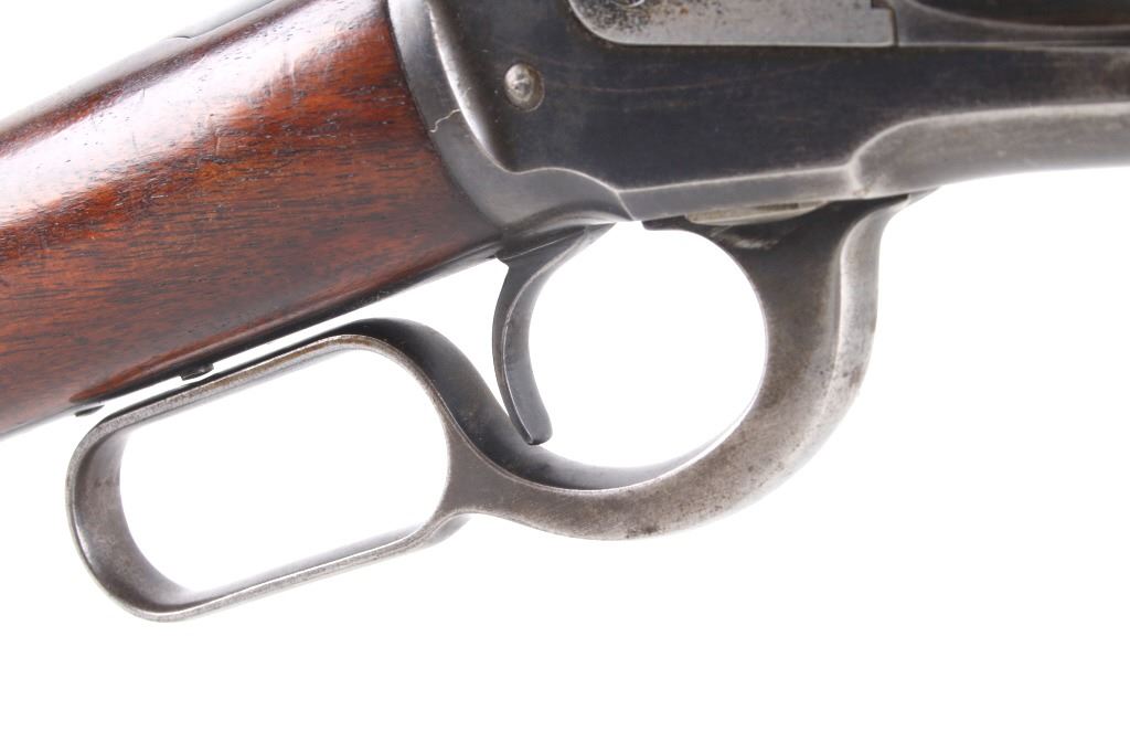 Winchester 1886 Extra Lightweight Takedown Sporting rifle in smokeless powder .33 WCF (Winchester Center Fire) chambering, serial number 159525 indicating a manufacture date of 1930. The famed 1886 was one of John Moses Browning’s best and strongest designs. It was especially popular in the West where a repeating rifle capable of handling the largest and most powerful cartridges of the day was desirable. Such notables as Theodore Roosevelt favored the Winchester 1886. This is a high condition and very late production Model 1886 rifle. According to the standard work on Winchesters, The Winchester Handbook by George Madis, “Serial number 256599 was the highest number produced in standard production. It was shipped on December 8, 1920. A fair stock of parts and assembled guns remained on hand, and in the final parts clean-up serials reached 159994, with the last guns assembled in 1932.” After about 1912 Winchester was making very few 1886 rifles each year. Since the old black powder cartridges of decades before were rapidly becoming obsolete, in 1902 Winchester brought out the .33WCF cartridge specifically for the Model 1886. This advanced cartridge design was simply the .45-70 case necked down to accept .338” diameter jacketed bullets and loaded with smokeless powder. At the time it was the most powerful cartridge offered in any tubular magazine