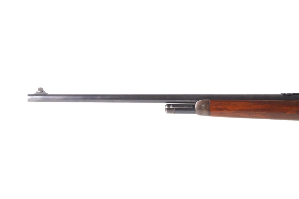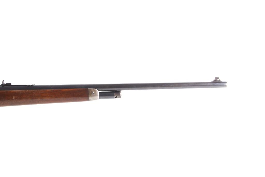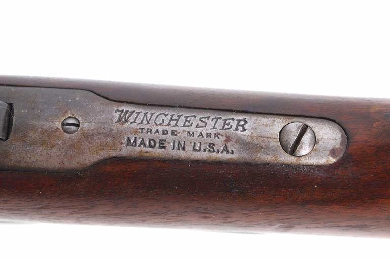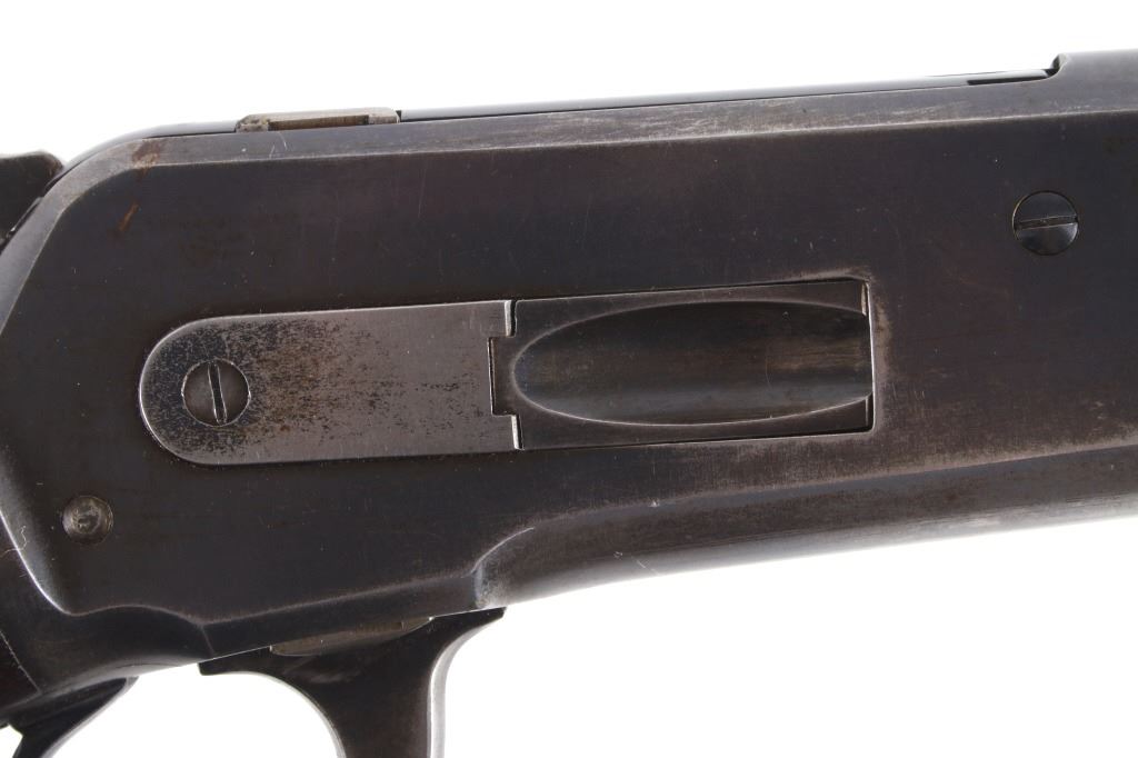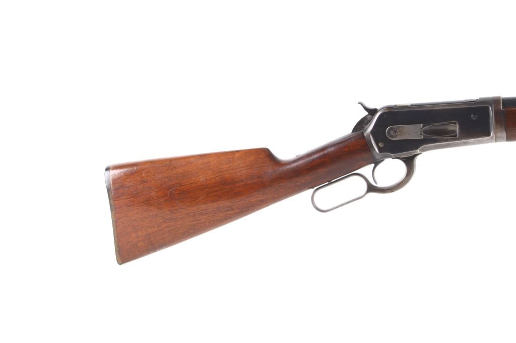 Winchester 1886 Extra Lightweight Takedown Sporting rifle in smokeless powder .33 WCF (Winchester Center Fire) chambering, serial number 159525 indicating a manufacture date of 1930. The famed 1886 was one of John Moses Browning’s best and strongest designs. It was especially popular in the West where a repeating rifle capable of handling the largest and most powerful cartridges of the day was desirable. Such notables as Theodore Roosevelt favored the Winchester 1886. This is a high condition and very late production Model 1886 rifle. According to the standard work on Winchesters, The Winchester Handbook by George Madis, “Serial number 256599 was the highest number produced in standard production. It was shipped on December 8, 1920. A fair stock of parts and assembled guns remained on hand, and in the final parts clean-up serials reached 159994, with the last guns assembled in 1932.” After about 1912 Winchester was making very few 1886 rifles each year. Since the old black powder cartridges of decades before were rapidly becoming obsolete, in 1902 Winchester brought out the .33WCF cartridge specifically for the Model 1886. This advanced cartridge design was simply the .45-70 case necked down to accept .338” diameter jacketed bullets and loaded with smokeless powder. At the time it was the most powerful cartridge offered in any tubular magazine