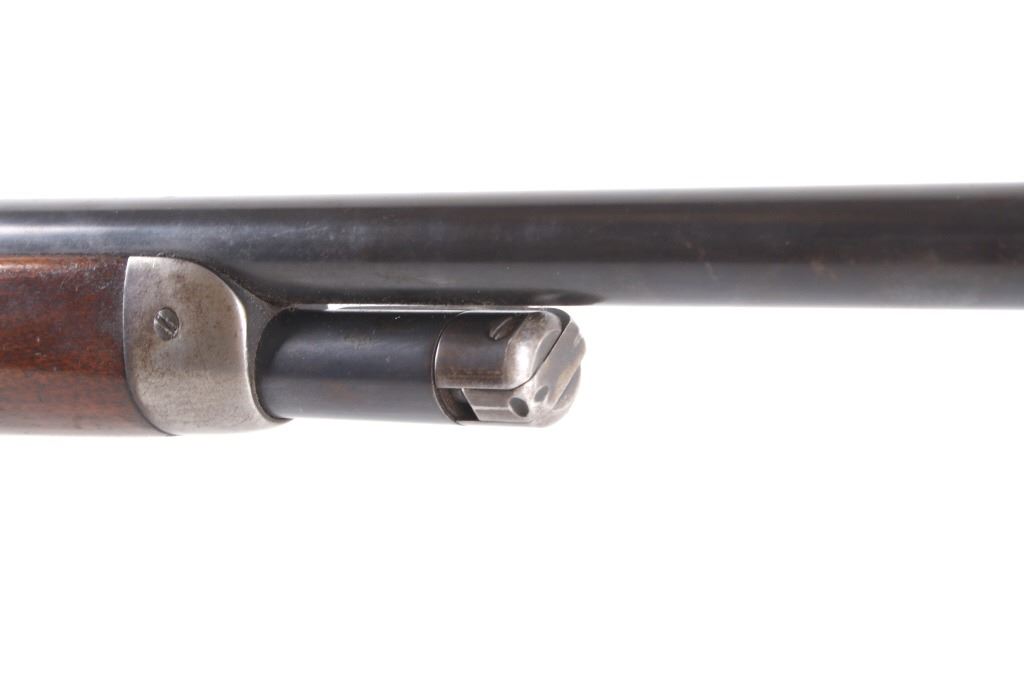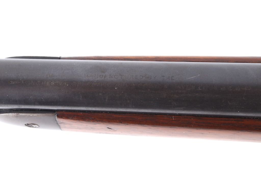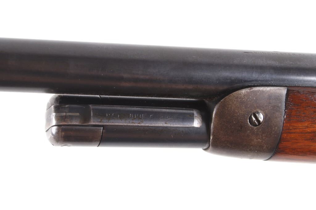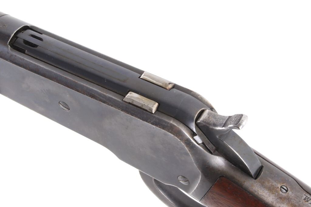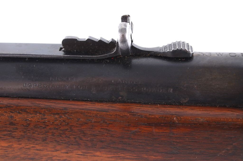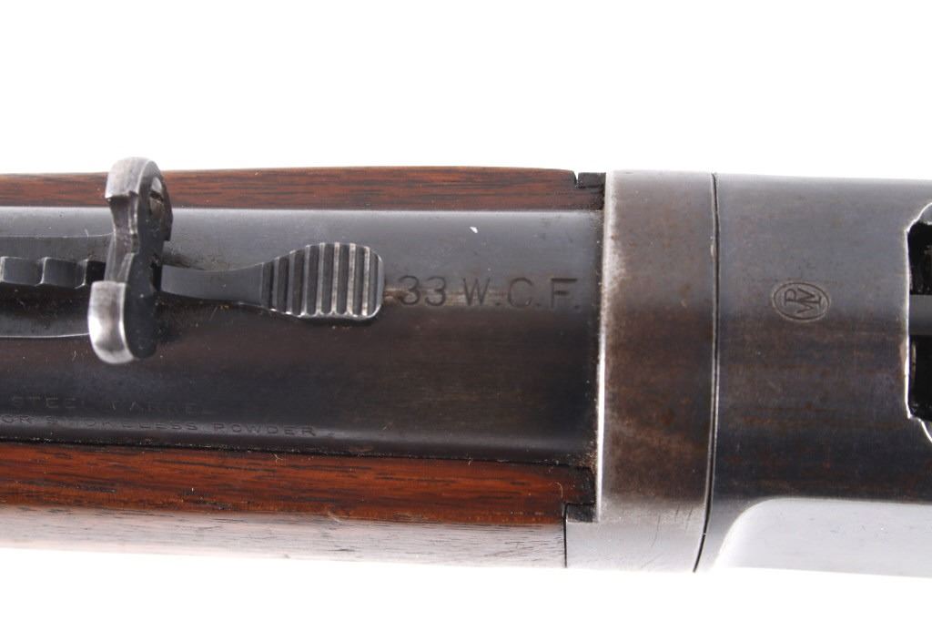 top of the receiver. The barrel has sharp correct Model 1886 markings along with the correct Winchester address and “.33 WIN.” caliber stamping. Screw heads are excellent, walnut butt stock and forend are also excellent and show very tight wood to metal fit. The takedown feature was a special order option and this rifle retains the tight fitting of this feature. The action is also tight and the safety half-cock is strong. The bore shows strong rifling and is a little dark with leading that should clean out. This is one of the very last of the big 1886 Winchesters ever produced and is in extremely high condition. This rifle weighs 7lbs 12oz. Serial Number: 159525. This firearm qualifies as an Antique due to pre 1900's model design and obsolete cartridge, and does not require FFL Transfer or NICS Background Check.