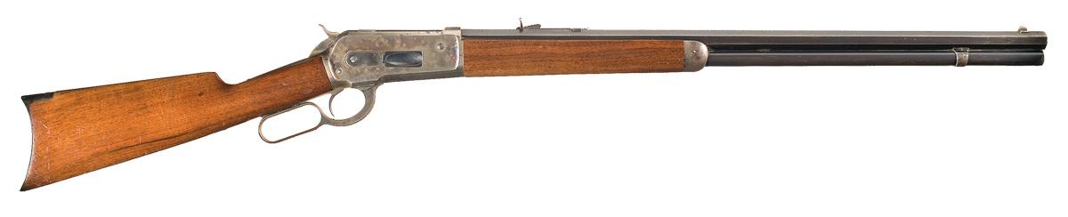 Condition: Very fine. The barrel has a smooth plum blue patina with high edge wear. The magazine retains 95% original blue finish with some thinning to smooth brown. The bolt retains 98% original bright blue finish. The receiver retains 80% original case colors with a the balance having a silver gray with some minor oxidation. The lever retains 40% original case colors with a gray patina and minor oxidation on the balance. The buttplate has aged to a smooth silver gray. The wood is very fine retaining half of the original finish with overall scattered minor dings, dents and scratches. The markings are crisp and clear. The action is excellent.