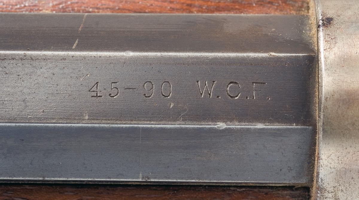 This is a fine example of a Winchester Model 1886 Lever Action .45-90 Rifle. The barrel and magazine are blued and the receiver and crescent buttplate and forearm cap have a casehardened finish. The walnut stock and forearm have an oil finish. The barrel is fitted with the standard silver blade front and adjustable sporting rear sights. The top barrel flat is marked "-MANUFACTURED BY THE- / -WINCHESTER REPEATING ARMS CO. NEW HAVEN. CONN. U.S.A.- " ahead of the rear sight and "45-90 W.C.F." is marked at the breech. The upper tang is marked "-MODEL 1886-" and the lower is marked with the two-line 1884 and 1885 patent markings behind the trigger and the serial number behind the lever.