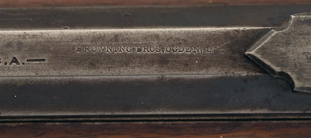 Manufactured in 1889. The top barrel flat is marked with the two line address ahead of the rear sight followed by "BROWNING BROS. OGDEN, U." and "45-90" at the breech. The upper tang is marked "-MODEL 1886-", and the two patent dates and serial number are marked on the lower tang. Blade front sight with an ivory bead and adjustable buck horn rear sight. Blue barrel and full length magazine, with casehardened remaining parts, and mounted with a smooth walnut forearm with steel forend cap and straight grip stock with a crescent buttplate.