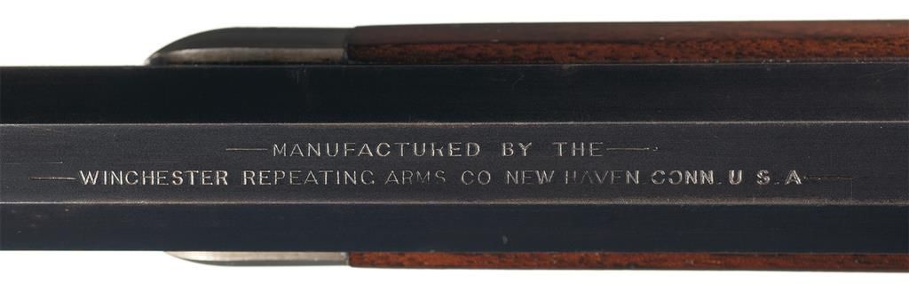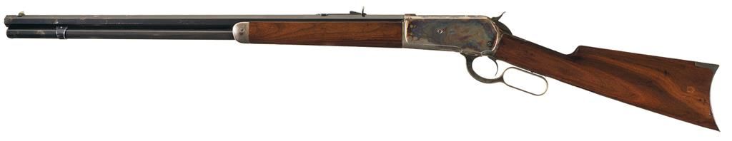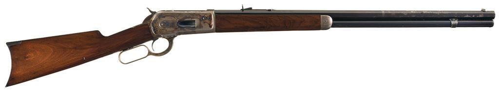 This is a very fine example of a Deluxe Winchester Model 1886 Lever Action Rifle that was manufactured in mid 1895. This rifle is all original and untouched it has the highly desirable and very fragile color casehardened finish on the receiver, forearm cap, hammer, lever and buttplate. It is fitted with a 26 inch full octagon barrel, full length magazine, breech bolt and loading gate, all having a deep Winchester blued finish overall. The stock and forearm are straight grain walnut with a varnish finish. The barrel is fitted with the standard sporting rear sight with the nickel-silver blade front sight. The top barrel flat is roll-stamped with the two-line legend "-MANUFACTURED BY THE-/-WINCHESTER REPEATING ARMS CO. NEW HAVEN. CONN. U.S.A.-" ahead of the rear sight. The caliber designation "40-65" is stamped on the top barrel flat just in front of the receiver. The top tang is stamped with the first pattern markings of: "-MODEL 1886-", with the lower tang stamped with the two-line Winchester patent dates of: 1884/1885 behind the trigger with the script serial number, "97852" behind the lever.