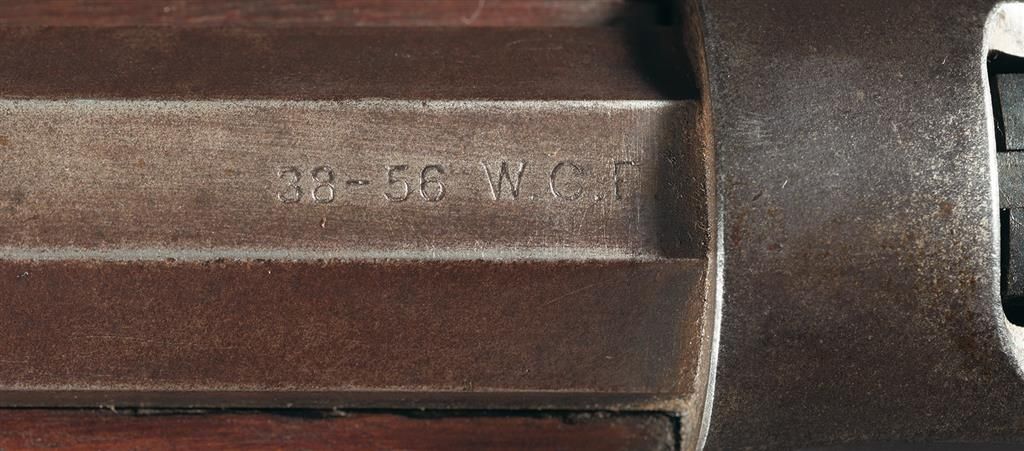 Manufactured in 1893 with the extra length 30 inch octagon barrel. The top barrel flat is marked with the two-line address ahead of the rear sight and "38-56 W.C.F." is marked at the breech. The upper tang is marked "-MODEL 1866-" and the lower tang has the serial number and two-line patent marking. Lyman blade front sight with an elevation adjustable buckhorn rear sight. Blue finish barrel and full length magazine tube with the remaining metal surfaces casehardened. Mounted on a smooth forearm and straight grip stock with a iron forend cap and crescent buttplate.
