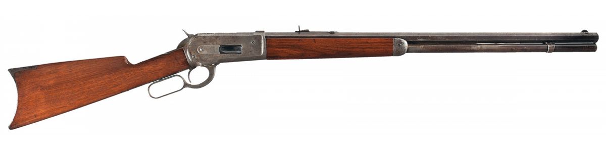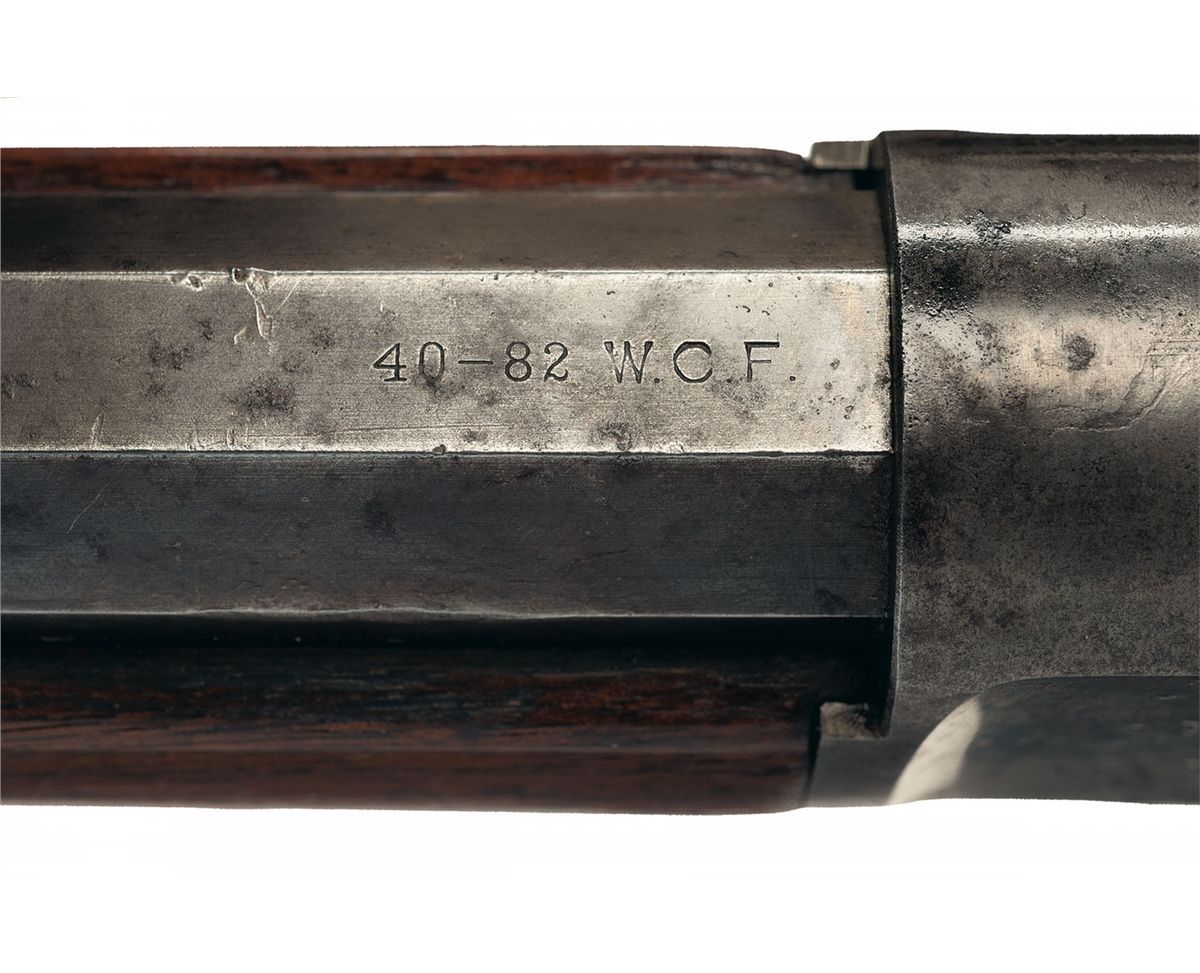 Manufactured in 1891. Lyman half-moon front sight with ivory bead accent and semi-buckhorn rear sight, with the two line address and "40-82 W.C.F." on the top flat. Casehardened frame, lever and hammer, with patent dates on the lower tang and "-Model 1886-" on the upper tang. Smooth stock, with a metal forearm tip and smooth buttplate.