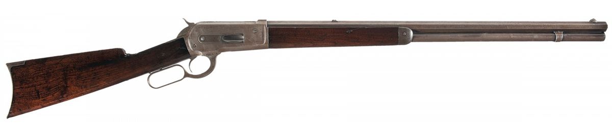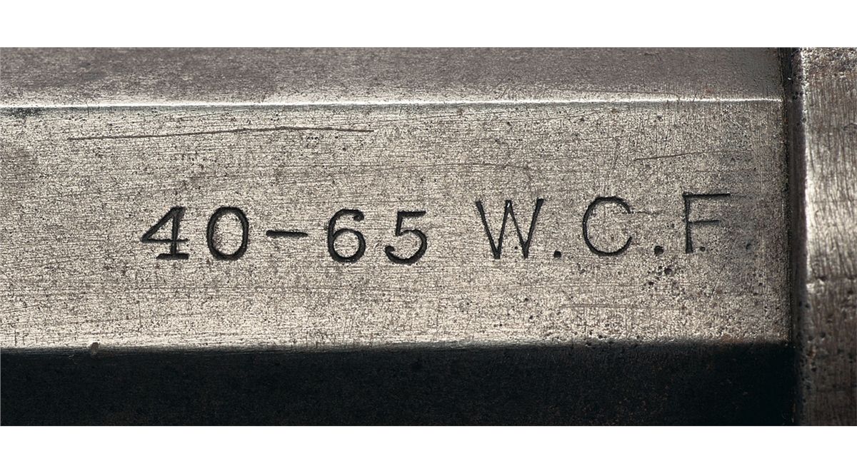 Manufactured in 1894. Blade front and folding leaf rear sights with the top barrel flat stamped with the two line address ahead of the rear sight and caliber marking "40-65 W.C.F." stamped at the breech. The upper tang is marked "-MODEL 1886-" and the lower tang is stamped with the serial number and two line 1884/1885 patent dates marking. The rifle has a full length magazine tube and a smooth forearm and straight grip stock with steel forend cap and crescent buttplate.