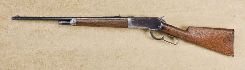 Winchester Model 1886 Special Order Rifle, serial #137477, 45-70 cal., 22” nickel steel bbl, plain trigger, ½ mag., take-down, extra light, shotgun butt (rubber). Received in warehouse Sept. 4, 1906 shipped Oct. 2 to order #69827. The rifle shows 40-60% evenly thinning and drifting blue finish, some bright metal where finish has lifted. The stock is good to very good with slight dings, mars, scratches and normal aging. There is an area of mistreatment to the wood on the left rear of buttstock near butt plate which extends 2-3 inches and is ½” wide and is from abrasion. The markings are good and a king rear sight is added. Action good, bore very good and still bright. Est. $2,500-5,000