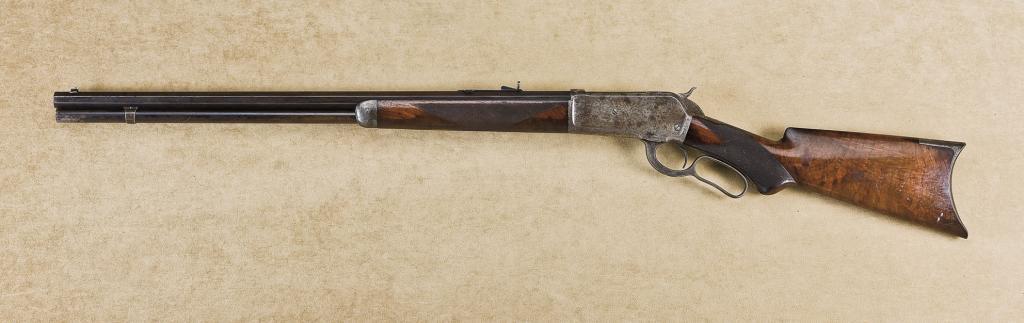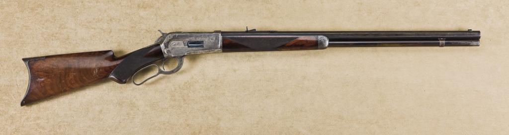 Winchester Model 1886 deluxe lever action rifle, 45-90 cal., 26” octagon barrel, blue and case hardened finish, checkered wood stocks, pistol grip, fine grained wood stocks, #36866. This gun is in overall good to very good condition showing approx. 40% original muted blue finish on the barrel assembly mixed with a pleasing brown patina, approx. 40% case colors on frame, hammer and lever with the balance gone to silver with scattered erosion and pin prick pitting including several spots of blood pitting on the top of the receiver; the bore is good, the action crisp and the markings are sharp. The wood is overall very good with good checkering and better-than-average wood graining; there are scattered nicks, mars and scratches from carry and storage and the ebony inset at the base of the pistol grip is missing. A desirably-appointed deluxe Model 1886 in a highly desirable caliber. Est.: $4,000-$6,000.