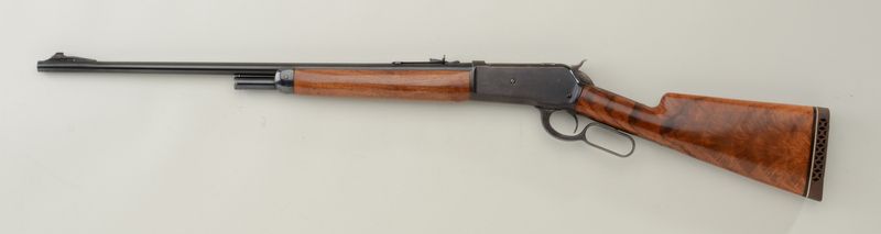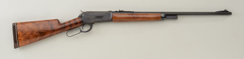 Winchester Model 1886 lever action rifle, .33WCF cal., 24” round barrel, re-blued finish, ¾ magazine, custom wood stocks, #20607. This gun is in overall very good condition as re-furbished showing themajority of a quality reblue, very good bore, crisp action, very good markings and beautifully grained butt stock with White Line hard rubber butt pad. Est.: $800-$1,600.