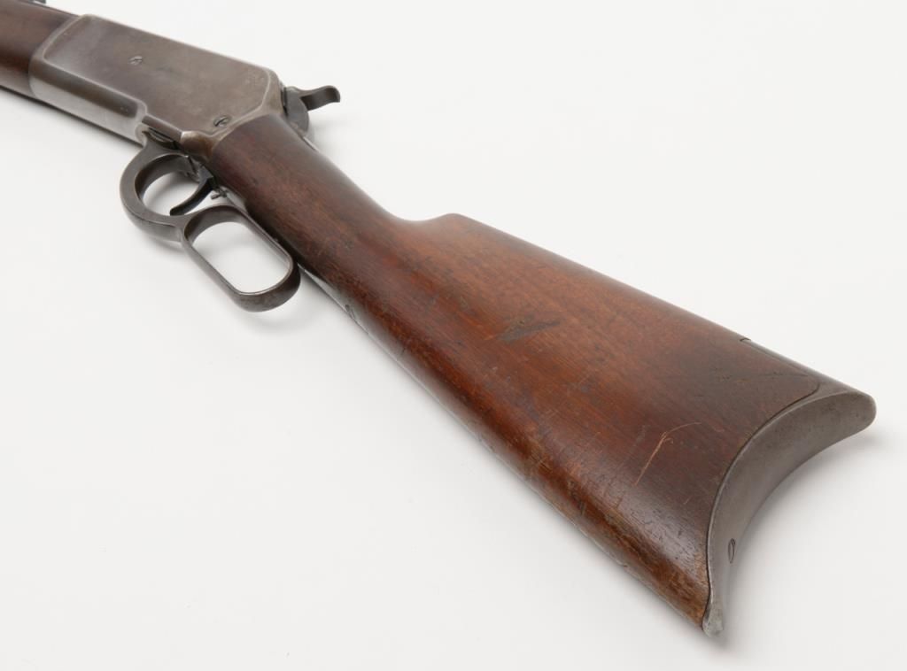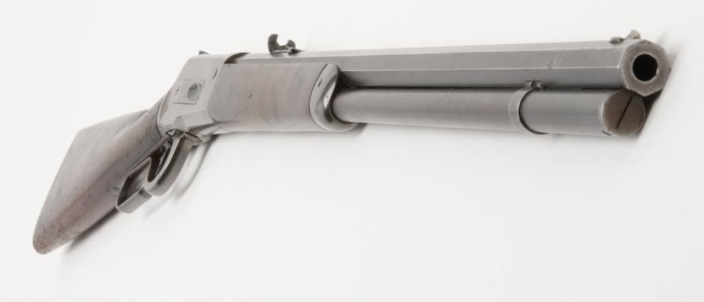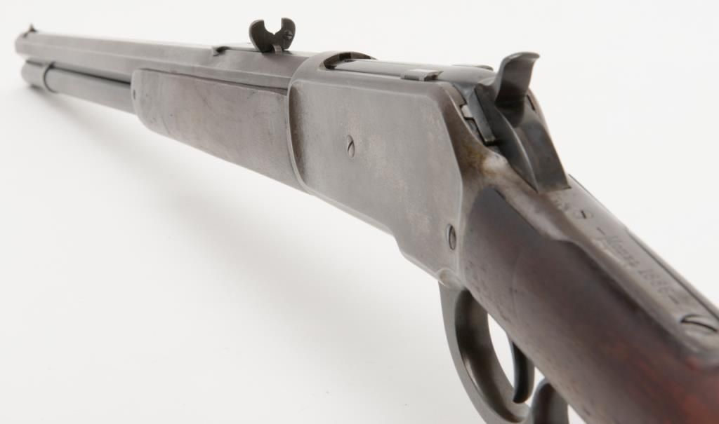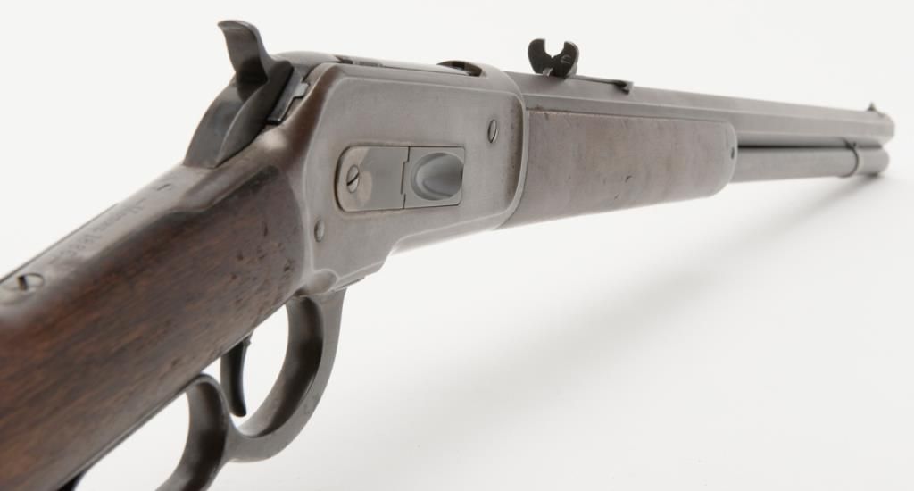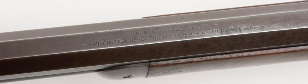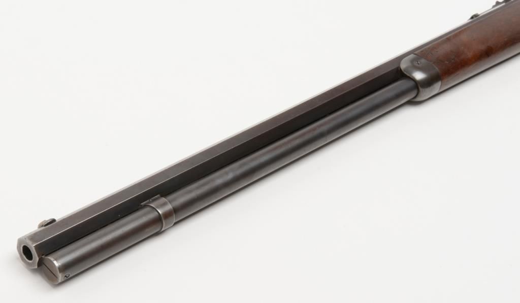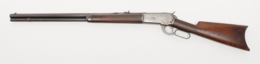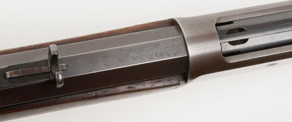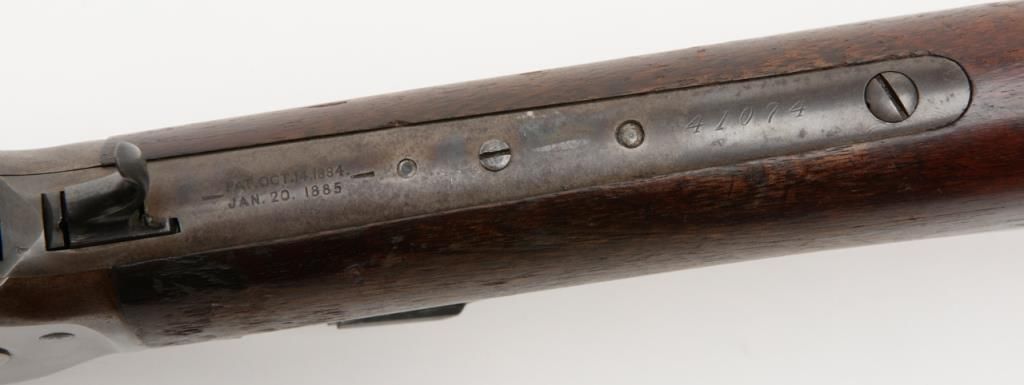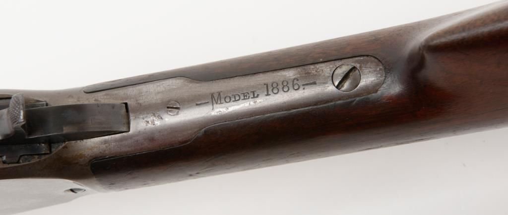 Winchester Model 1886 lever action rifle, .40-65 W.C.F. cal., 26” octagon barrel, blue and case hardened finish, set trigger, wood stocks, #41074 in overall very good condition showing a mixture of original blue and plum brown patina on barreland loading tube, silvery tone to receiver with slight hints of case color; crisp action, sharp markings, good bore, ample original case colors on lever and hammer; forend is very good; butt stock is good + with scattered mars and scratches fromcarry and storage; accompanied with a factory “white sheet” confirming caliber, barrel type and set trigger; received in warehouse on April 12, 1890 and shipped from the warehouse on May 12, 1890 to order #12301. (Antique). Est.:$1,250-$2,500.