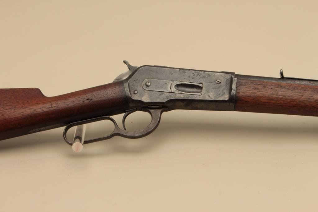 round barrel, blued and case hardened finish, wood stocks, S/N 116847, in overall good condition with blued finish remaining on loading tube, brown patina to barrel, traces of case colors on receiver, scattered spots of erosion and light pitting confined primarily to the barrel, crisp action, good markings, good bore and good + wood. (Antique). Est.: $900-$1,800.