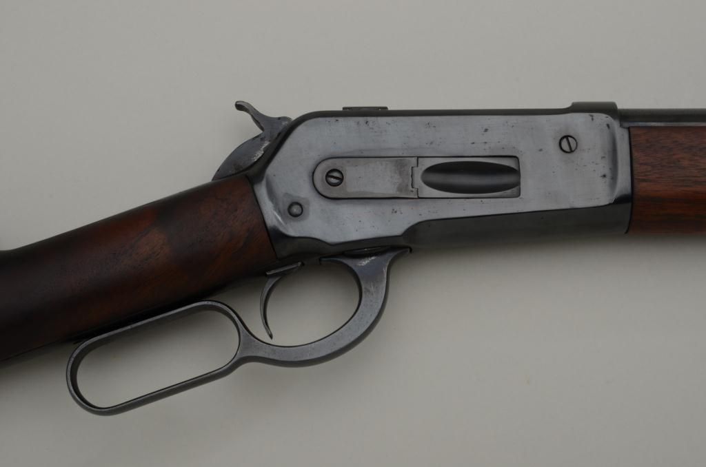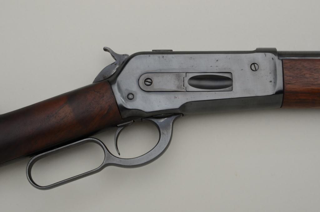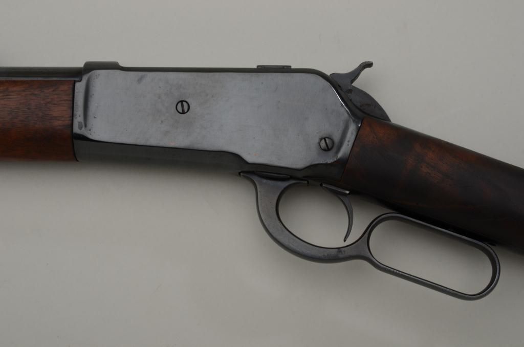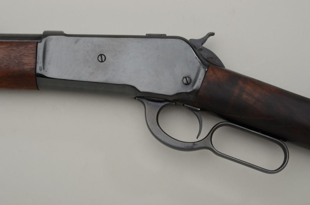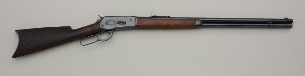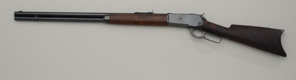 Winchester Model 1886 lever action rifle, .40-82 W.C.F. cal., 26” round barrel, re-blued finish, wood stocks, #95464. This gun is in overall good condition as re-blued showing a good action, fair + bore, scattered light surface pitting and erosion; wood is fair to good showing an old cleaning and some filler used on mars located on the butt stock. Est.: $800-$1,600.