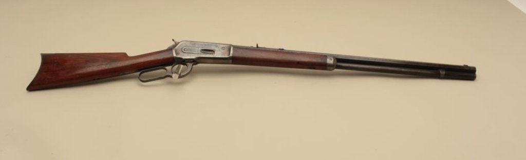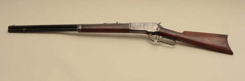 barrel, blued and case hardened finish, wood stocks, S/N 102909, in overall good to very good condition displaying considerable original blued finish on barrel and loading tube, areas of original case colors on receiver with balance gone to silver tone; very good bore, crisp action, sharp markings and good wood showing some wear, scattered mars and scratches, two screw holes in bottom of butt stock and bottom of forend near cap (likely for sling swivels) and opposite holes near the front of the forend, possibly for a leather thong or strap of some type; would benefit from careful conservation to noted wood issues given the overall condition and desirability of caliber. (Antique). Est.: $1,500-$3,000.