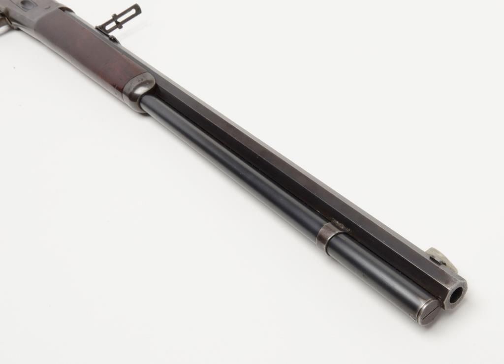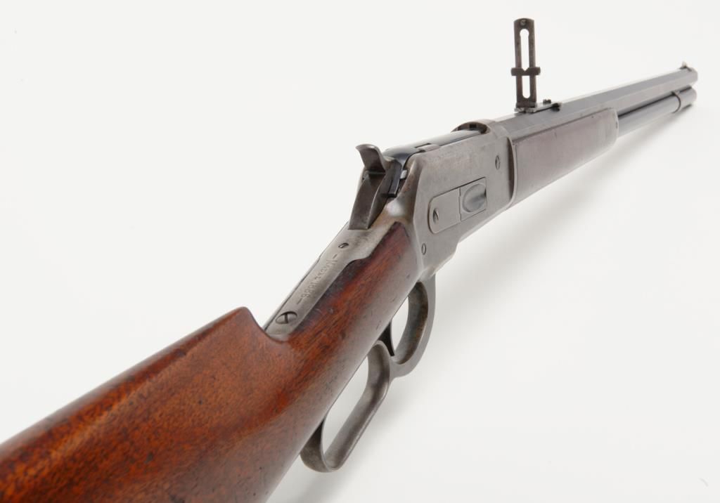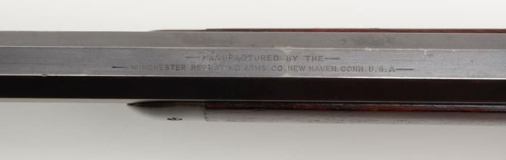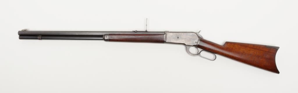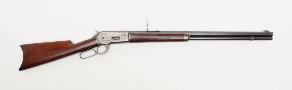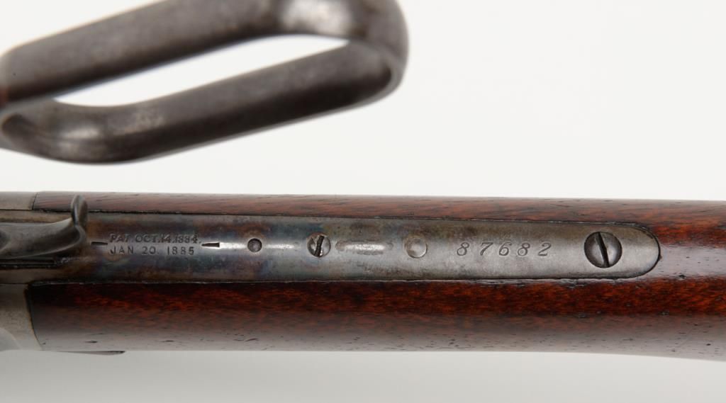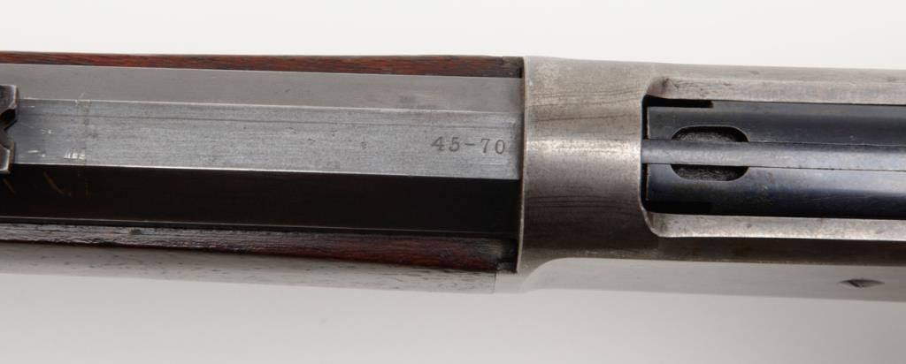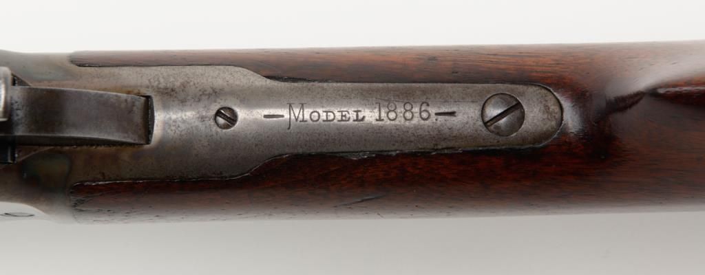 Winchester Model 1886 lever action rifle, desirable .45-70 cal., 26” octagon barrel, blue and case hardened finish, wood stocks, #87682 in overall very good to near fine condition showing the majority of its muted original blue finish onthe barrel and loading tube with some scattered spots of erosion and scratches from storage; considerable original muted case colors with balance gone to silvery toning; crisp action, sharp markings and very good + bore; very good +wood stocks with scattered minor old mars and scratches from carry and storage, replaced front sight blade. From an old Texas collection. (Antique). Est.: $3,000-$6,000.