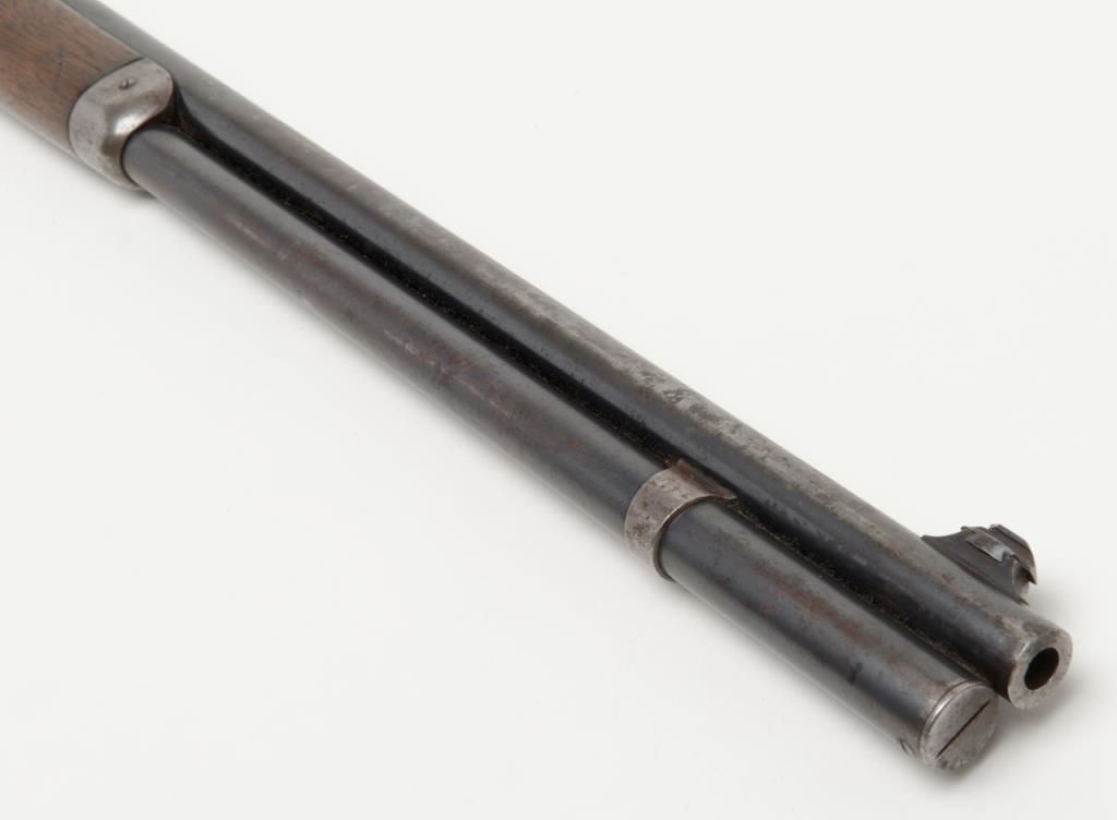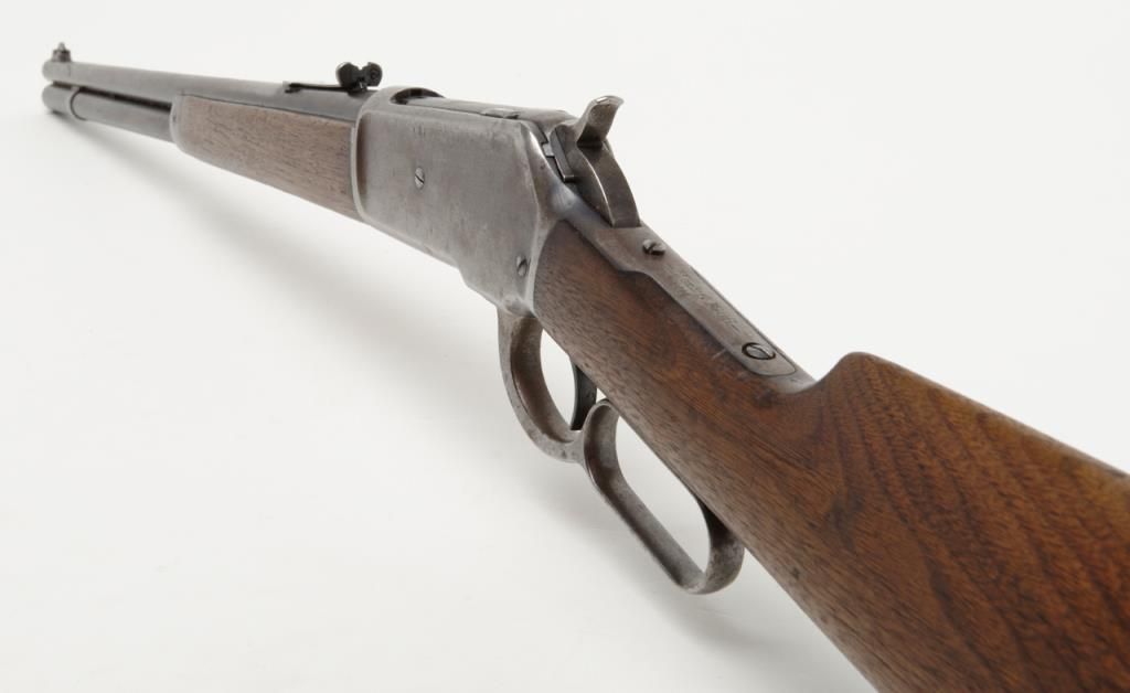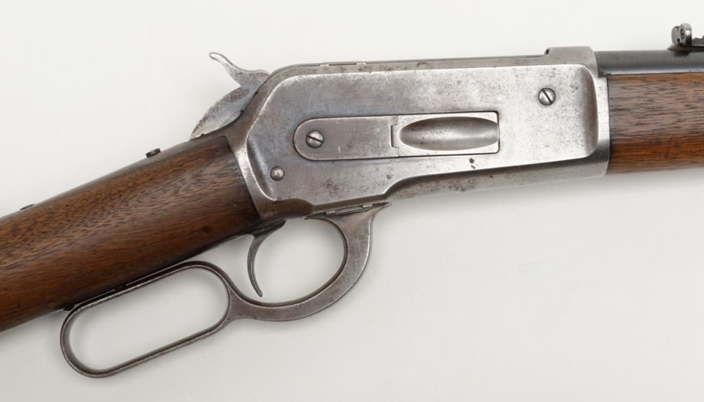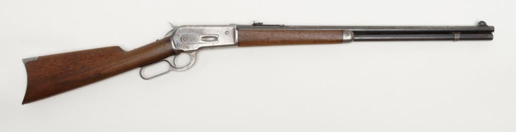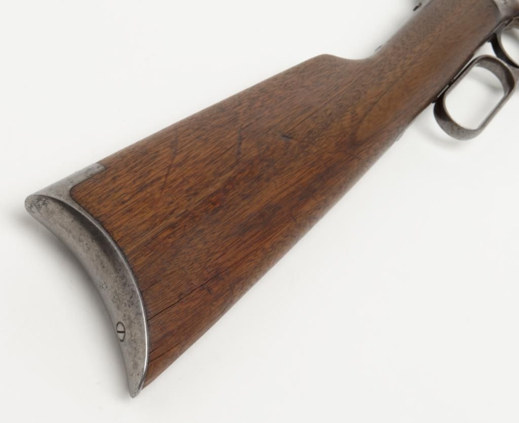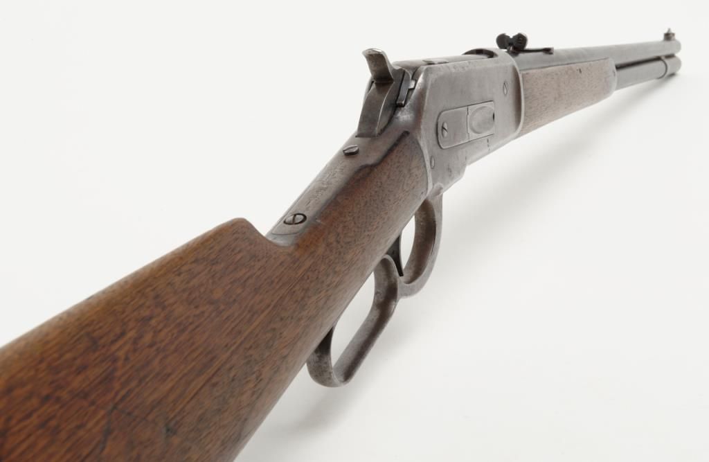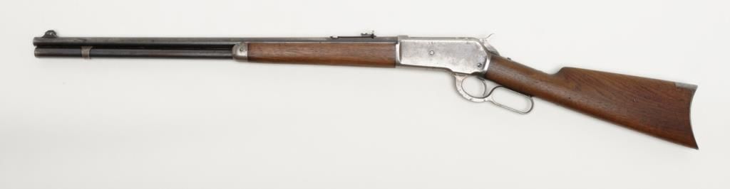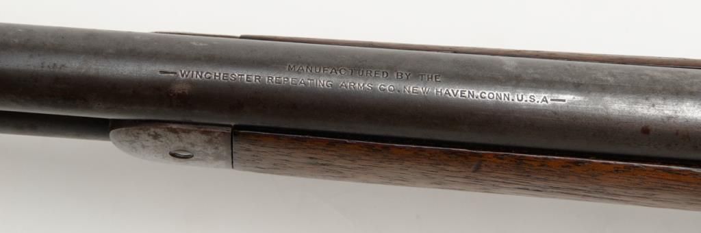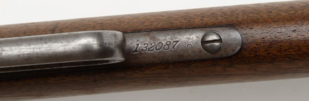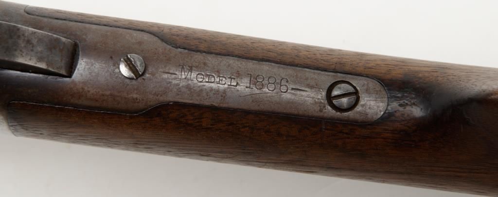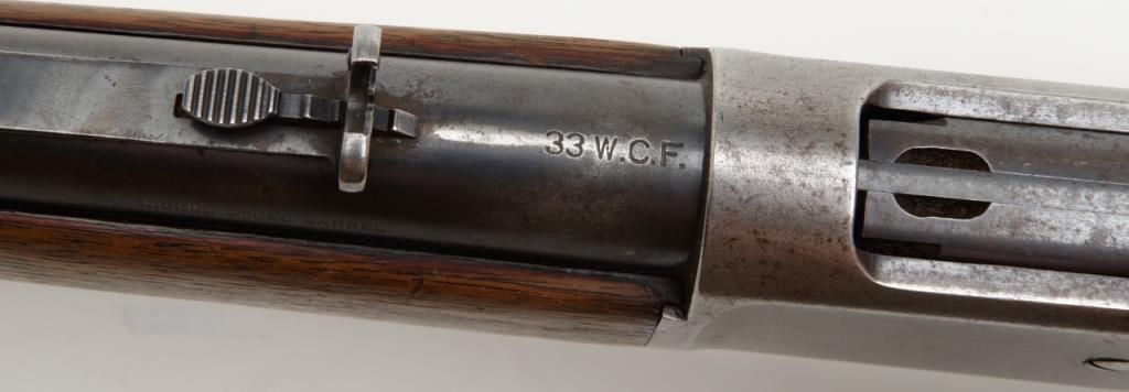 Winchester Model 1886 lever action rifle in .33 WCF caliber showing 24” rapid taper barrel, full magazine, with rifle butt, solid frame, serial number 132087. The barrel and magazine tube show 30% to 50% original blue drifting to a gray brownpatina with some scattered light to moderate erosion and pitting just starting. The barrel address is very sharp as is the caliber marking. The sights are in their correct positions. The frame shows 10% to 20% original blue. The hammerand lever show traces of case hardening going to gray. The stocks are good with some light cleaning with steel wool but very good wood to metal fit and just normal aging. The action is tight and works well. The bore is at least good and lookslike it will clean nicely. .33 caliber rifles are not often seen in this configuration. Est.: $1800-$3600