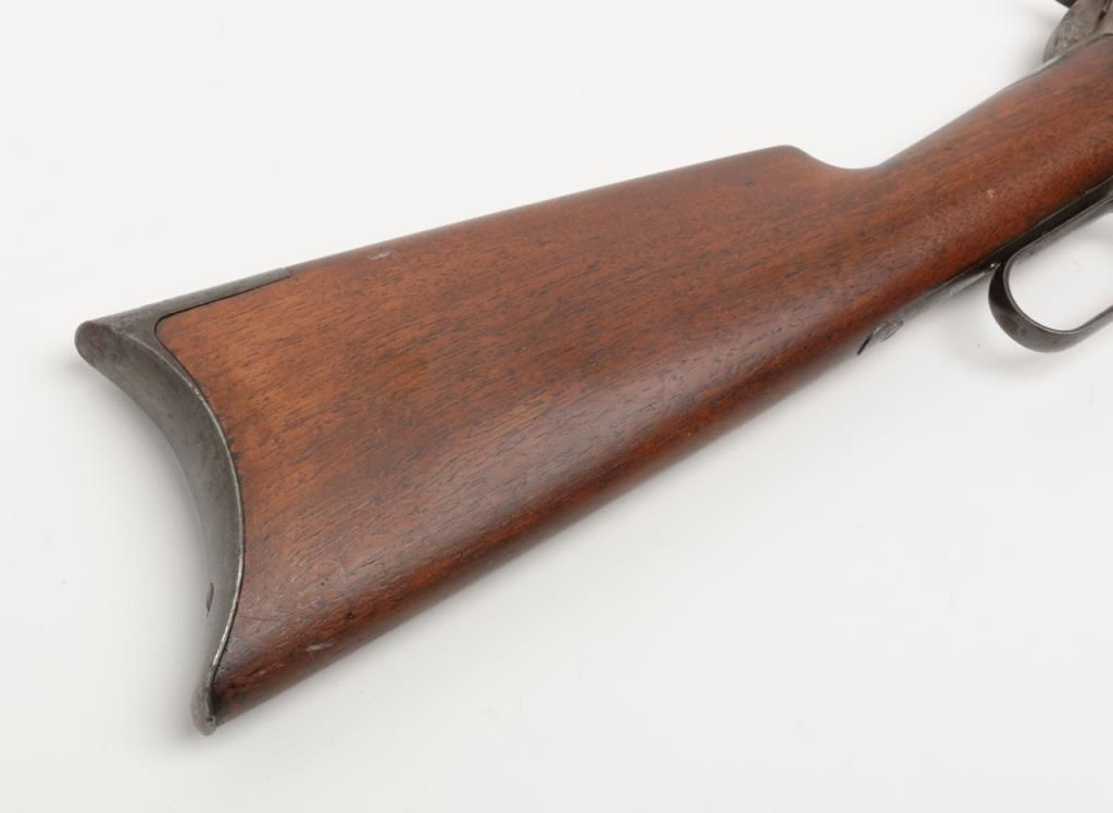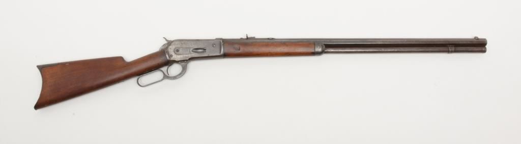 Winchester Model 1886 lever action rifle in .40-82 caliber with 28” octagon barrel, full magazine, crescent butt, serial number 37222. This rifle remains in original good to very good condition showing 10%- 30% original blue and case hardeningmixed in with a browning to gray patina. The barrel shows some nicks, mars, scratches and there has been an extra sight dovetail filled in ahead of the caliber marking on the barrel long ago and not unsightly. There are some large nicks anddents on the barrel. The stocks show some small losses and one large compression in the right side of the fore end about the size of a thumb. Also some other minor stock imperfections but at least good overall. The barrel address and markings aresharp and legible. The action is good, the bore is fair to good with some slight roughness that may clean. William A. Gary collection consigned by his estate. Est.: $1500-$3000