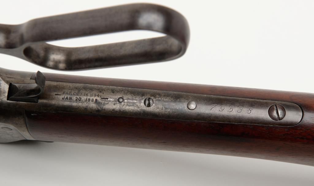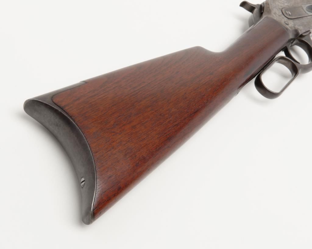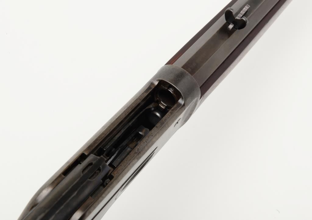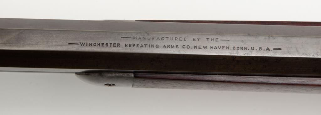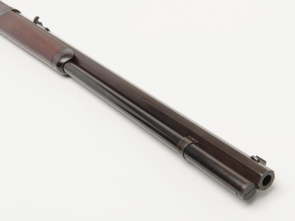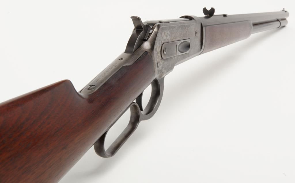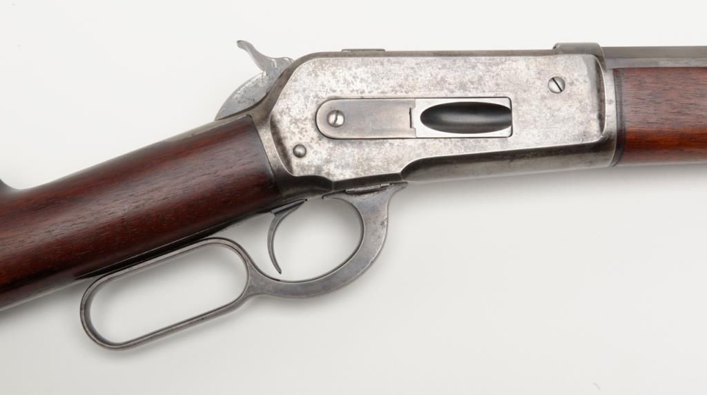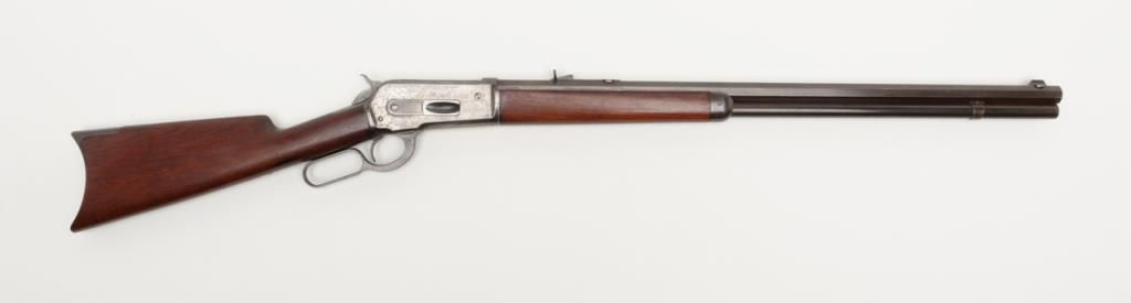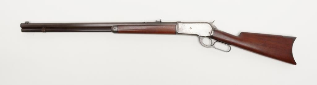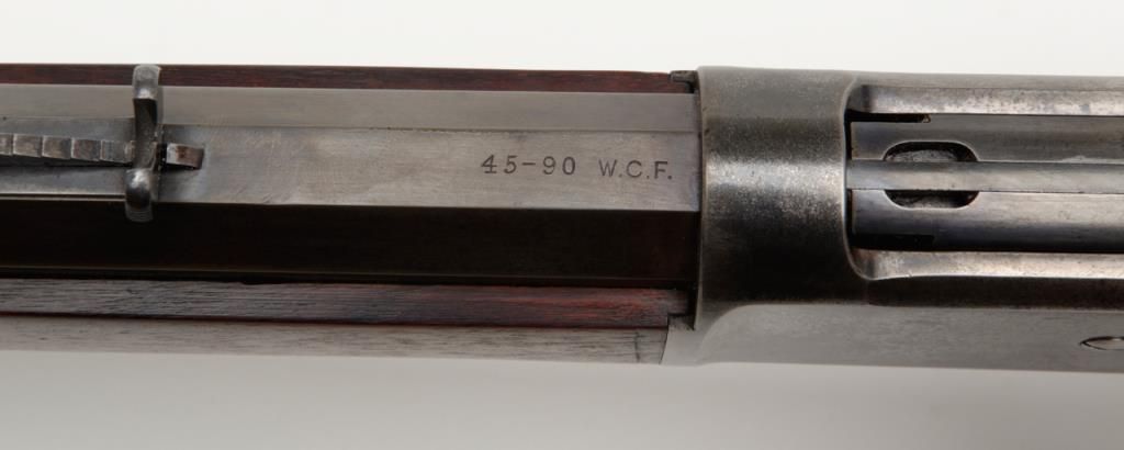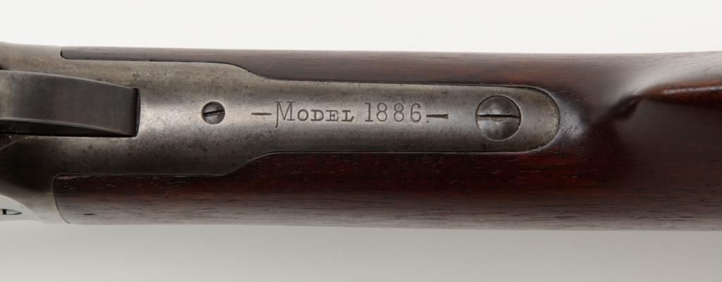 Winchester Model 1886 lever action rifle in desirable .45-90 W.C.F. cal., 26” octagon barrel, blue and case hardened finish, wood stocks, #79538 in overall very good + condition showing considerable original finish, crisp action, bright bore, very good markings, near fine wood butt stock and forend, Lyman red bead front sight, standard adjustable rear sight; a well-cared for ’86 with factory letter confirming caliber, plain trigger and barrel type, received in warehouse onJune 10, 1893 and shipped on December 16, 1893 to order #6441 (how about finding this wrapped under the Christmas tree in 1893 . . . thank you Santa!). (Antique). Est.: $2,000-$4,000.