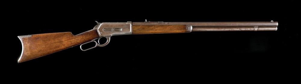 26” octagon barrel, .45-65 cal, rifling good with some light pitting, corners sharp, smooth silver gray frame, mottled silver to brown barrel tube and forend cap. Excellent+ wood with minor dings, original sights, S/N 35748.