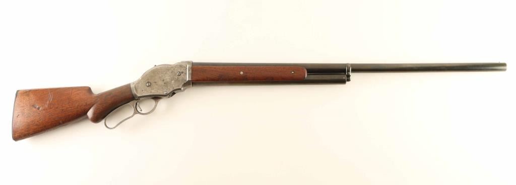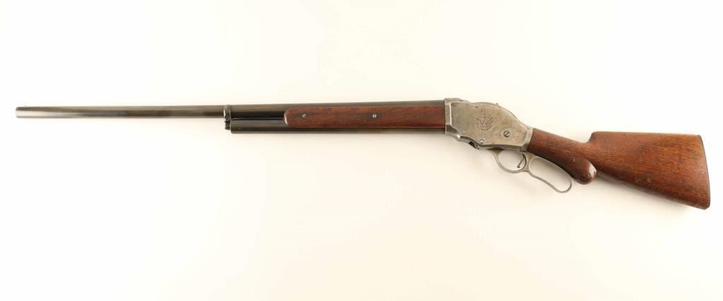 Shotgun, Lever-action. American made shotgun designed by John Browning. Produced 1893. Blued barrel, and magazine. Case-hardened receiver, and lever. 30" barrel. Bore appears excellent/bright, but a little dirty. Front bead. 5 Rd tubular magazine. barrel appears to have old re-blue. Black plastic butt plate is a newer replacement. Receiver, and lever have very faint traces of the case hardened colors. Some spots of rust/pitting present. Wood is decent shape with scratches/dings. Action is smooth. This shotgun was manufactured in 1892. This model was used extensively by Law Enforcement, and Stagecoach companies. NRA Condition- Good/VeryGood. Antique Firearm.